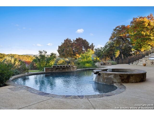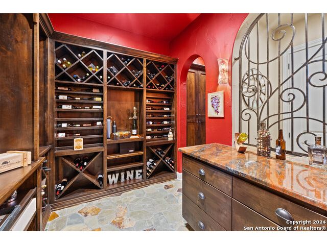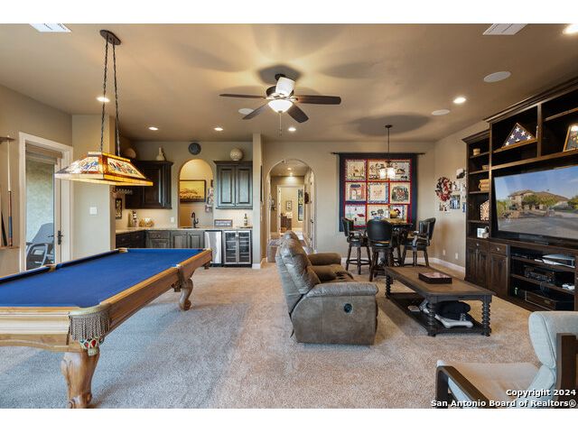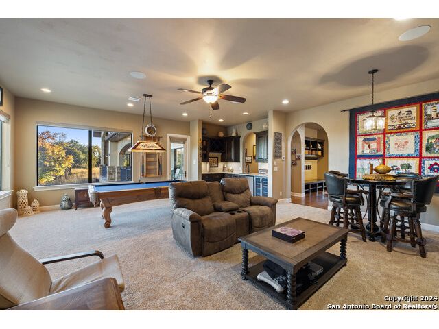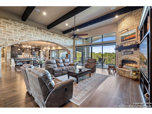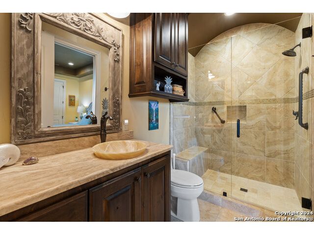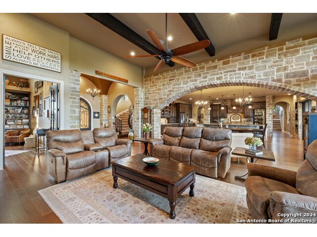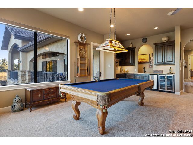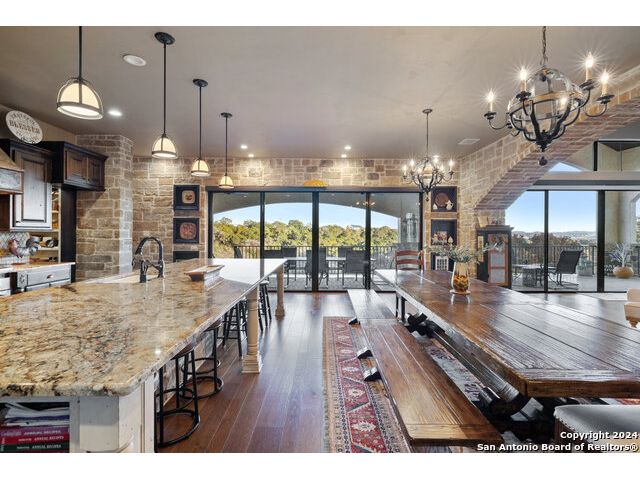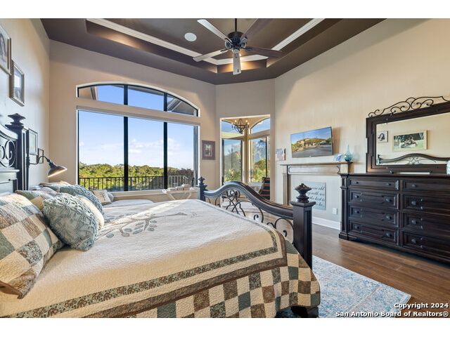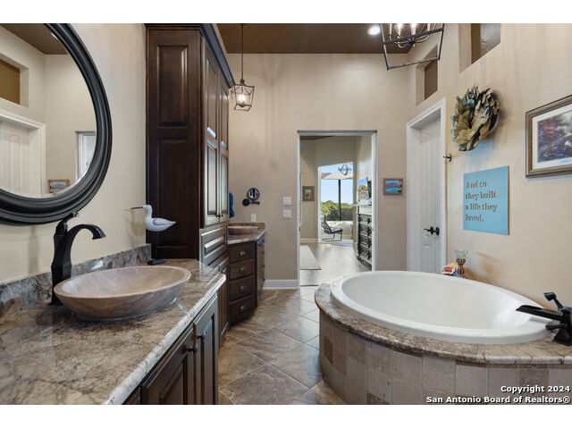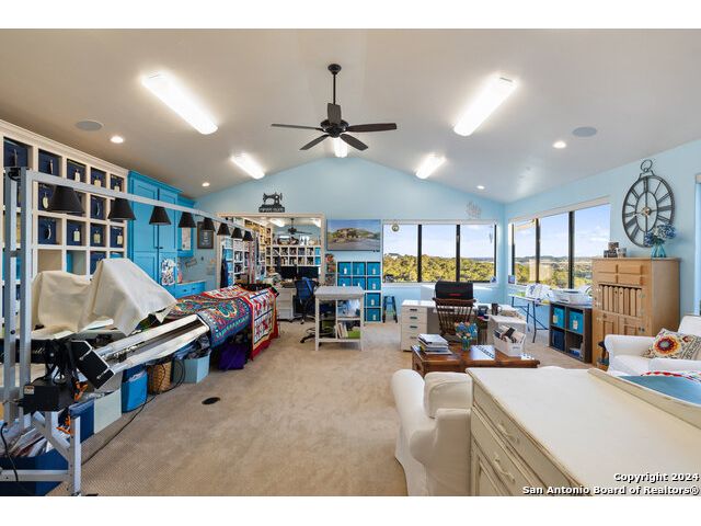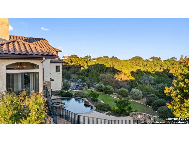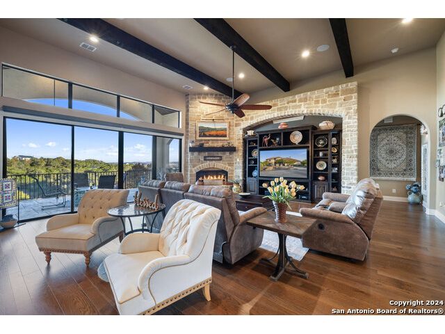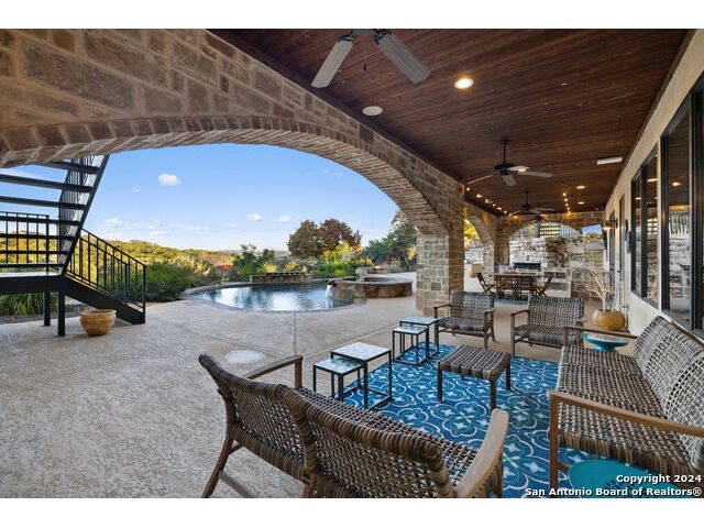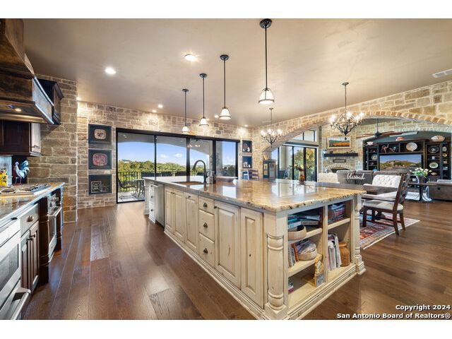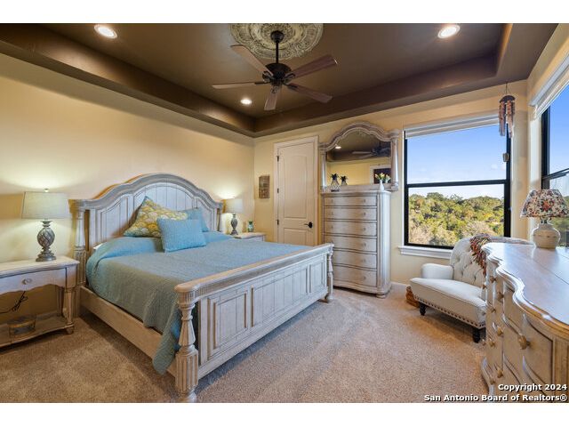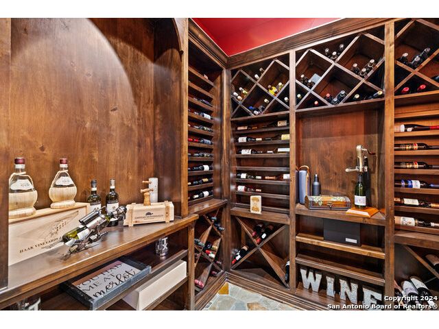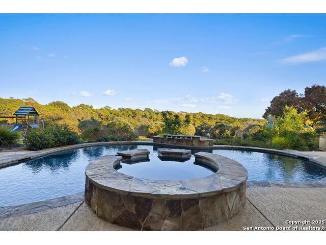 Welcome to the extraordinary Bluewater Place Estate, an exquisite masterpiece of Hill Country elegance, grandeur, and spatial magnitude, where majesty awaits around every corner of this 8000+ square foot oasis privately nestled on 3.2 acres surrounded by stunning rolling green hills and awe-inspiring lake views. This 5 bedroom, 6 bath home, meticulously crafted in 2018, incorporates all elements of the finest standard of Hill Country Living from the resort style poolscape, 4 bay epoxy floor garage, and wine grotto to the gym, library, and craft studio. Every square foot was thoughtfully designed to take in long range lake views, be aesthetically intriguing and supremely functional. The entry level features the heart of the home, an open concept gourmet kitchen and dining area, accented by ample knotty alder cabinetry and artisan backsplash, anchored by gourmet appliances, 14' granite island, coffee bar, and expansive pantry. Not to be overlooked is the grand family room, host to a fir beamed ceiling, rock fireplace, built in entertainment center and of course entry to the breezy 660+/-sf covered porch spanning the length of this great room and kitchen. The secluded primary suite is finished out with a reading nook that captures the sunrise, walk-in shower with 2 shower heads, and impressive 250+/- sf walk-in closet with center island, built in shelves, and luminous windows. The stately library is the perfect retreat for daydreaming bookworms and the studious alike. Embrace your artistic side in the bright and spacious art studio that includes an entire wall of built-in storage to keep your tools organized while the creativity flows. Host gameday from the centralized den with a TV wall, billiards, and full wet bar. Take time for yourself in the peace of a private gym while enjoying the captivating view overlooking the waterfall of the pool. Curate your own wine or spirit collection in the cavernous wine cellar. A swanky elevator navigates to all 3 levels, the epitome of luxury and convenience. Bask in the gentle hill country breeze and host family and friends from the cabana featuring a masonry outdoor kitchen next to the deep blue pool and spa. Leaving no stone unturned, the home also offers a stunning amount of storage on every level and is exemplified by the owner's "Texas Basement," an approximately 322sf of finished out heated and cooled storage room which may also serve as flex space. Truly an entertainer's delight and phenomenal Hill Country home base. Close to shopping and restaurants. 35 Minutes to New Braunfels and San Antonio. Just 45 minutes to Austin. Located on the north side of Mystic Shores, residents will enjoy access to Canyon Lake with boat ramps and lake-side parks, 2 community pools, sports courts, community boat, and RV storage, as well as nature preserves with walking and biking trails.