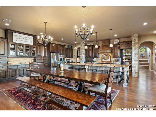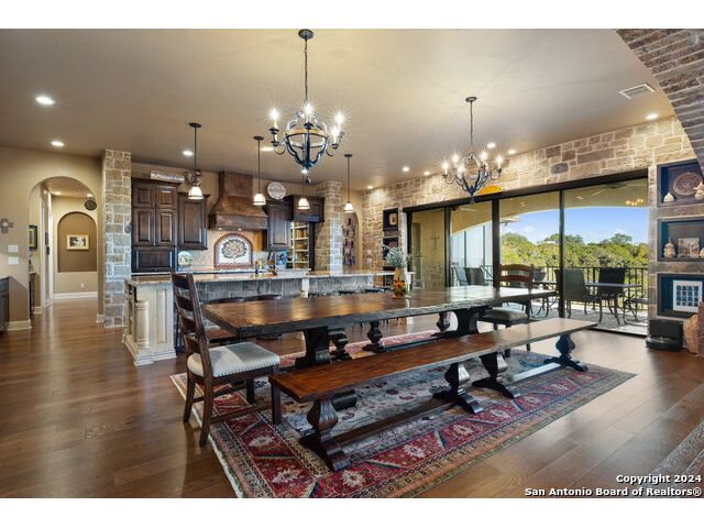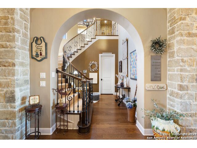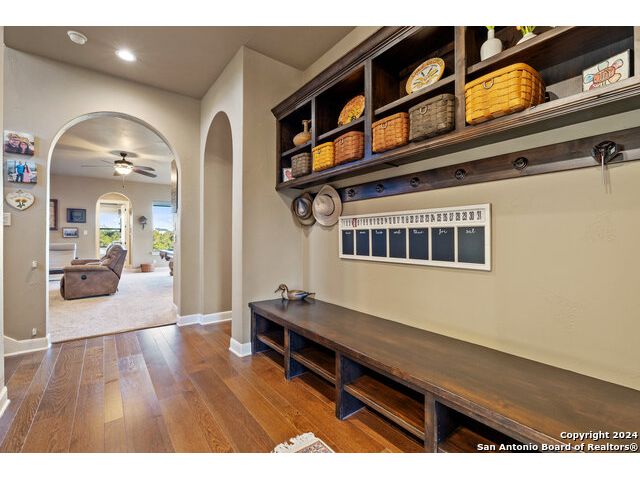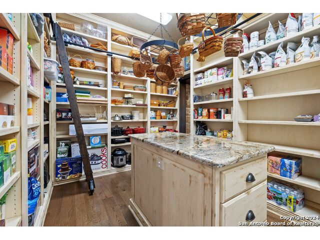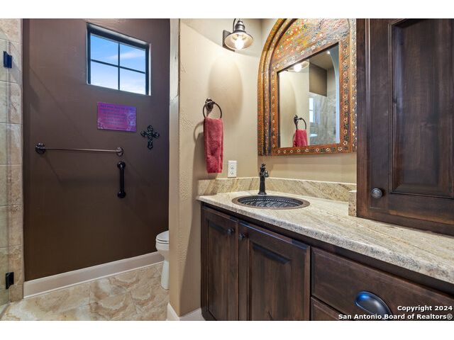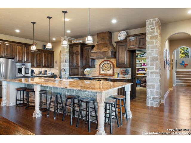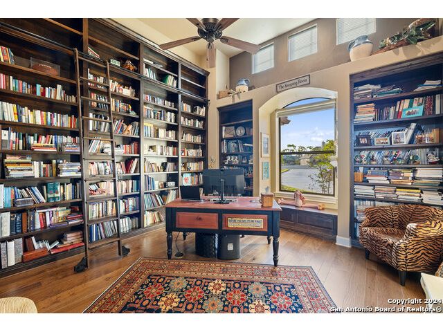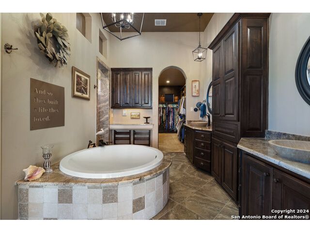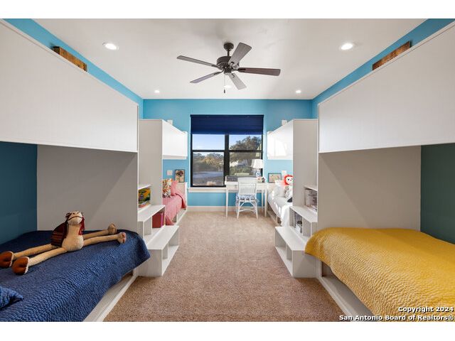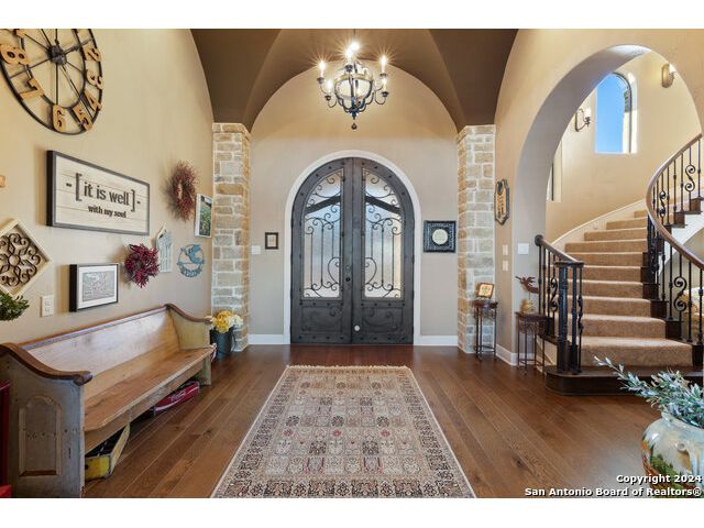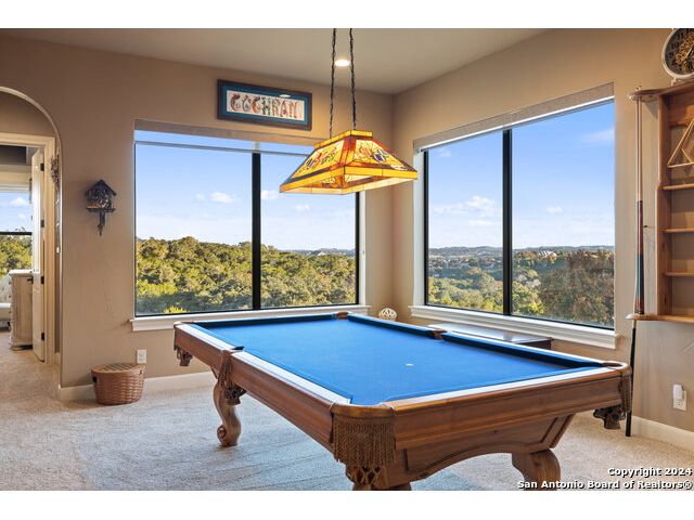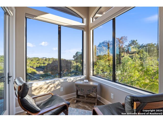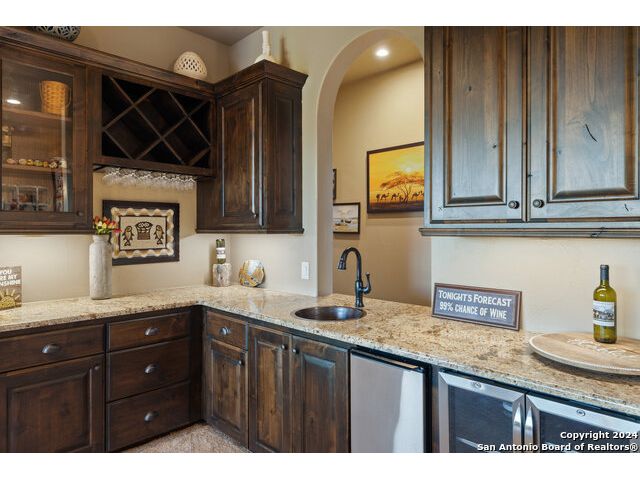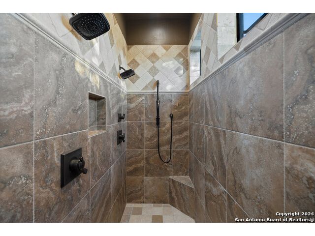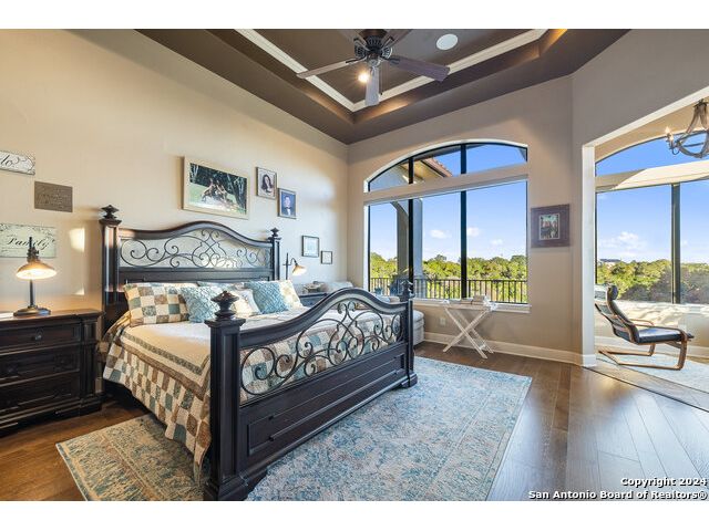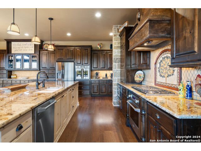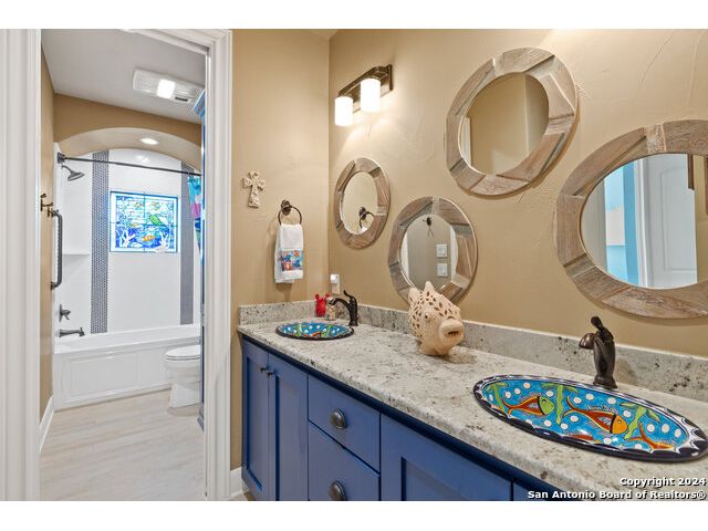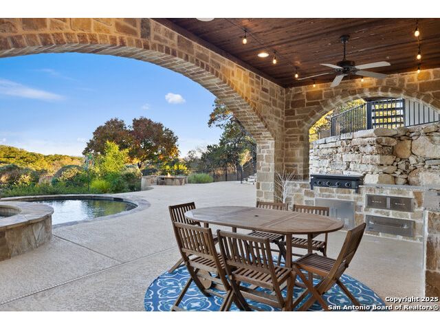 Welcome to the extraordinary Bluewater Place Estate, an exquisite masterpiece of Hill Country elegance, grandeur, and spatial magnitude, where majesty awaits around every corner of this 8000+ square foot oasis privately nestled on 3.2 acres surrounded by stunning rolling green hills and awe-inspiring lake views. This 5 bedroom, 6 bath home, meticulously crafted in 2018, incorporates all elements of the finest standard of Hill Country Living from the resort style poolscape, 4 bay epoxy floor garage, and wine grotto to the gym, library, and craft studio. Every square foot was thoughtfully designed to take in long range lake views, be aesthetically intriguing and supremely functional. The entry level features the heart of the home, an open concept gourmet kitchen and dining area, accented by ample knotty alder cabinetry and artisan backsplash, anchored by gourmet appliances, 14' granite island, coffee bar, and expansive pantry. Not to be overlooked is the grand family room, host to a fir beamed ceiling, rock fireplace, built in entertainment center and of course entry to the breezy 660+/-sf covered porch spanning the length of this great room and kitchen. The secluded primary suite is finished out with a reading nook that captures the sunrise, walk-in shower with 2 shower heads, and impressive 250+/- sf walk-in closet with center island, built in shelves, and luminous windows. The stately library is the perfect retreat for daydreaming bookworms and the studious alike. Embrace your artistic side in the bright and spacious art studio that includes an entire wall of built-in storage to keep your tools organized while the creativity flows. Host gameday from the centralized den with a TV wall, billiards, and full wet bar. Take time for yourself in the peace of a private gym while enjoying the captivating view overlooking the waterfall of the pool. Curate your own wine or spirit collection in the cavernous wine cellar. A swanky elevator navigates to all 3 levels, the epitome of luxury and convenience. Bask in the gentle hill country breeze and host family and friends from the cabana featuring a masonry outdoor kitchen next to the deep blue pool and spa. Leaving no stone unturned, the home also offers a stunning amount of storage on every level and is exemplified by the owner's "Texas Basement," an approximately 322sf of finished out heated and cooled storage room which may also serve as flex space. Truly an entertainer's delight and phenomenal Hill Country home base. Close to shopping and restaurants. 35 Minutes to New Braunfels and San Antonio. Just 45 minutes to Austin. Located on the north side of Mystic Shores, residents will enjoy access to Canyon Lake with boat ramps and lake-side parks, 2 community pools, sports courts, community boat, and RV storage, as well as nature preserves with walking and biking trails.