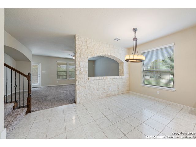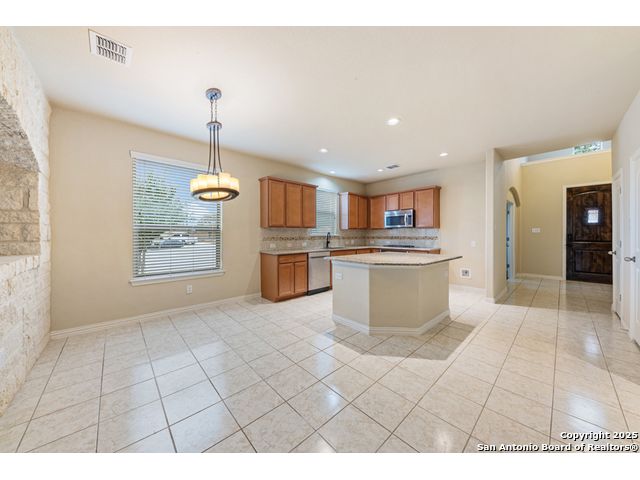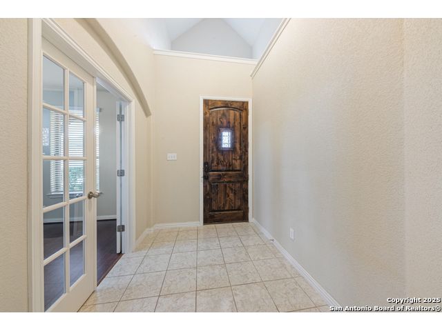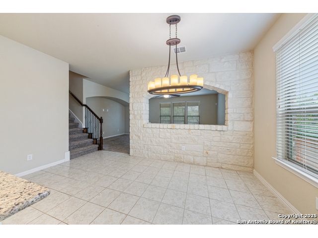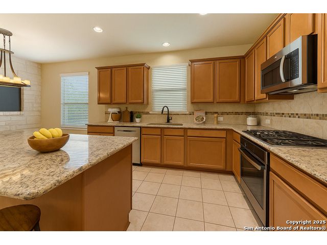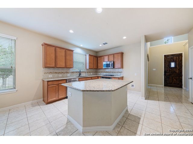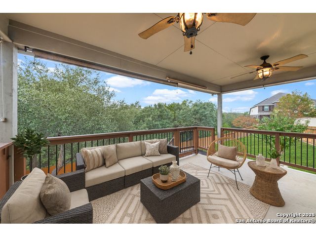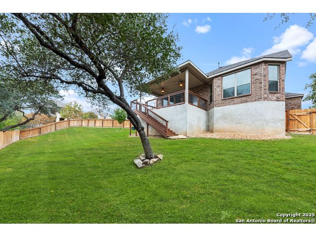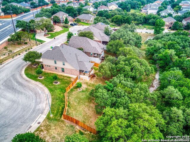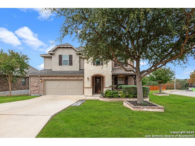 Located on an oversized 1/4-acre cul-de-sac lot, this Gehan-built home offers 4 bedrooms + game room + office-flexible and spacious with all the extras! Step onto the welcoming covered front patio and enter through a custom 8-foot door into a dramatic 2-story foyer. The dedicated office features French doors and rich hardwood floors-ideal for remote work or a quiet retreat. ~~The heart of the home is the light-filled kitchen with a massive 6x5 island offering bar seating, granite countertops, gas cooktop, and stainless steel appliances. The adjoining breakfast area fits a full-size dining table and is anchored by a modern farmhouse chandelier. A beautiful stone accent wall with an arched opening separates the dining area from the large family room, creating defined yet open spaces. ~~The downstairs primary suite boasts coffered ceilings, a bay window with backyard views, dual vanities, a soaking tub, and a tile/glass shower. ~~Upstairs, the expansive game room has space for a pool table, second living area, and homework station. Three spacious secondary bedrooms and walk-in attic access (plus pull-down stair access to a second attic) provide even more versatility. ~~A thoughtful utility room includes separate under-stair storage. The oversized 2 1/2 car garage fits 2 vehicles plus room for a workshop, golf cart, motorcycle, freezer, or extra gear. ~~Enjoy privacy and outdoor living with a covered back patio and serene wooded views-no front, back, or left-side neighbors. The massive cul-de-sac provides a safe space for outdoor play, biking, and entertaining. ~~Other features include: 4-sides brick and stone exterior ~ Full sprinkler system ~ Stone-edged landscaping beds ~ Covered front porch perfect for seasonal decor ~~Located in the desirable 78253 zip code, close to top-rated schools, parks, shopping, and dining. This rare oversized lot, flexible floor plan, and high-end finishes check all the boxes-a must-see!