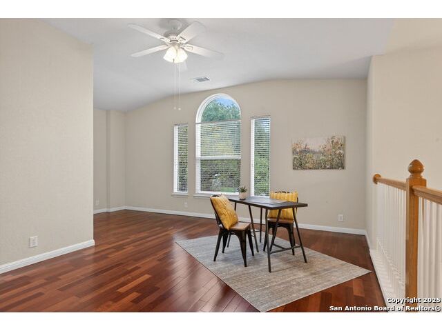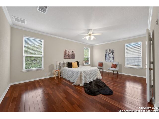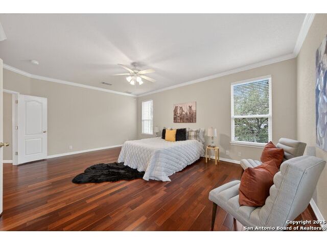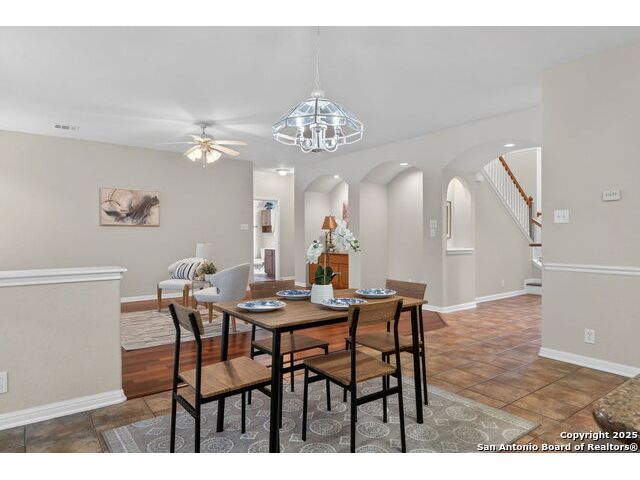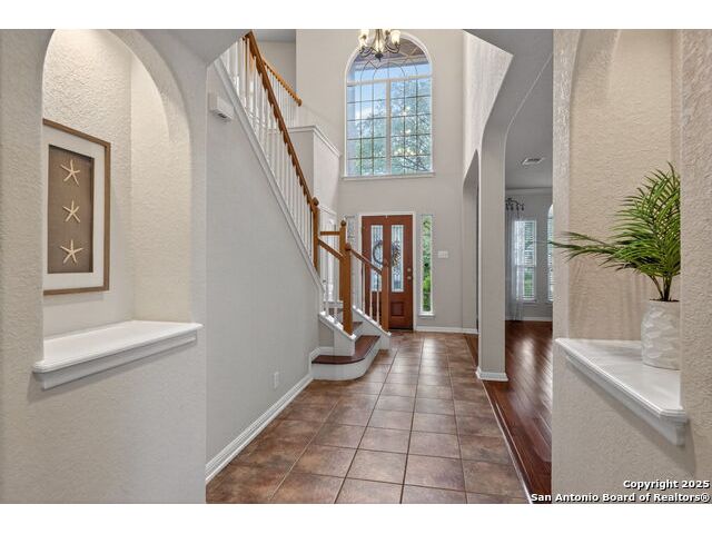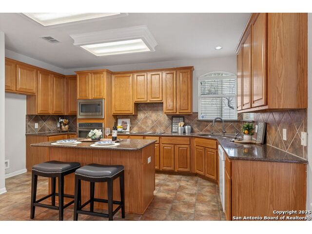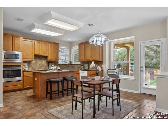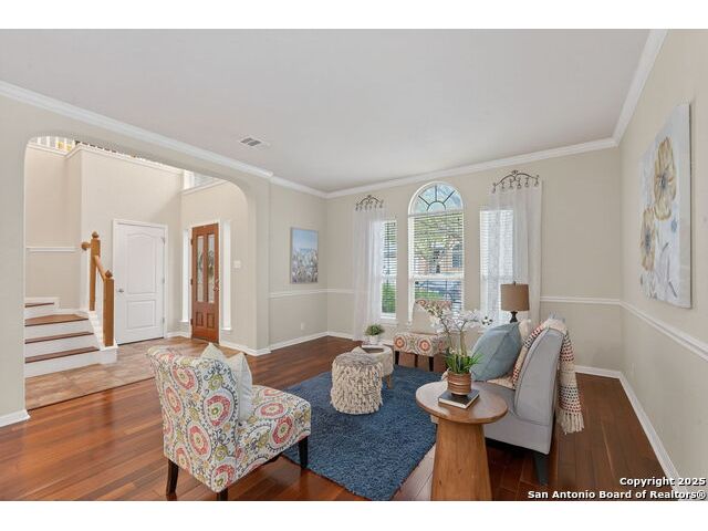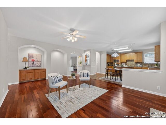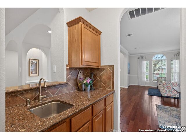 Big Home, Big Dreams. Located in Stone Oak. Welcome 2026 in a new home where new dreams begin. Step inside this home and you will discover neutral wall colors, coordinated tile, stunning wood flooring (no carpet), and high ceilings leading the eye to the second floor. Plenty of light fills the formal living room and dining room. A wet bar located next to the dining room is ideal for serving food and beverages, or the aroma from your espresso coffee bar. The kitchen features an abundance of storage with 42" cabinetry, a built-in oven/microwave, granite counters, and an oversized walk-in pantry to store food and all your gourmet or baking supplies. The kitchen island flows into a spacious family room perfect for relaxing or entertaining. Offer family or guests the convenience of a first-floor bedroom and full bath. The wood stairs lead to the second story with wood flooring, three bedrooms, a hall bathroom, and a game/media room, or space for a work-from-home office. When you are ready to rejuvenate, enter through the French doors to a generously sized primary bedroom. Create a dreamy environment with plenty of space for a sitting area to read, or refresh in your spa-like bathroom. If you desire outdoor living, enjoy your breakfast on the covered patio that opens to a large yard. Create the outdoor space as a place to relax or to entertain. Conveniently located near shopping, dining, golfing, library, and so much more. Welcome home in 2026, where your dreams are just a vision away.