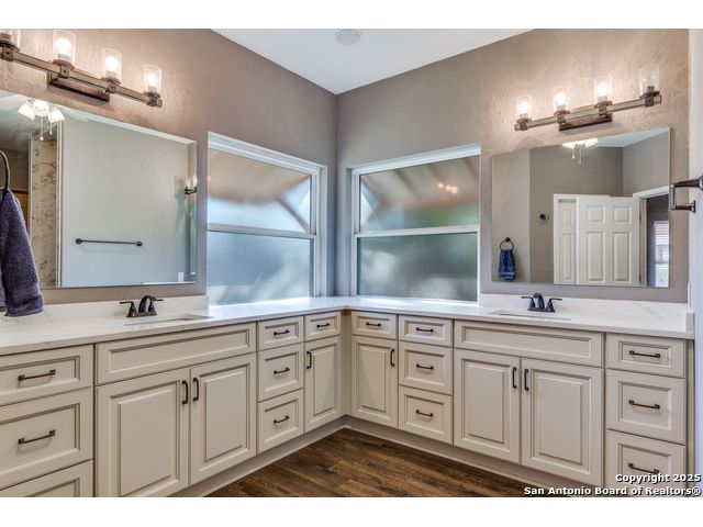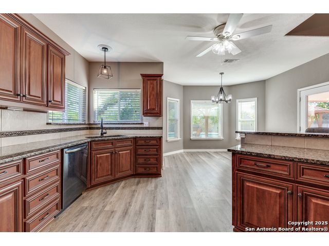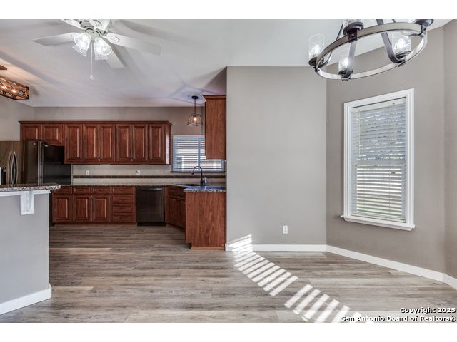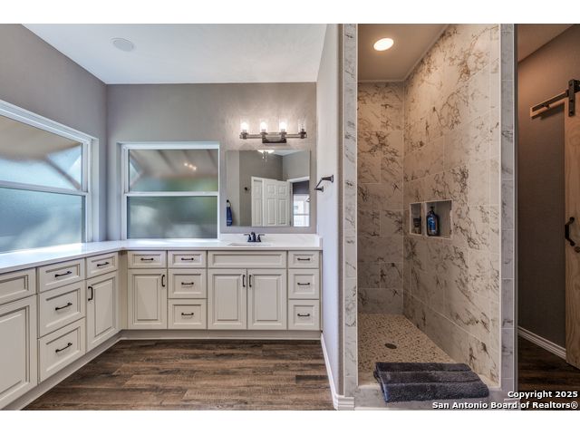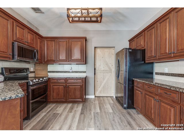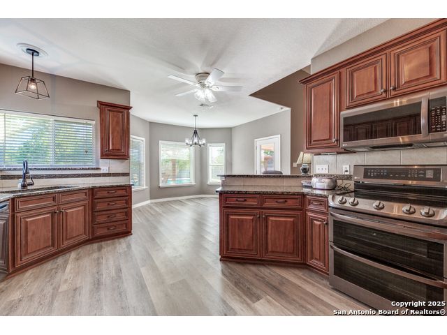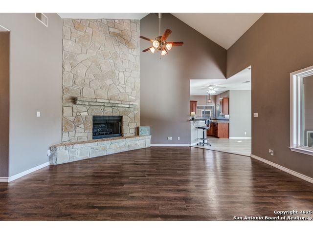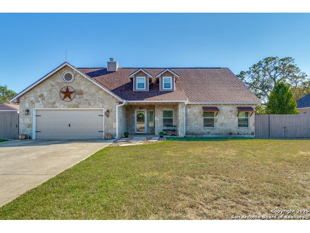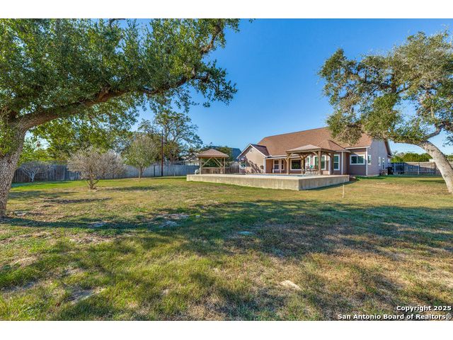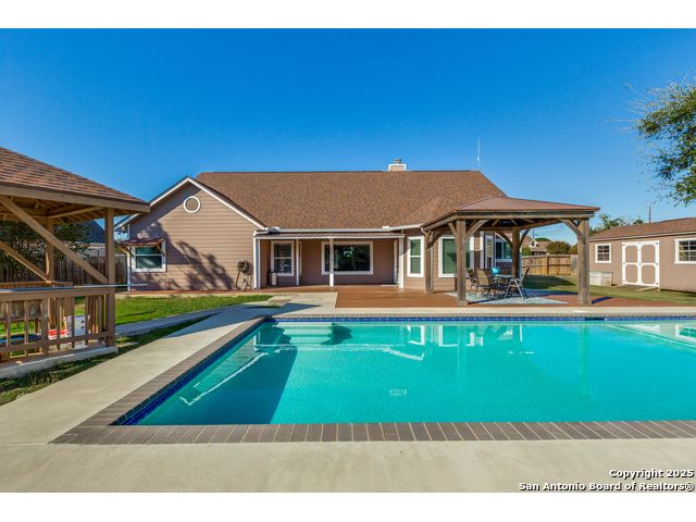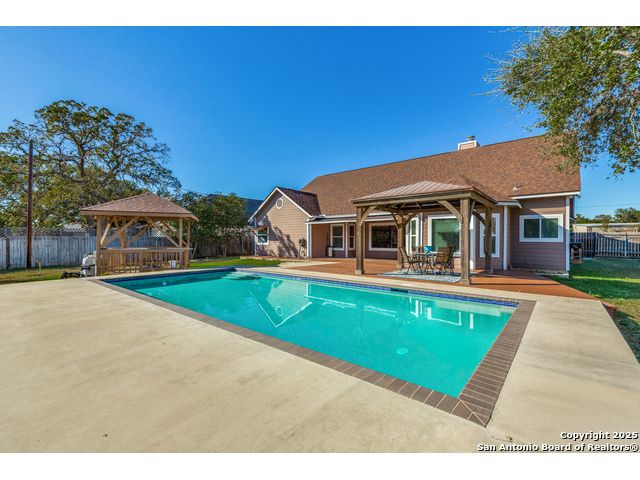 Charming Bandera Texas home with character includes recent updates and renovations with an inground pool that offers an incredible opportunity to enjoy a quietly idyllic, relaxed lifestyle. Bandera is only 3 miles away, offering multiple options for food, shopping and classic entertainment. You will enjoy the quiet pleasures of hill country living, the pool for our Texas seasons, a low tax rate & have effortless access to Boerne, Hondo, Kerrville and San Antonio. The 3/2/2 home is an incredible find - add a soaring cathedral ceiling, massive fireplace, the gourmet kitchen with granite countertops, a huge remodeled pantry and a popular open concept. The sq footage is maximized for comfort including outdoor spaces. The fully updated primary ensuite bath includes separate vanities with custom cabinets, elegant quartz countertops, a newly installed shower and individual his & hers walk-in closets. The recent low E windows and window awnings protect you from the Texas seasons & adds to the energy efficiency along with the new 14 seer HVAC, lifetime roof & luxury LVP flooring throughout the house. The private 1/2 acre lot features a privacy fenced back yard, a spacious outdoor area for year round entertainment that's connected to 2 separate gazebos, a large deck alongside a sparkling, inground pool, a large covered patio, and the oversized garage. RV parking, complete with a 50 amp hook-up, is allowed behind the privacy fence.