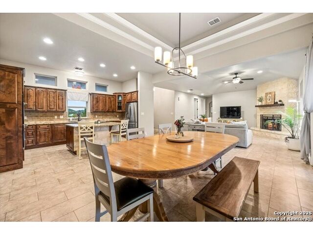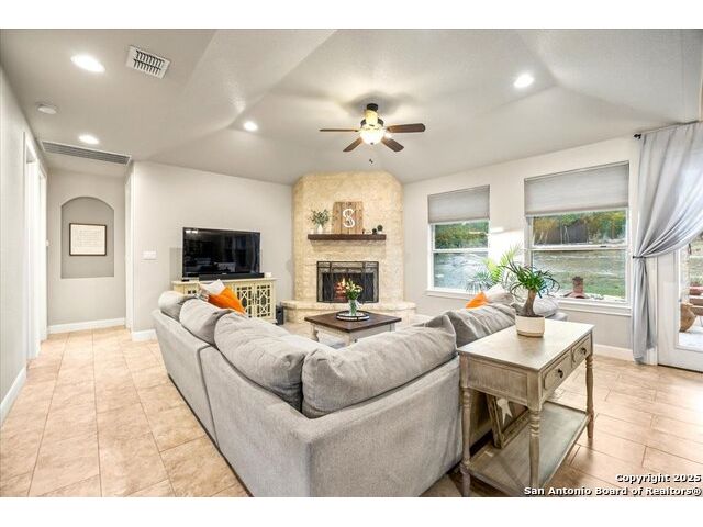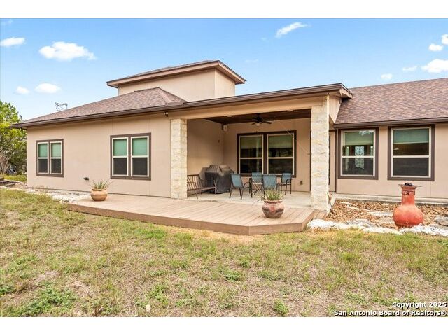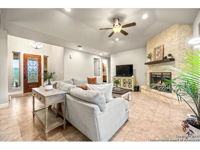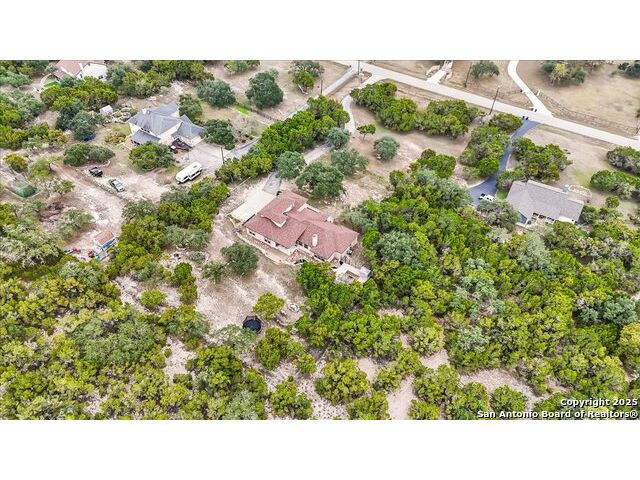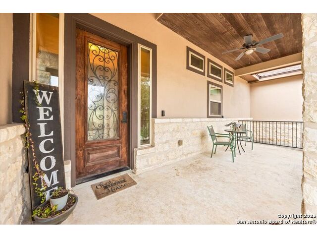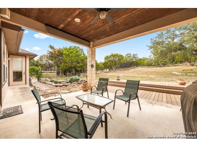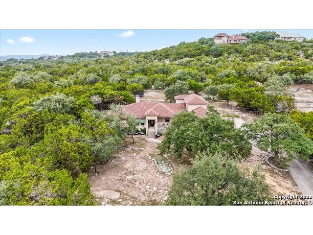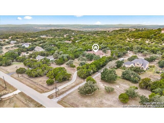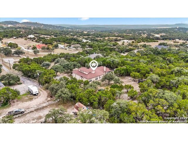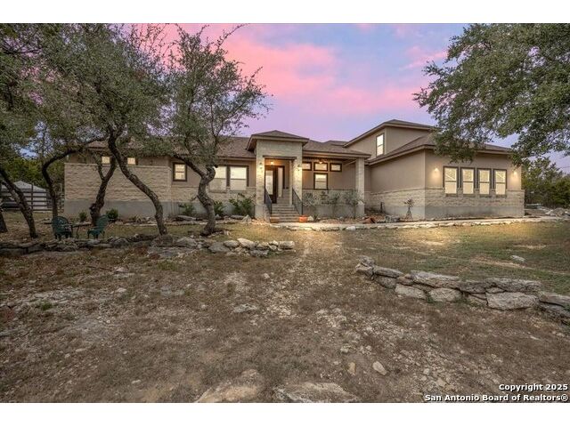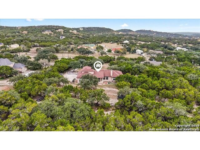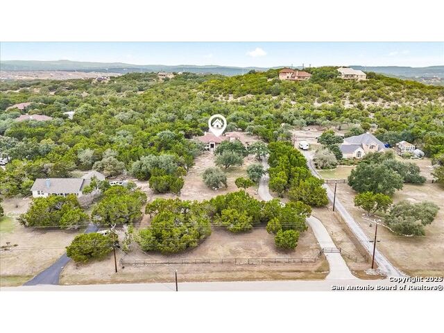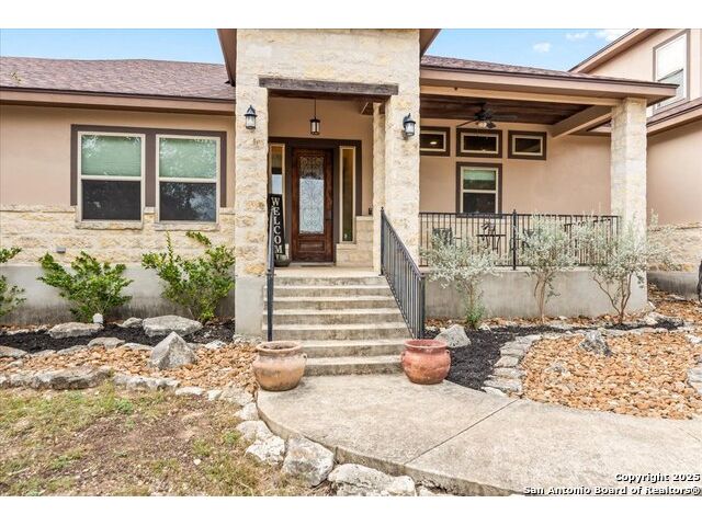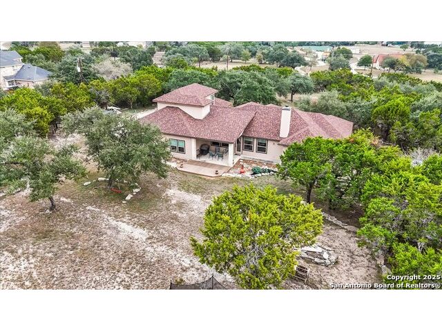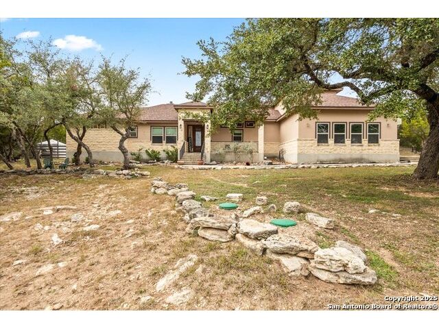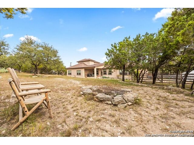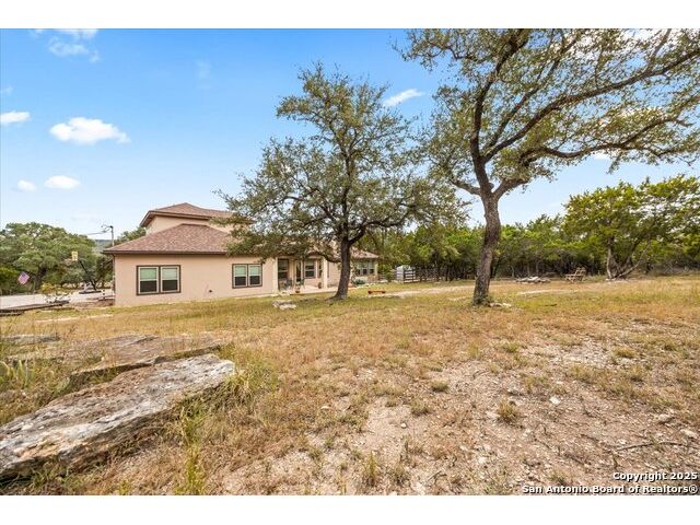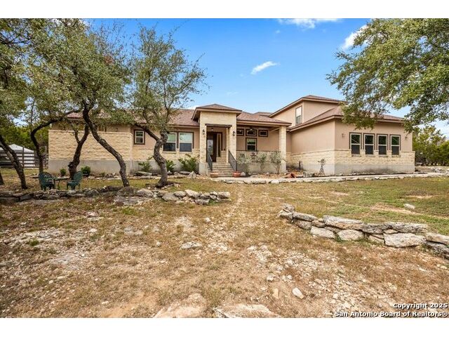 Nestled in the tranquil country setting of Bulverde's Rim Rock Ranch, 31720 Retama Ridge offers a secluded retreat on fully fenced 2 acres with automatic gates, mature trees, and wide-open views. This inviting 4-bedroom, 3.5-bath home features an open floor plan anchored by a stunning floor-to-ceiling stone corner fireplace, a dedicated office (currently used as an additional bedroom), and a luxurious primary suite with outdoor access, two walk-in closets, and a spa-inspired bath with a walk-in shower and soaking garden tub. All living spaces and 3 bedrooms are conveniently located on the first floor. The upstairs large private guest suite -- complete with a wet bar-also makes an ideal game room. Enjoy scenic views from the front porch and study, or relax out back on the covered porch with extended decking perfect for outdoor dining and gatherings. The property also includes a fenced garden area with raised beds. Access to Rim Rock Ranch amenities include hiking and walking trails, tennis and basketball courts, and a neighborhood park and playground. With easy access to FM 1863, Hwy 281, Canyon Lake, and the Guadalupe River, this home blends Hill Country serenity with everyday convenience.