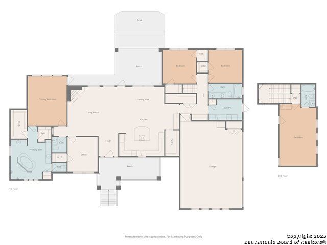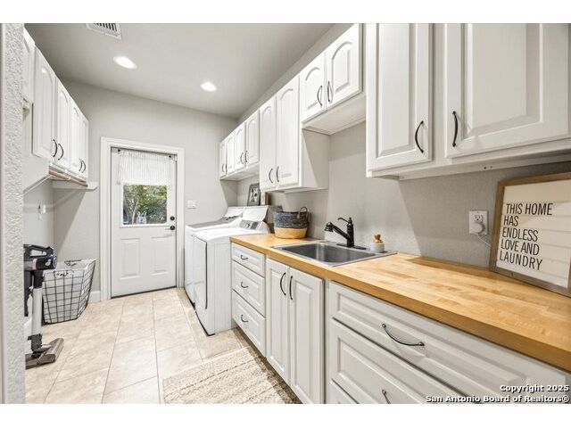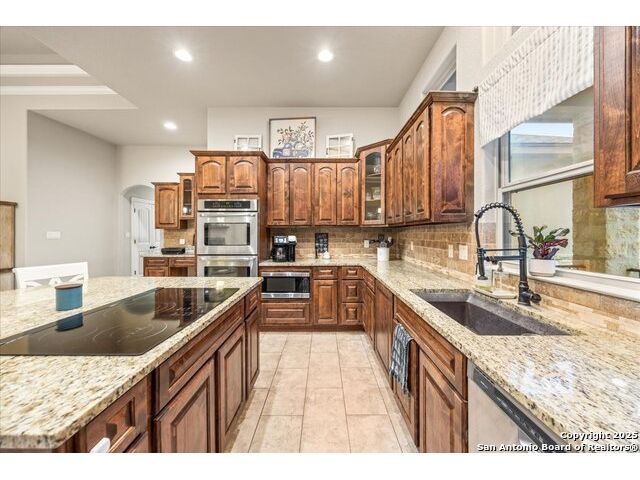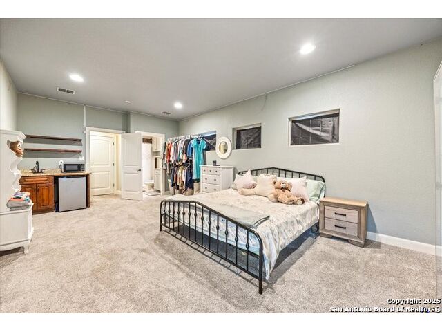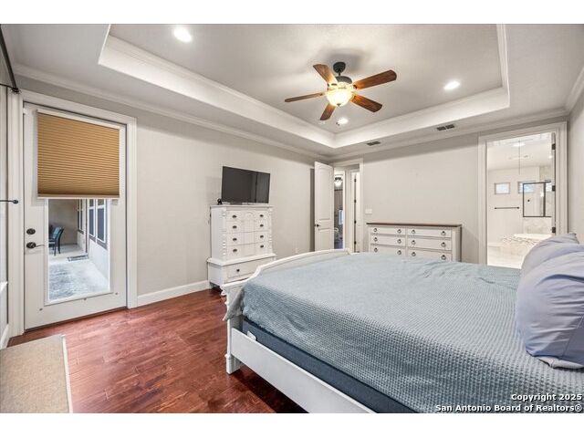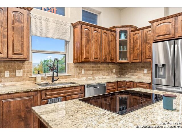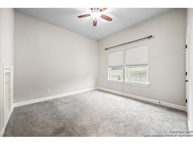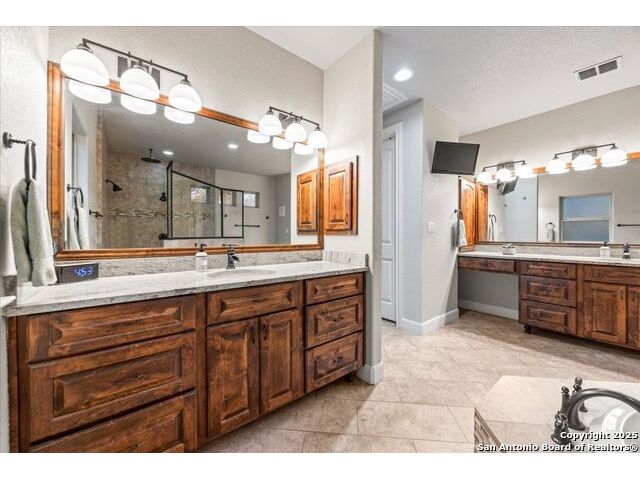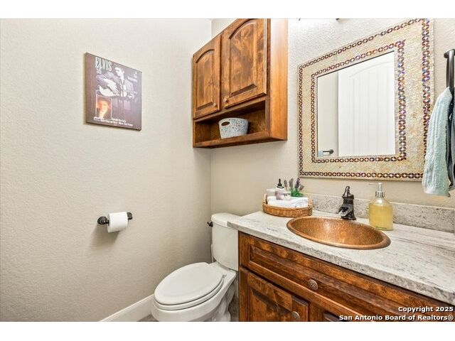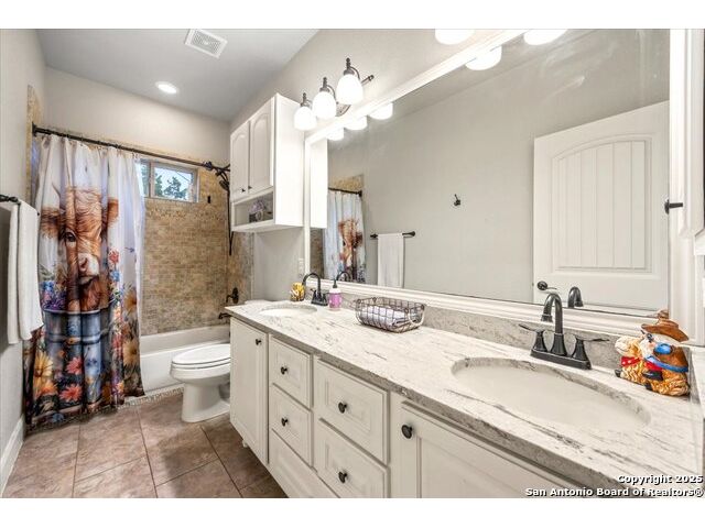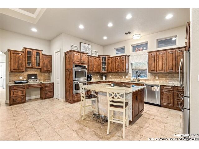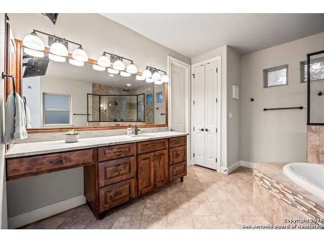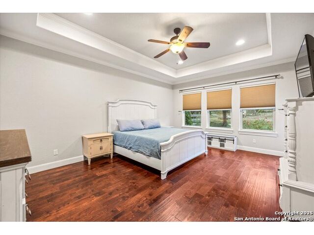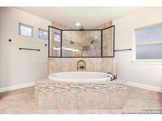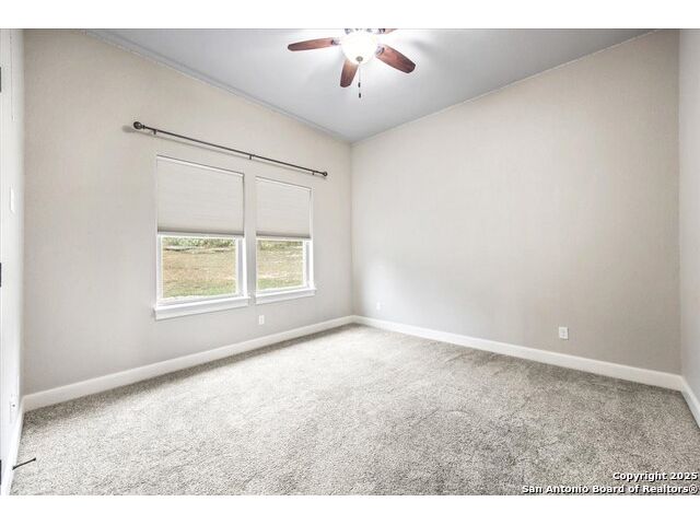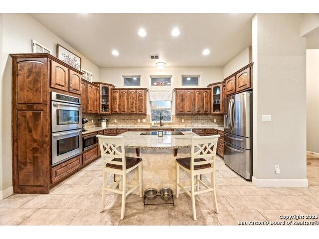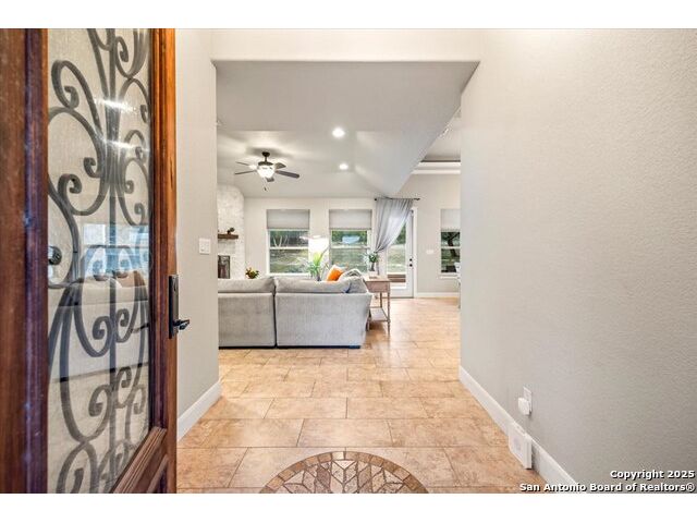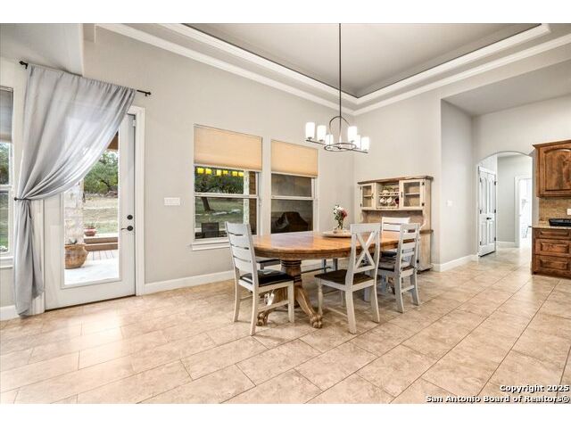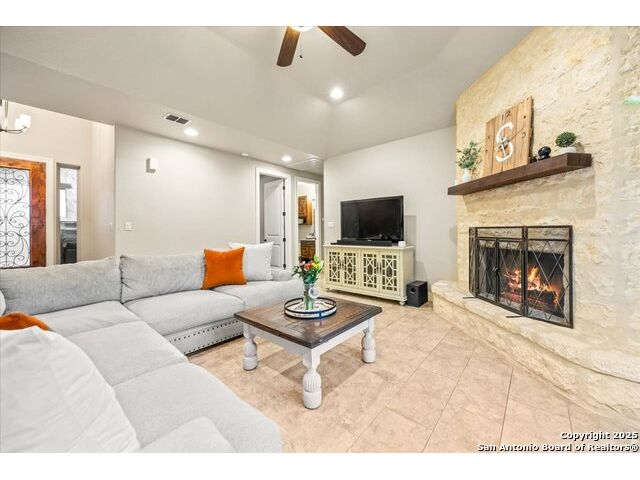 Nestled in the tranquil country setting of Bulverde's Rim Rock Ranch, 31720 Retama Ridge offers a secluded retreat on fully fenced 2 acres with automatic gates, mature trees, and wide-open views. This inviting 4-bedroom, 3.5-bath home features an open floor plan anchored by a stunning floor-to-ceiling stone corner fireplace, a dedicated office (currently used as an additional bedroom), and a luxurious primary suite with outdoor access, two walk-in closets, and a spa-inspired bath with a walk-in shower and soaking garden tub. All living spaces and 3 bedrooms are conveniently located on the first floor. The upstairs large private guest suite -- complete with a wet bar-also makes an ideal game room. Enjoy scenic views from the front porch and study, or relax out back on the covered porch with extended decking perfect for outdoor dining and gatherings. The property also includes a fenced garden area with raised beds. Access to Rim Rock Ranch amenities include hiking and walking trails, tennis and basketball courts, and a neighborhood park and playground. With easy access to FM 1863, Hwy 281, Canyon Lake, and the Guadalupe River, this home blends Hill Country serenity with everyday convenience.