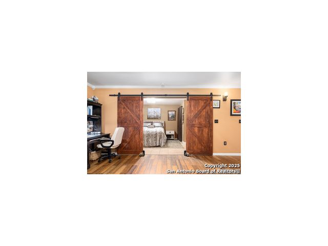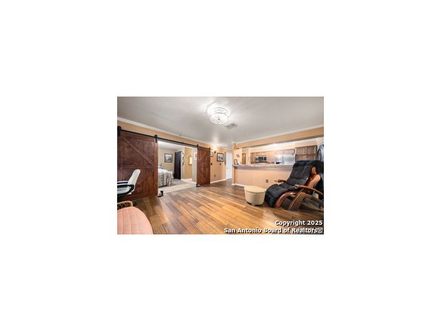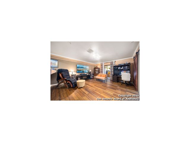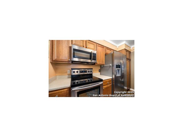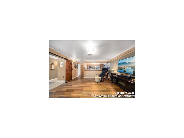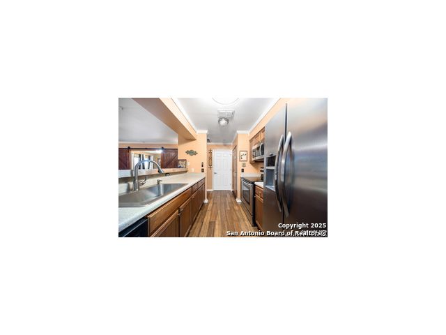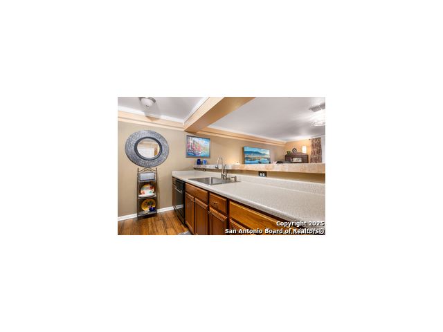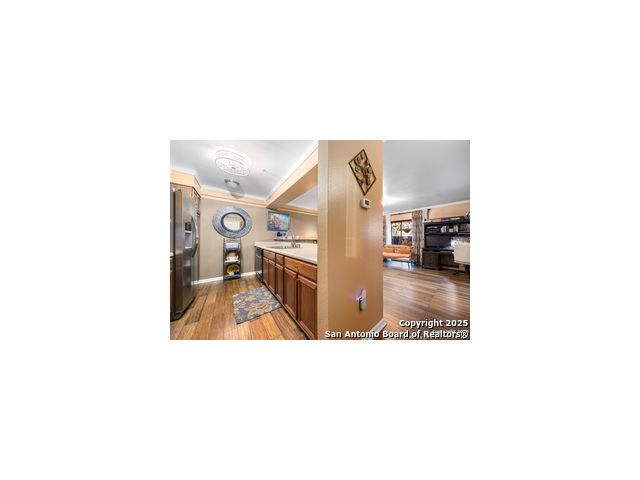 This inviting 1-bedroom 1 bath unit in Castlewood Condos offers a quiet setting in the heart of the medical district. The secure building and convenient first-floor location make everyday living easy, with quick access to I-10, 410, 1604. Shopping, downtown, and the airport are all within a short drive. The open floor plan features wood flooring, crown molding, and barn doors that provide a stylish way to separate the living area from the bedroom. Ceiling fans in the kitchen, living room, bedroom, and patio help keep the space comfortable. All appliances are included in the sale, including the washer, dryer, 75 inch flat screen TV and soundbar. The covered back porch offers added privacy thanks to the fenced-in design. Don't miss out on this opportunity, book your personal tour today!