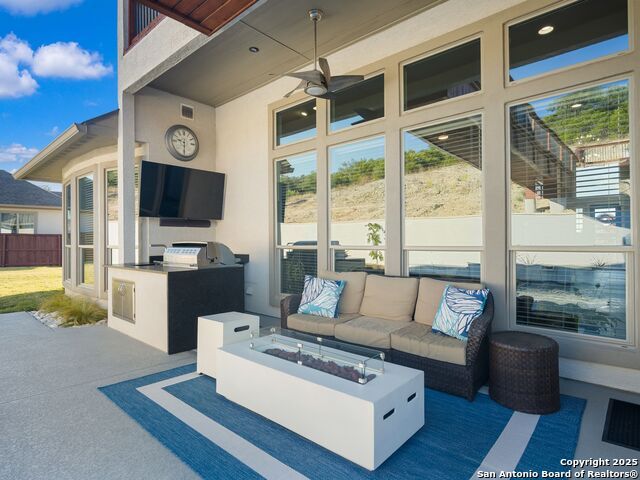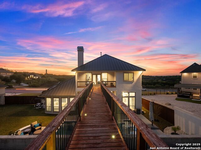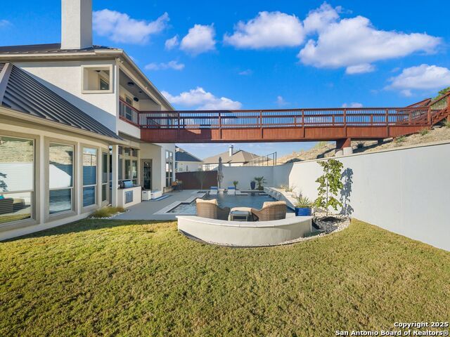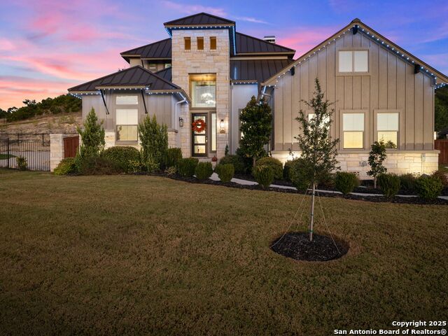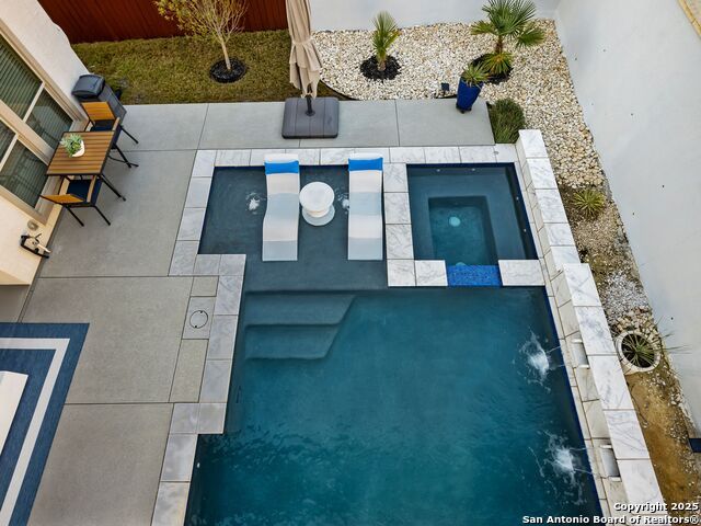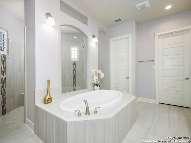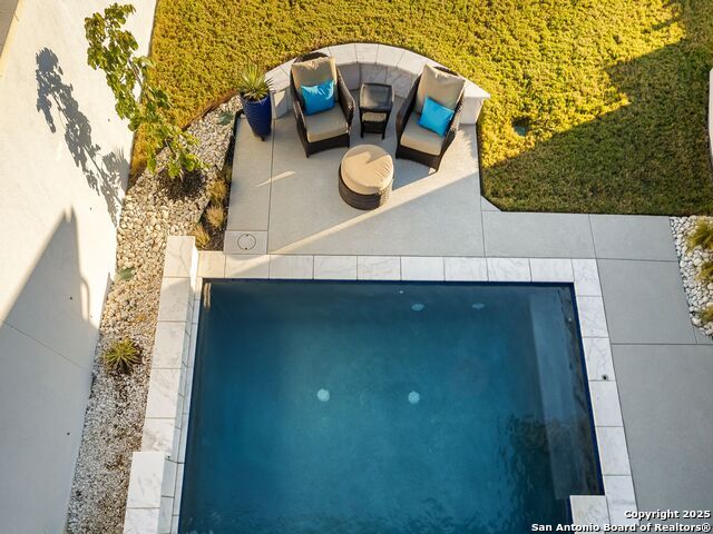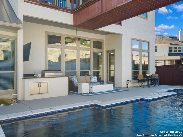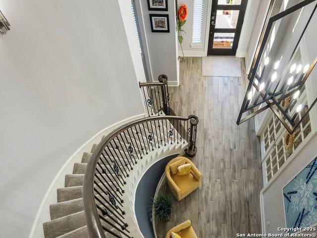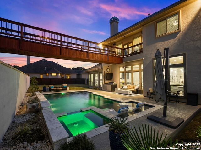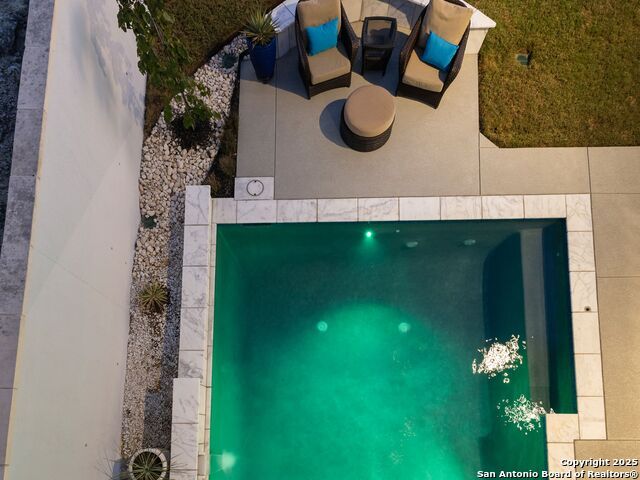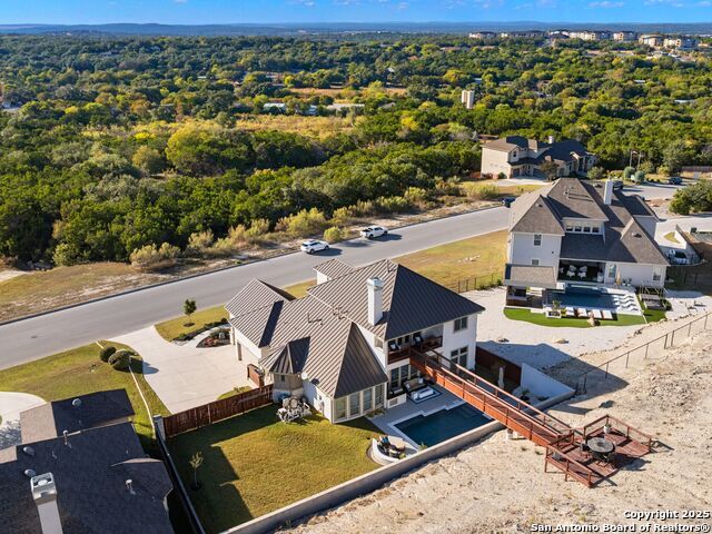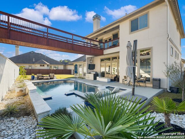 Exquisitely designed, this estate offers a seamless layout that balances luxury and comfort in the heart of Highland Estates. Quality is evident throughout with wood like tile floors, designer accent paint, custom ceiling treatments, and upgraded lighting. The chef's kitchen includes stainless steel appliances, a gas cooktop, double ovens, and generous barstool seating at the breakfast bar. It opens to a warm and inviting family room anchored by a stacked stone fireplace with views of the outdoor retreat. The primary suite features a spa inspired bathroom with a double sided walk in shower, a garden tub, and an expansive walk in closet. A guest bedroom is located downstairs. Additional guest bedrooms upstairs are spacious and include large closets. An oversized game room sits on the second level with direct access to a deck and walkway that leads into the backyard. The outdoor living area is exceptional with full privacy, extensive hardscaping and decking, mature landscaping, and a sparkling pool and spa ideal for entertaining.