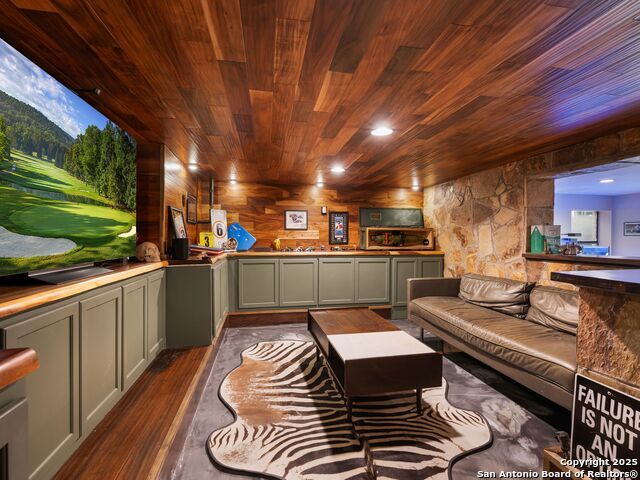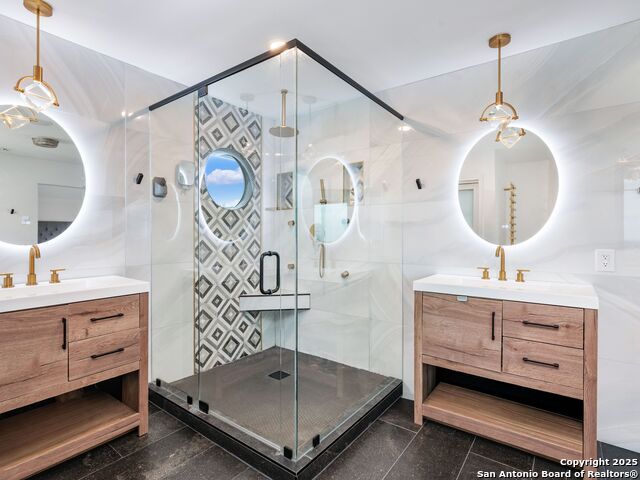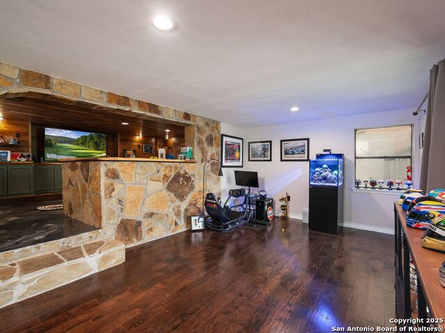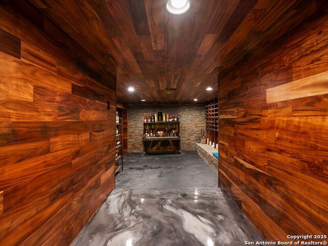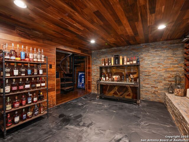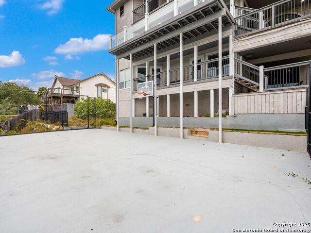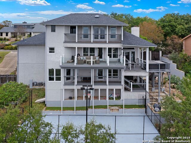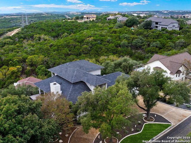 Set above the rolling hills of Crownridge, this thoughtfully updated residence captures sweeping Hill Country and downtown skyline views from nearly every vantage point. The home blends refined living with effortless entertaining, offering generous indoor-outdoor spaces and multi-level terraces designed to showcase the scenery. A light-filled main living area welcomes you upon entry, anchored by a gas fireplace and a redesigned wet bar. The island kitchen serves as the heart of the home, updated with quartz countertops, a modern backsplash, and an expanded butler's pantry with new cabinetry. A wood-paneled study with built-ins includes a private spiral staircase leading to a climate-controlled wine room on the lower level. Downstairs, two guest bedrooms enjoy terrace access and unobstructed views, accompanied by an updated full bath, a media room, and a flexible living space with direct access to the backyard. Upstairs, the primary suite offers complete privacy with its own terrace, a large walk-in closet, and a renovated spa bath featuring an oversized walk-in shower, standalone soaking tub, and dual vanities. Outdoors, tiered terraces provide ideal settings for dining, relaxing, and taking in fireworks from Six Flags. Additional features include a sports court, firepit area, hot tub, and professionally landscaped grounds. The property sits moments from I-10 and 1604, with quick access to La Cantera, The Rim, Camp Bullis, Friedrich Wilderness Park, and Eisenhower Park.