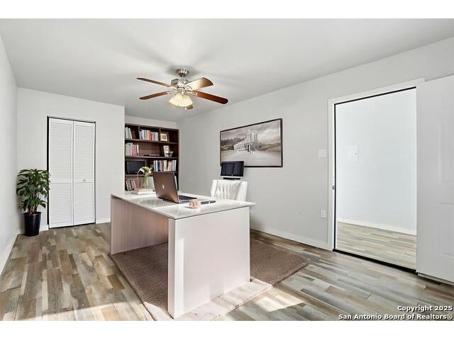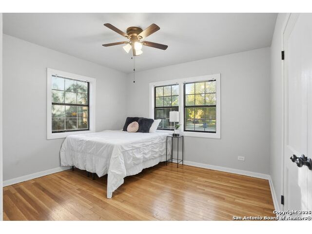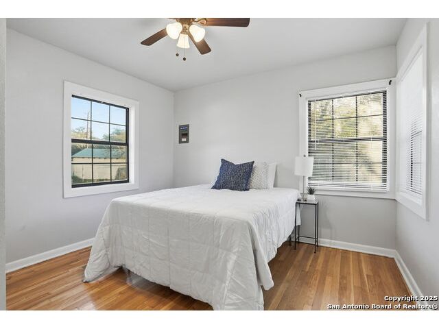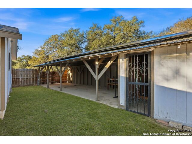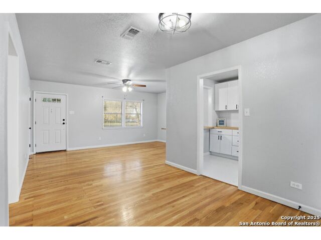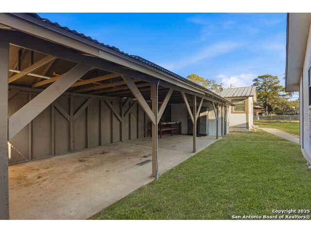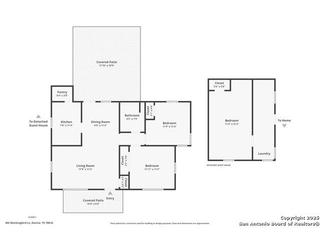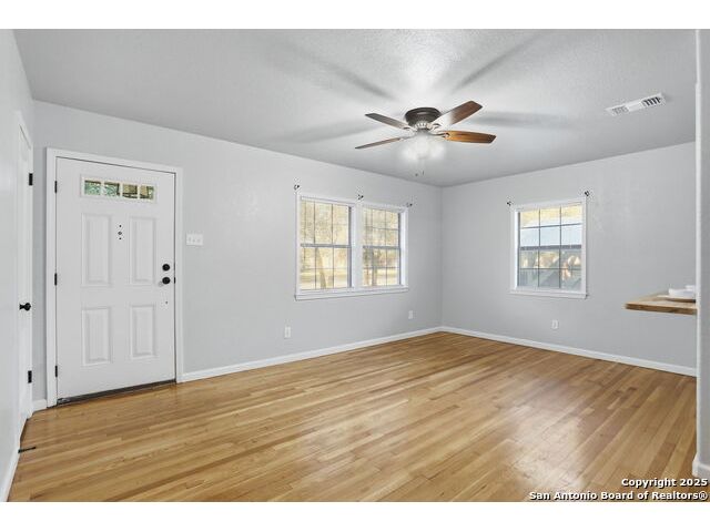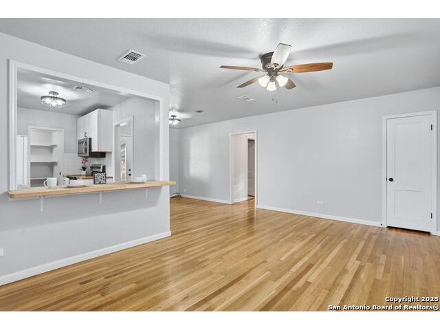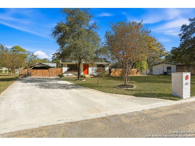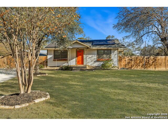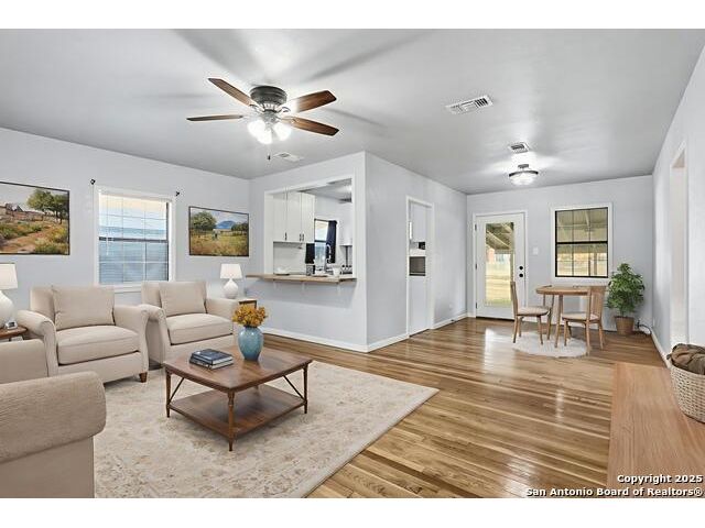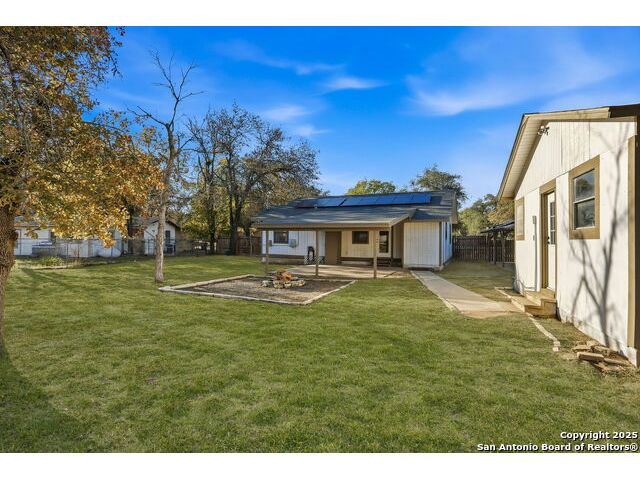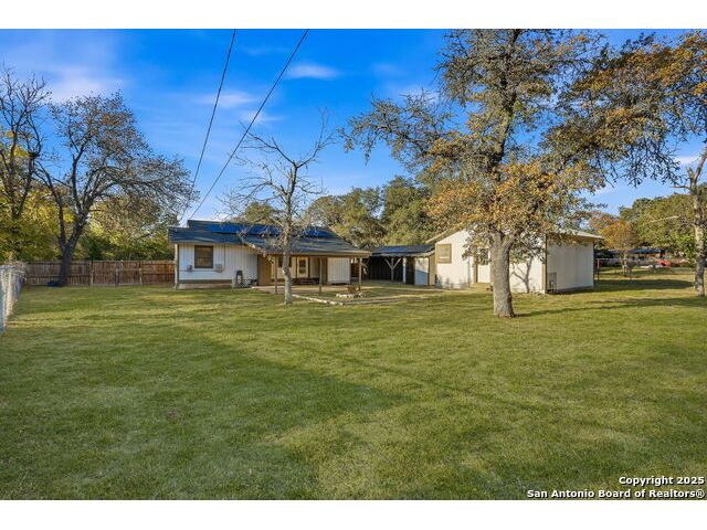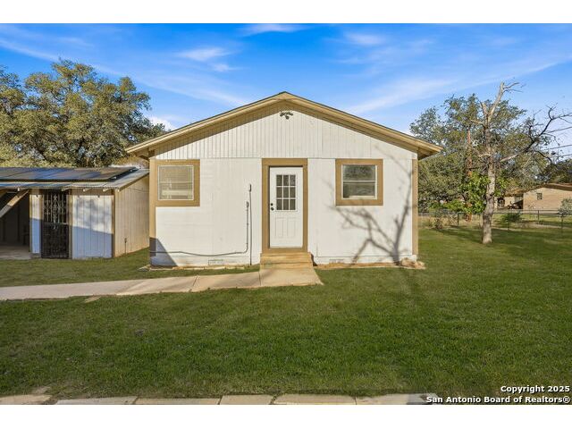 Full of charm, this 2-bedroom, 1-bath home sits on a spacious city lot in the heart of Devine, Texas, with no HOA! Inside, you'll find refinished original hardwood floors, an open-concept living area, and a bright kitchen featuring a pass-through breakfast bar overlooking the living room. Step outside to enjoy the large covered patio and fully fenced backyard, perfect for entertaining or relaxing after a long day. The property also includes covered parking with an attached storage room and a detached 400+ sq. ft. bonus space, ideal for a guest suite, home office, or studio. Conveniently located near IH-35, just a short drive to Downtown San Antonio, and minutes from local dining, shopping, Devine Community Park, and the golf course. Solar panels will be paid off at closing. Move-in ready and beautifully updated - this Devine gem truly has it all!