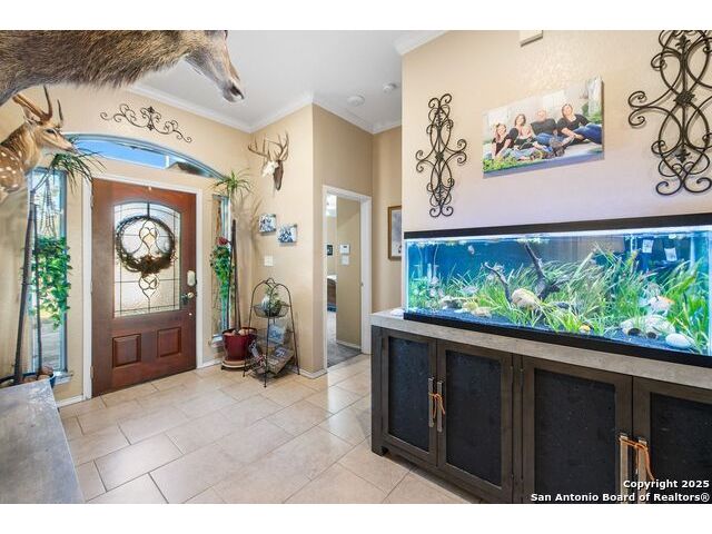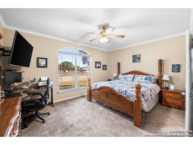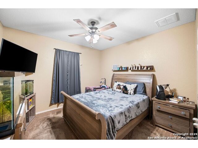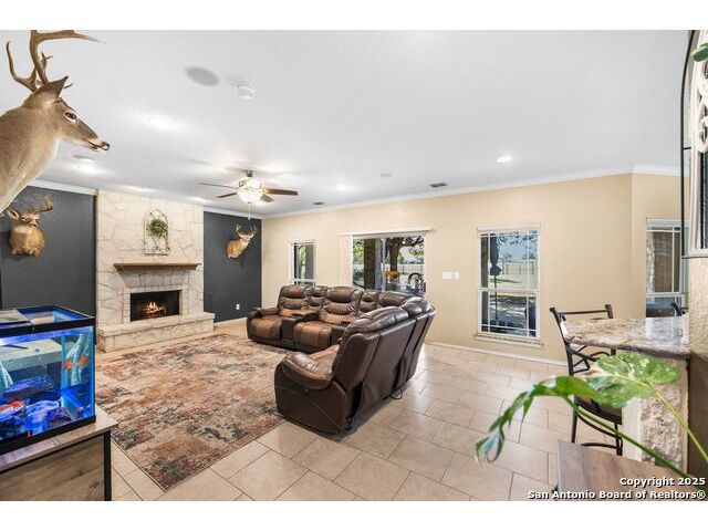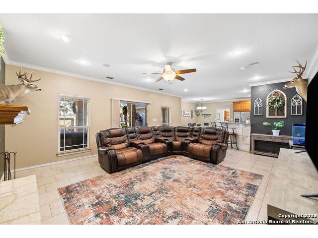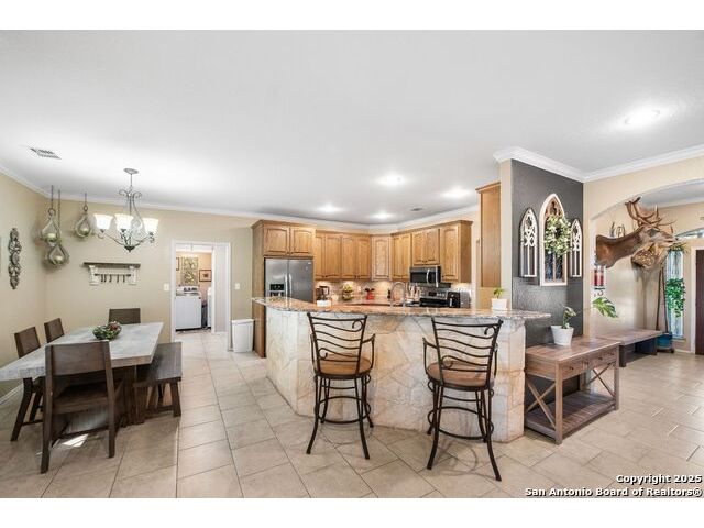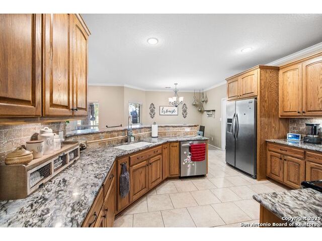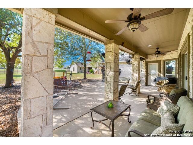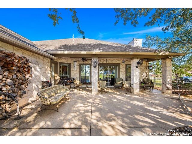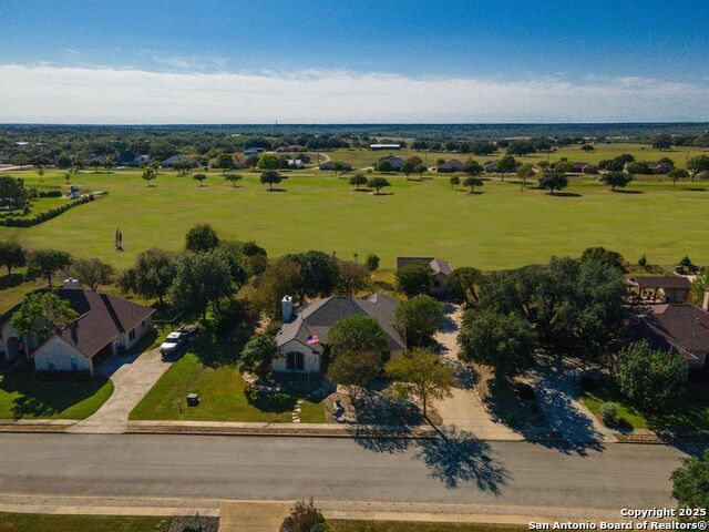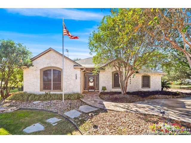 Enjoy living on the Alsatian Golf Course two miles west of Castroville! This rock veneer home features a spacious living room, granite countertops, large pantry, and a detached guest cottage. Professionally landscaped setting, spacious fenced back yard, and fronts a low traffic private road. Mature trees shade the large patio with golf course views. The guest quarters include a 20' X 15' efficiency apartment as well as a 20' X 14' shop/storage room. There is a 50' golf course/driving range easement outside of the wrought iron fenced yard. Flooring replacement is negotiable.