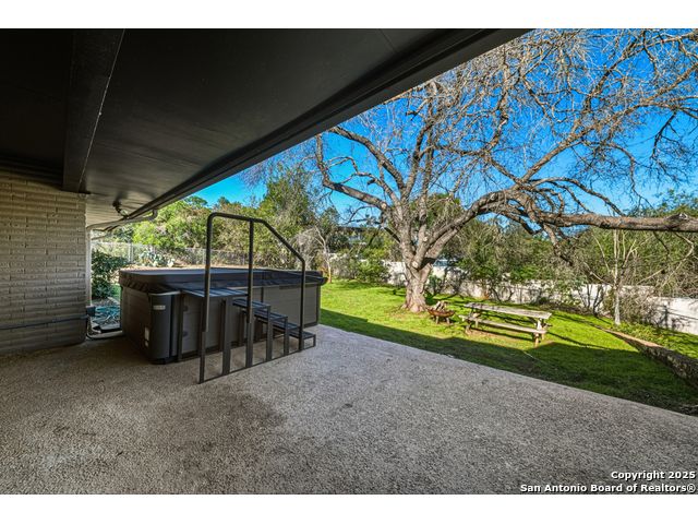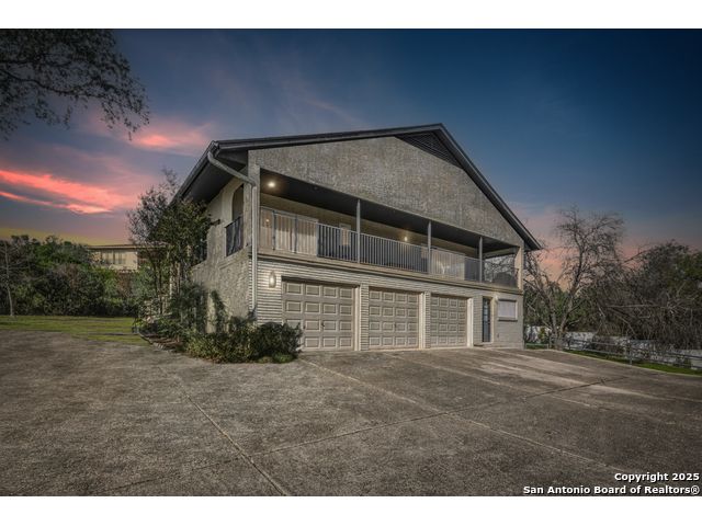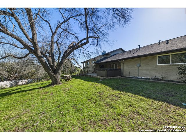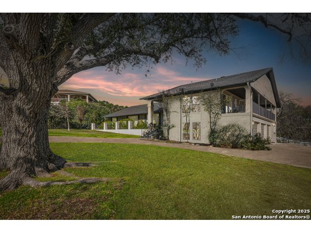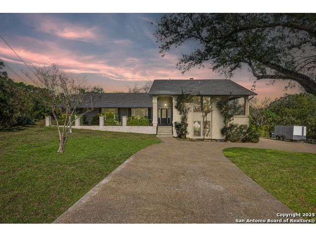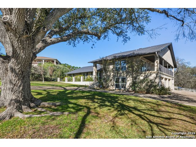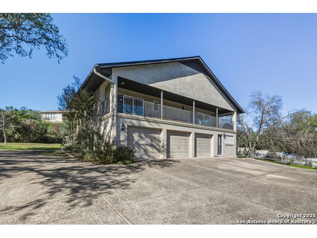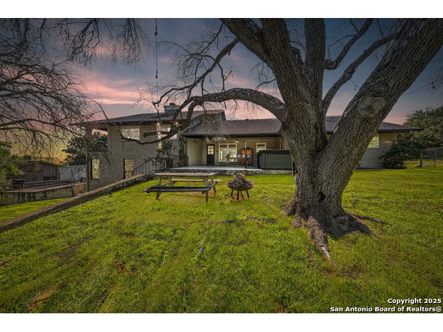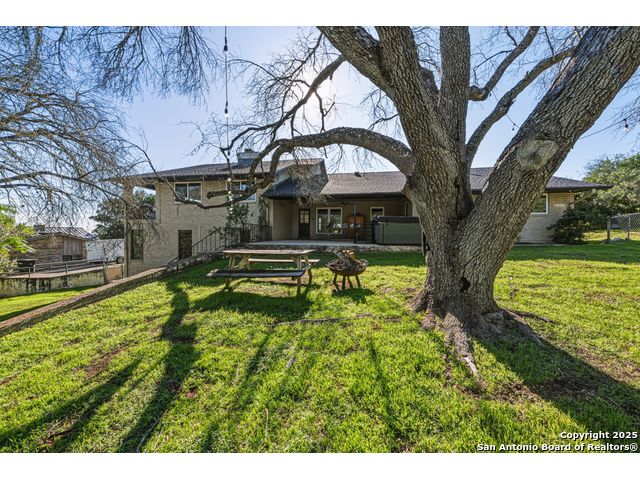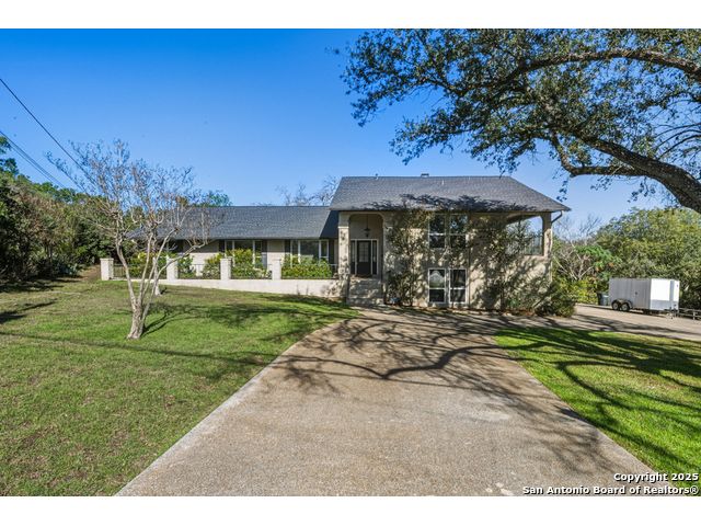 With half an acre on "The Hill", you will have some elbow room as well as a view. This 4 bedroom 3 bath home was originally built in 1979 but has been thoughtfully updated. The split level floorplan creates plenty of space that can offer versatility in living and entertaining. Step through the sliding glass doors to enjoy your city view from the large covered balcony that extends the whole side of the house from the family room to the owner's suite. The main level has flex space when you enter, bringing you into the kitchen with oversized granite island, stainless steel appliances, double ovens and faux wooden beam. The main level also offers two more bedrooms, bathroom, laundry and make sure to check out the cedar closet! Head down from the main level a few stairs and you will find another bedroom, bathroom, and sauna. The room also offers an exterior entrance that could be ideal for certain situations. Wood floors, gas fireplace, covered back patio with 10 seat hot tub, 3 car side entry garage and circle driveway are just a few more features this charmer has to offer. No HOA, NBISD, and close to all New Braunfels has to offer!