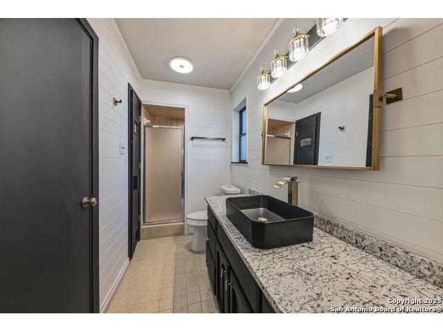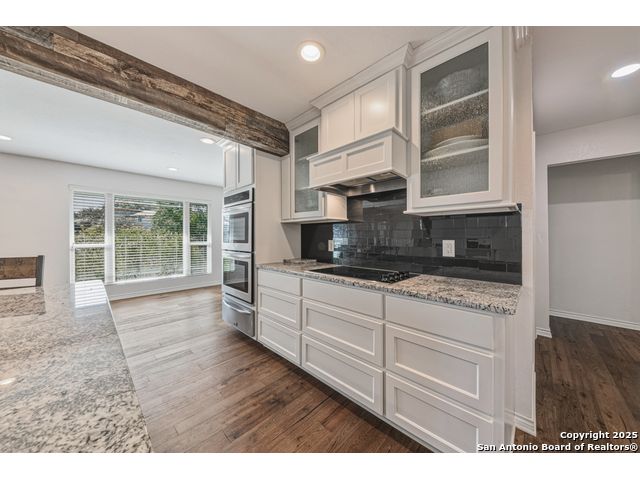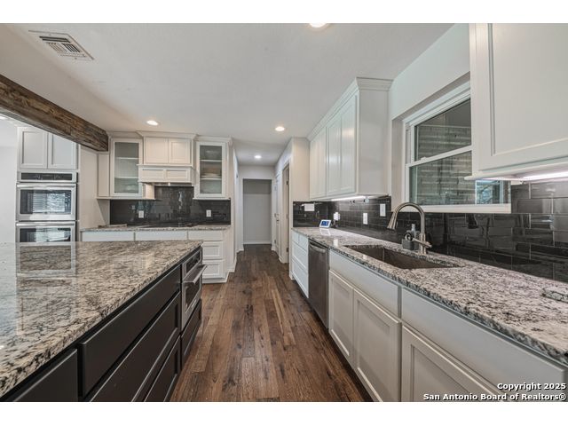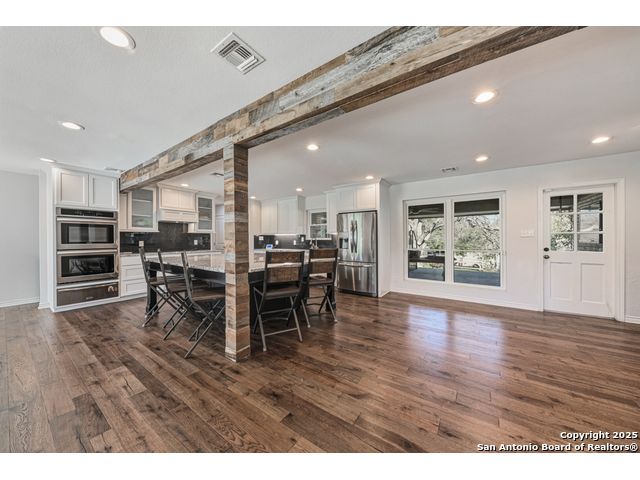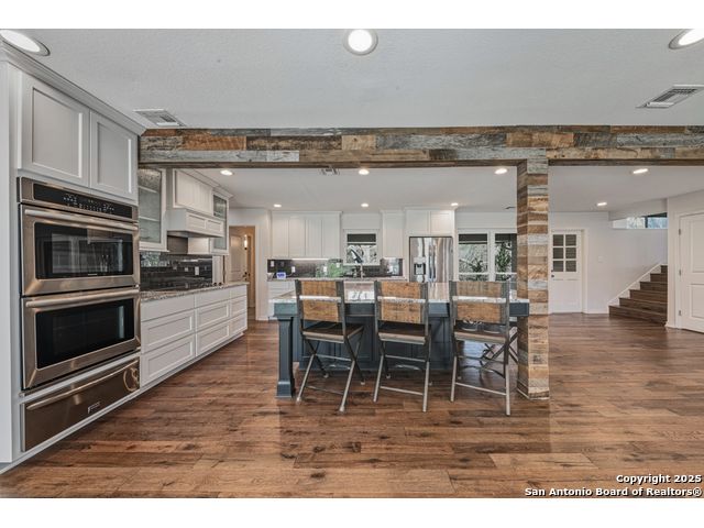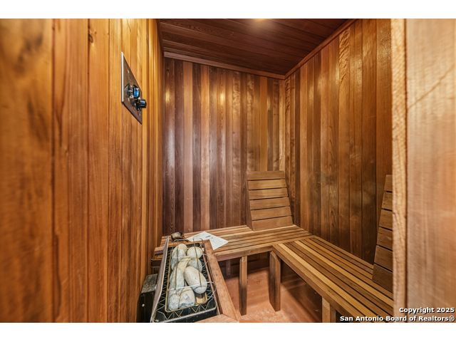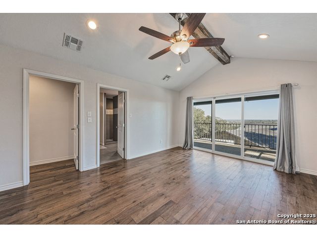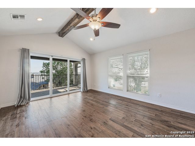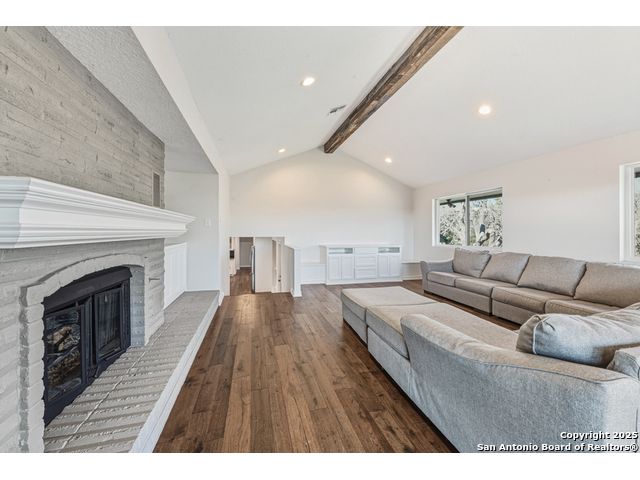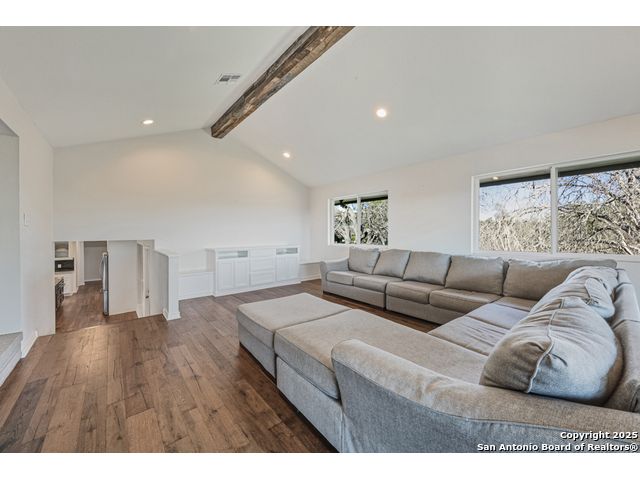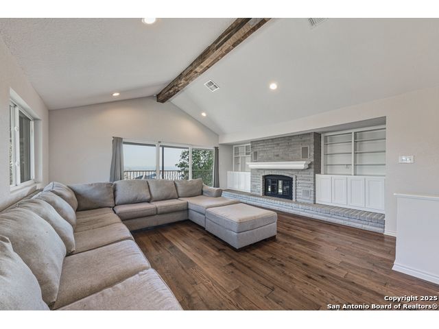 With half an acre on "The Hill", you will have some elbow room as well as a view. This 4 bedroom 3 bath home was originally built in 1979 but has been thoughtfully updated. The split level floorplan creates plenty of space that can offer versatility in living and entertaining. Step through the sliding glass doors to enjoy your city view from the large covered balcony that extends the whole side of the house from the family room to the owner's suite. The main level has flex space when you enter, bringing you into the kitchen with oversized granite island, stainless steel appliances, double ovens and faux wooden beam. The main level also offers two more bedrooms, bathroom, laundry and make sure to check out the cedar closet! Head down from the main level a few stairs and you will find another bedroom, bathroom, and sauna. The room also offers an exterior entrance that could be ideal for certain situations. Wood floors, gas fireplace, covered back patio with 10 seat hot tub, 3 car side entry garage and circle driveway are just a few more features this charmer has to offer. No HOA, NBISD, and close to all New Braunfels has to offer!