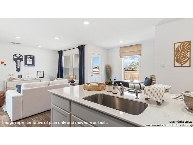 Introducing The Wyeth, a beautiful floor plan featured in the Sonora new construction home community in San Antonio, TX. This thoughtfully designed single-story home offers 1023 square feet of living space, with 3 bedrooms and 2 bathrooms, making it the perfect option for families or those looking. The home's exterior is available in two elevation options, both featuring durable James Hardie siding for long-lasting beauty, for a cozy, yet spacious home. The Wyeth replaces a traditional garage with a driveway, providing convenient parking and easy access. The open and blended layout combines the living room, dining area, and kitchen, creating a seamless space for both everyday living and entertaining. The kitchen is a true highlight, featuring modern shaker-style cabinets, sleek stainless steel appliances, and elegant quartz countertops. A corner pantry provides added storage space, making it easy to keep everything organized and within reach. The main bedroom suite is thoughtfully located toward the front of the house for added privacy and comfort. It includes plush carpet flooring, a walk-in closet, and an ensuite bathroom with a single vanity quartz sink, a walk-in shower, and modern finishes. The secondary bedrooms are spacious and feature carpet flooring, large windows that allow natural light to fill the rooms, and closets for storage. Additional features of The Wyeth include quartz countertops in the secondary bathroom and hard surface flooring throughout the living room, dining area, kitchen, and wet areas, ensuring easy maintenance and a modern aesthetic. With its open concept design, stylish finishes, and well-thought-out layout, The Wyeth is the ideal home for those seeking both comfort and modern living at Sonora in San Antonio, TX.