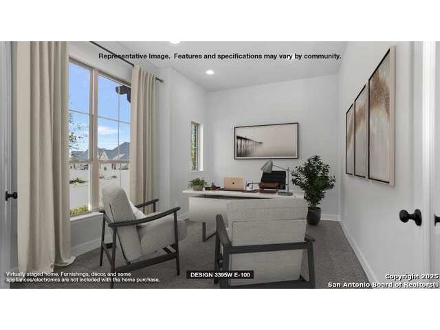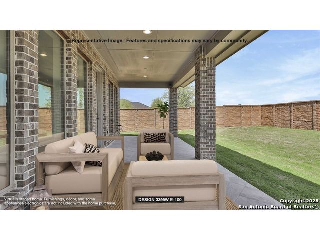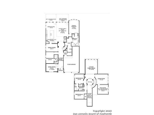 Home office with French doors set at entry with 20-foot ceiling. Formal dining room opens to rotunda with curved staircase. Two-story family room with 18-foot ceiling, a wood mantel fireplace and a wall of windows opening to the kitchen and morning area. Kitchen hosts generous island with built-in seating space and a 5-burner gas cooktop. Primary suite with a wall of windows. Primary bath includes dual vanity, freestanding tub, separate glass-enclosed shower and large walk-in closet with access to utility room. First-floor guest suite. A game room, media room and two secondary bedrooms are upstairs. Extended covered backyard patio. Mud room off three-car garage.