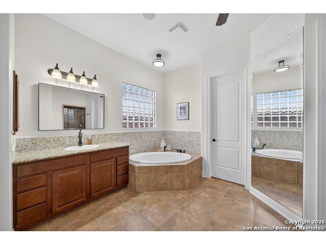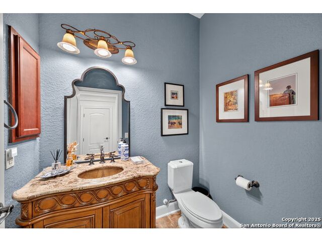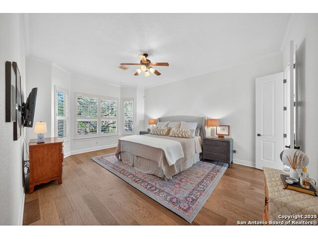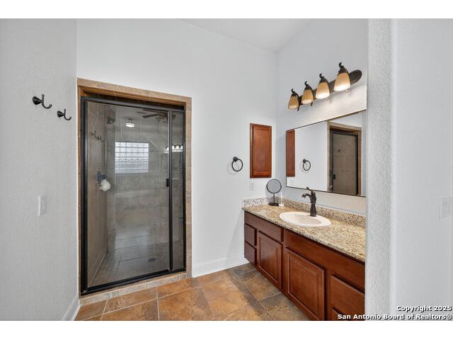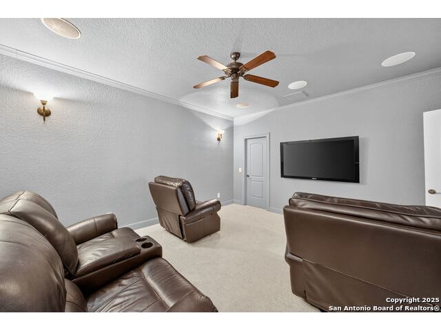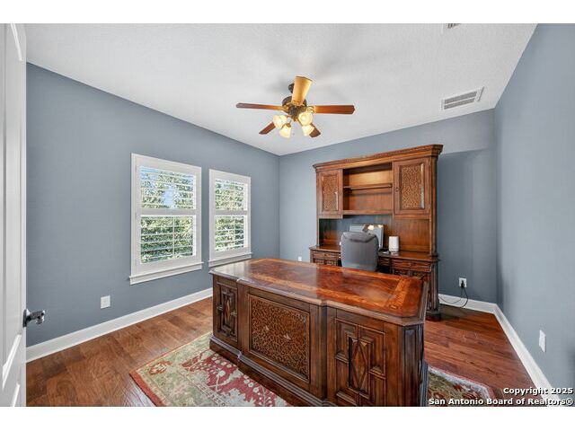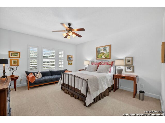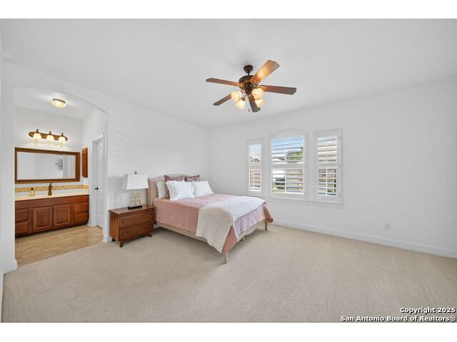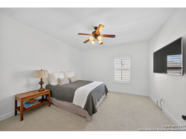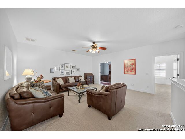 Beautiful 5-bedroom, 3.5-bath home situated on a premium lot in the desirable Rogers Ranch subdivision. The flexible floor plan includes a dedicated study that can serve as a 5th bedroom, along with living and dining areas with high ceilings and an open floor plan. The kitchen features granite countertops, ample cabinetry, double ovens and an large island overlooking the family room. The Butlers pantry includes an ice maker, beverage fridge & a wine fridge. The primary suite on the main level offers a large bath with separate tub and shower and a 2 walk-in closets. Upstairs provides four additional bedrooms, 2 full baths, and a spacious game room & media room. This home also has an amazing amount of closet space along with plantation shutters through out the house. Step outside to a covered patio equipped with a fireplace and outdoor gas grill-ideal for year-round outdoor living and entertaining.