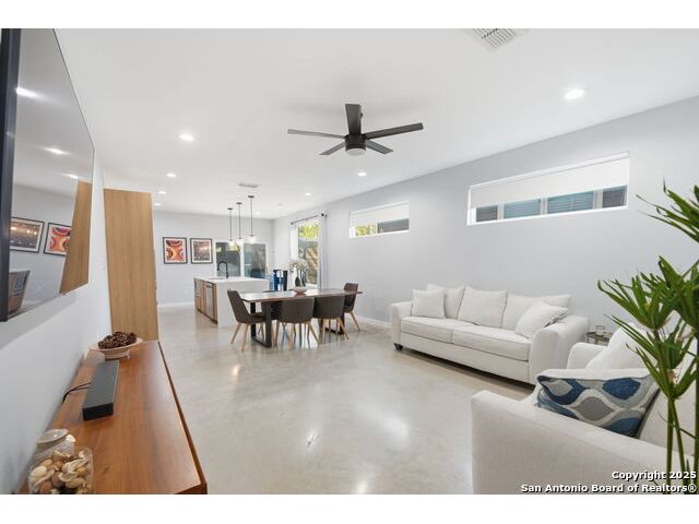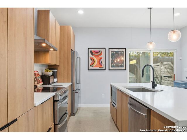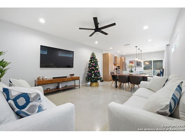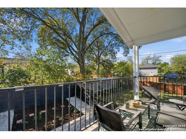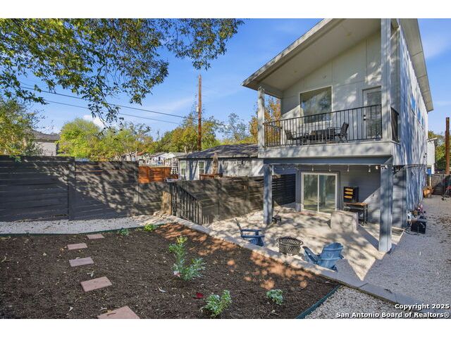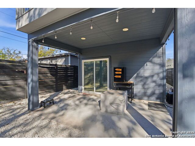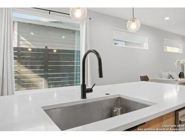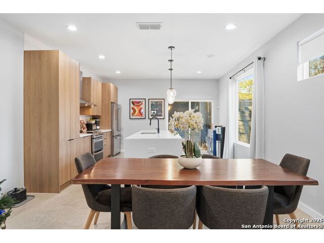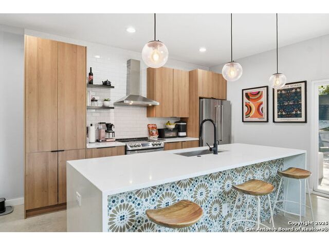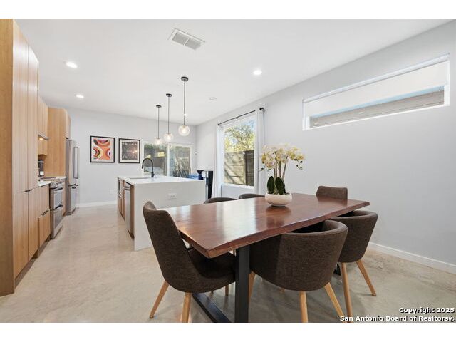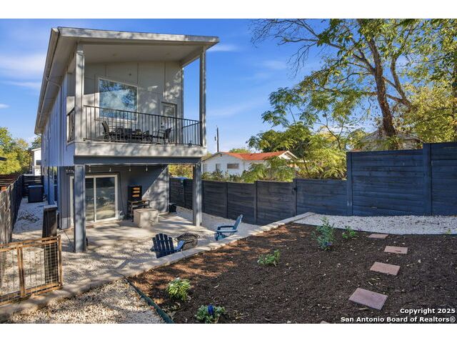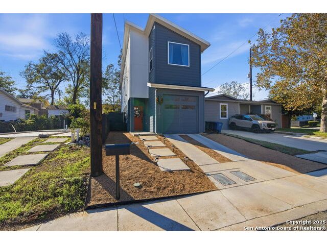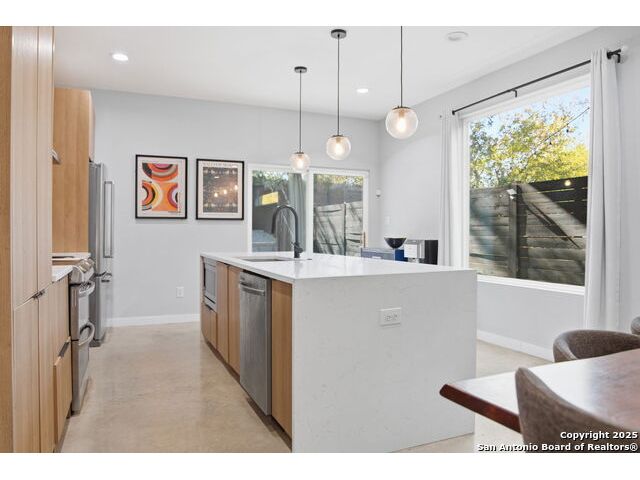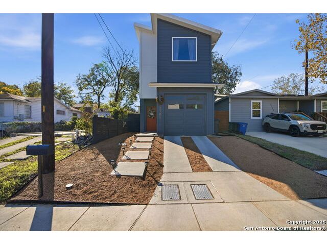 This modern contemporary home blends style, function, and an incredibly convenient location. Stained concrete floors and recessed lighting set a clean and contemporary tone throughout the main living spaces. The kitchen stands out as the centerpiece, offering a striking waterfall island, a comfortable breakfast bar, stainless steel appliances, custom cabinetry, detailed tile accents, and a classic white subway tile backsplash. The layout is designed for practical living, and the upstairs laundry room adds even more convenience with a full-size washer and dryer setup instead of a stacked set up. The primary suite provides a calming retreat with a spa-inspired bathroom featuring a separate shower, a relaxing garden tub, and quartz tile throughout. A customized walk-in closet with built-in shelving maximizes storage, and outside access leads to a private balcony ideal for morning coffee or quiet evenings. The backyard enhances the property with xeriscaping for low-maintenance living and a covered patio that creates a comfortable outdoor area to enjoy or entertain guests. A short drive connects you to Southtown, Downtown San Antonio, Brooks City Base, and Fort Sam Houston, offering effortless access to dining, entertainment, and major destinations.