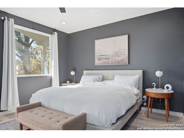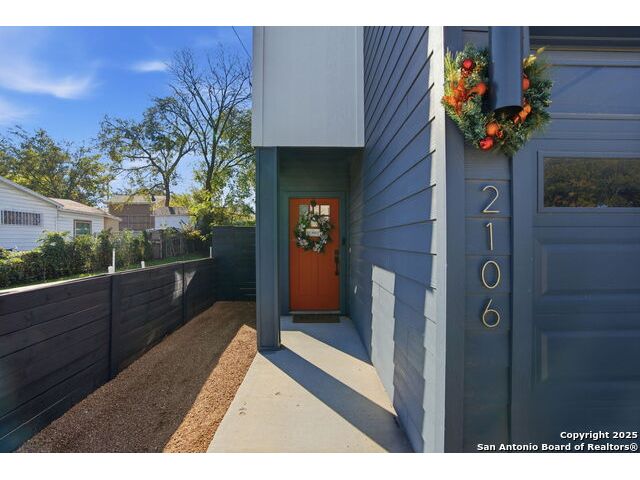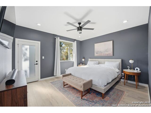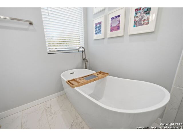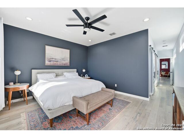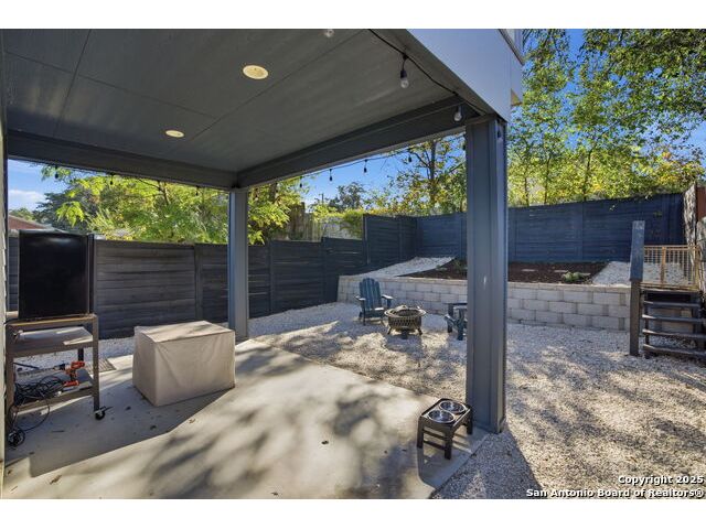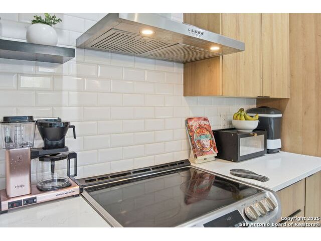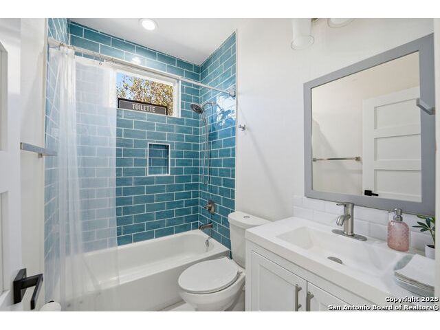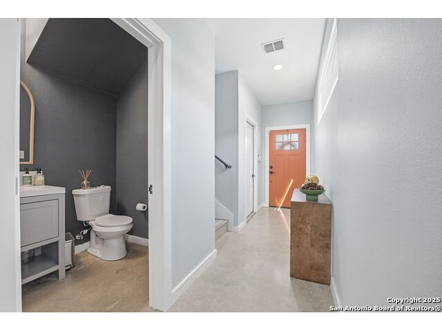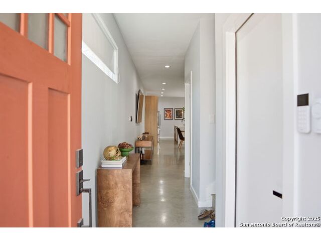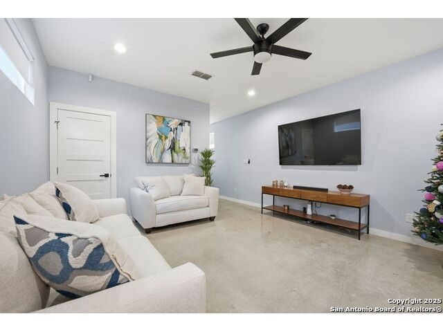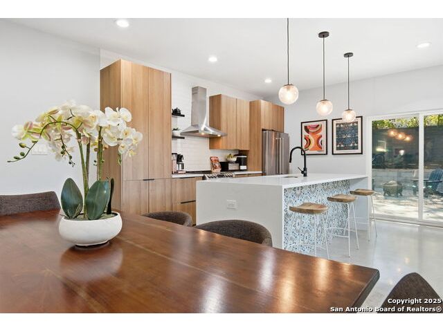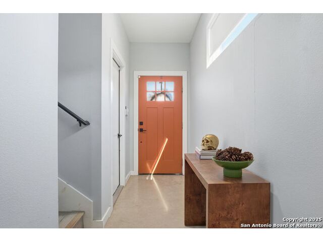 This modern contemporary home blends style, function, and an incredibly convenient location. Stained concrete floors and recessed lighting set a clean and contemporary tone throughout the main living spaces. The kitchen stands out as the centerpiece, offering a striking waterfall island, a comfortable breakfast bar, stainless steel appliances, custom cabinetry, detailed tile accents, and a classic white subway tile backsplash. The layout is designed for practical living, and the upstairs laundry room adds even more convenience with a full-size washer and dryer setup instead of a stacked set up. The primary suite provides a calming retreat with a spa-inspired bathroom featuring a separate shower, a relaxing garden tub, and quartz tile throughout. A customized walk-in closet with built-in shelving maximizes storage, and outside access leads to a private balcony ideal for morning coffee or quiet evenings. The backyard enhances the property with xeriscaping for low-maintenance living and a covered patio that creates a comfortable outdoor area to enjoy or entertain guests. A short drive connects you to Southtown, Downtown San Antonio, Brooks City Base, and Fort Sam Houston, offering effortless access to dining, entertainment, and major destinations.