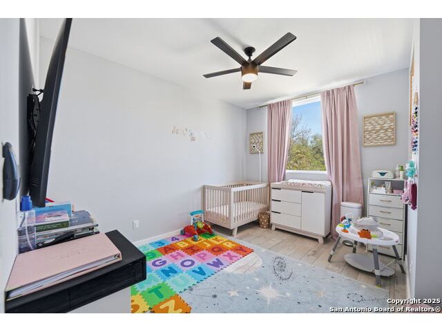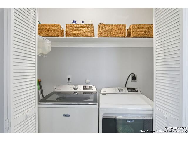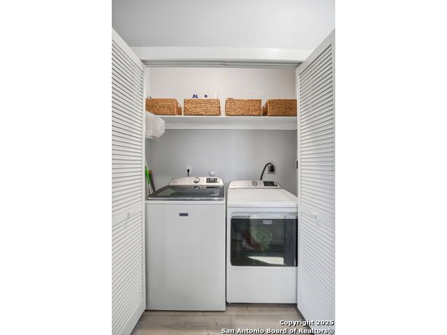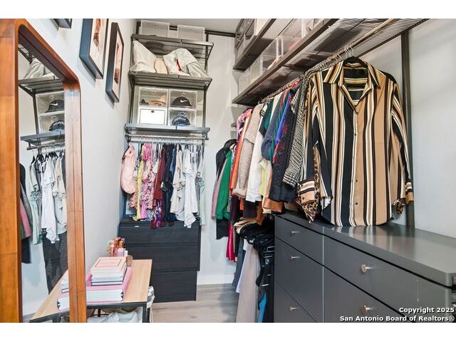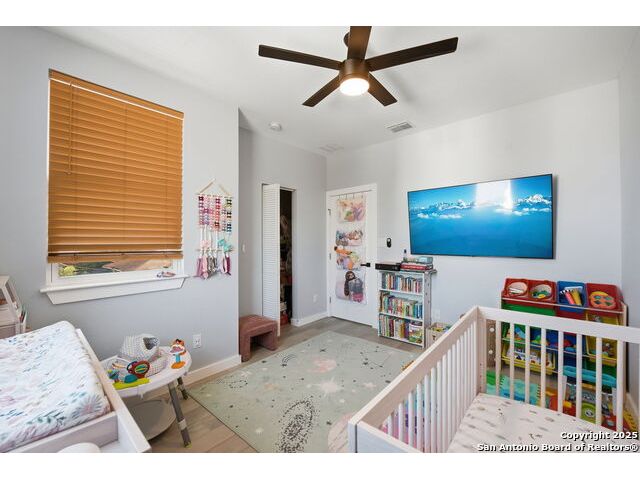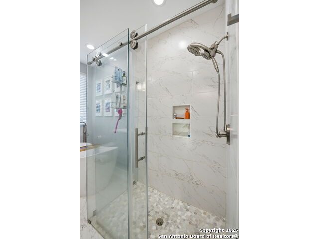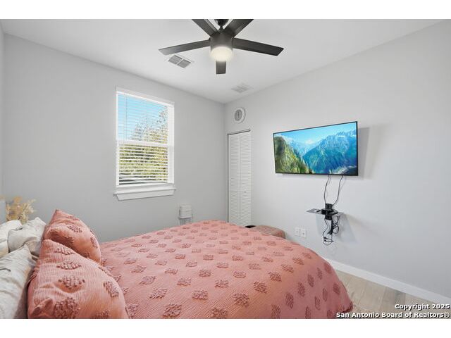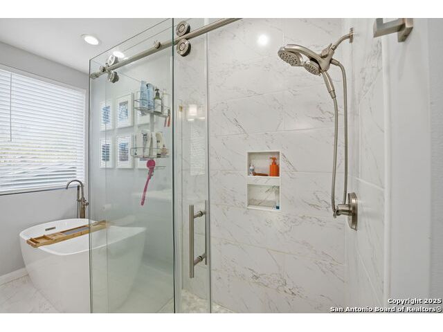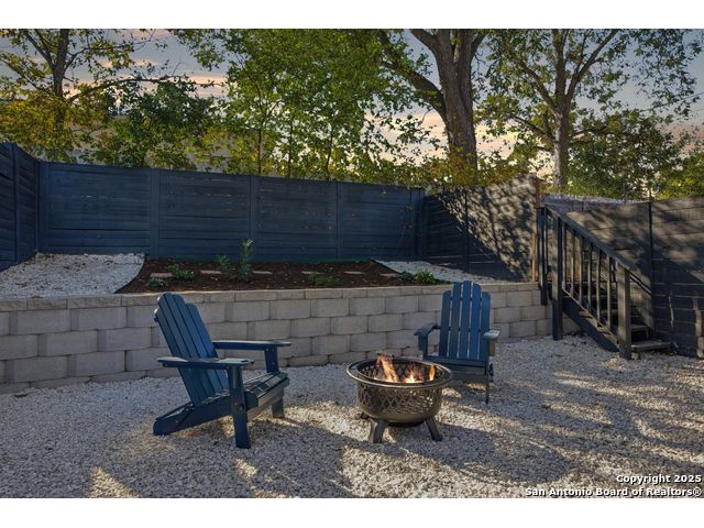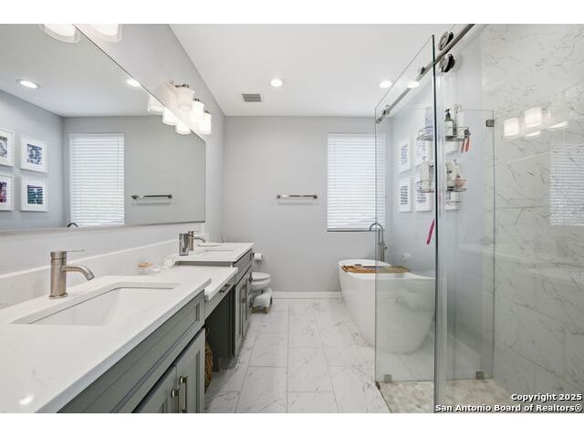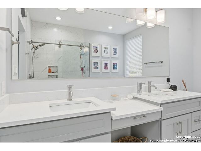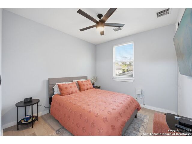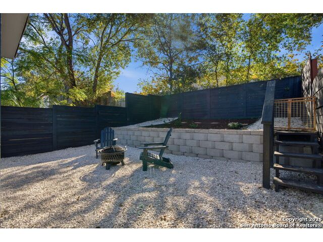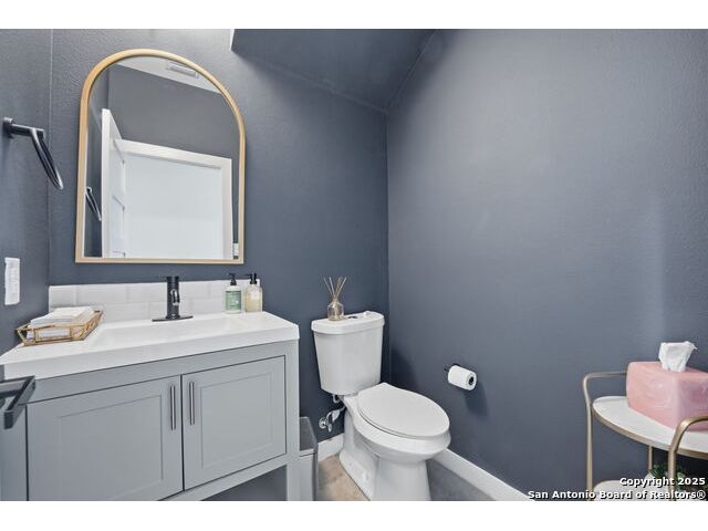 This modern contemporary home blends style, function, and an incredibly convenient location. Stained concrete floors and recessed lighting set a clean and contemporary tone throughout the main living spaces. The kitchen stands out as the centerpiece, offering a striking waterfall island, a comfortable breakfast bar, stainless steel appliances, custom cabinetry, detailed tile accents, and a classic white subway tile backsplash. The layout is designed for practical living, and the upstairs laundry room adds even more convenience with a full-size washer and dryer setup instead of a stacked set up. The primary suite provides a calming retreat with a spa-inspired bathroom featuring a separate shower, a relaxing garden tub, and quartz tile throughout. A customized walk-in closet with built-in shelving maximizes storage, and outside access leads to a private balcony ideal for morning coffee or quiet evenings. The backyard enhances the property with xeriscaping for low-maintenance living and a covered patio that creates a comfortable outdoor area to enjoy or entertain guests. A short drive connects you to Southtown, Downtown San Antonio, Brooks City Base, and Fort Sam Houston, offering effortless access to dining, entertainment, and major destinations.
