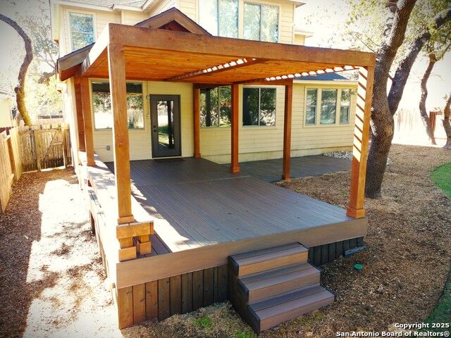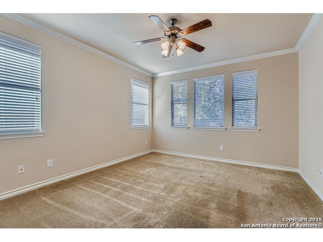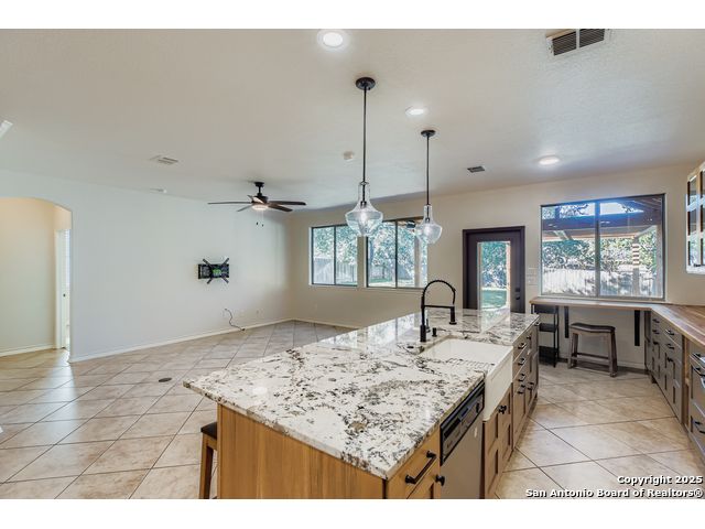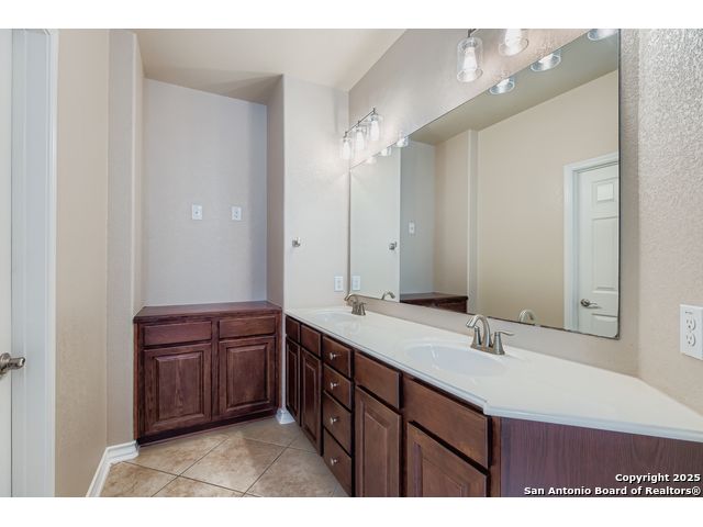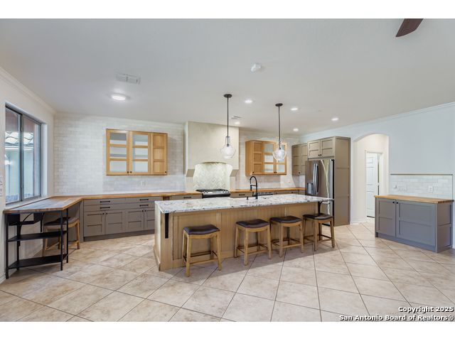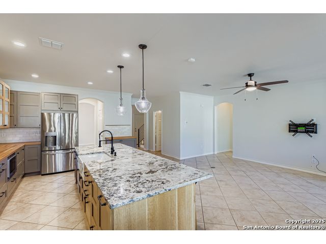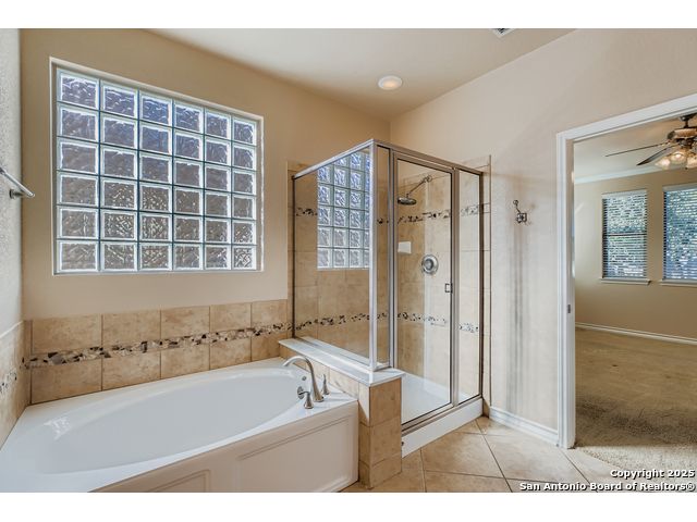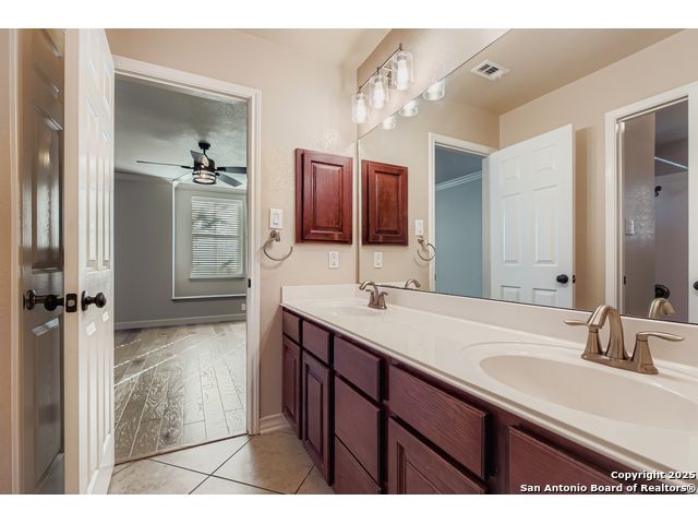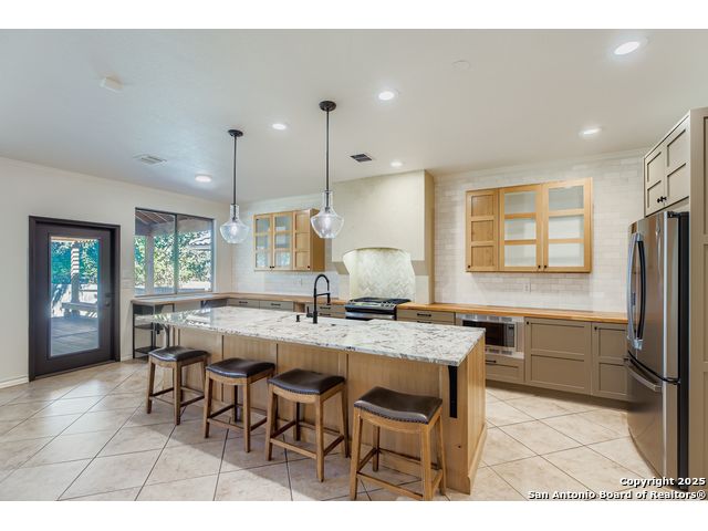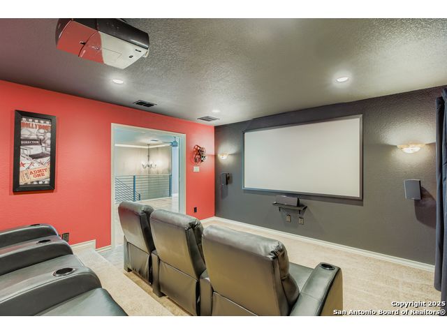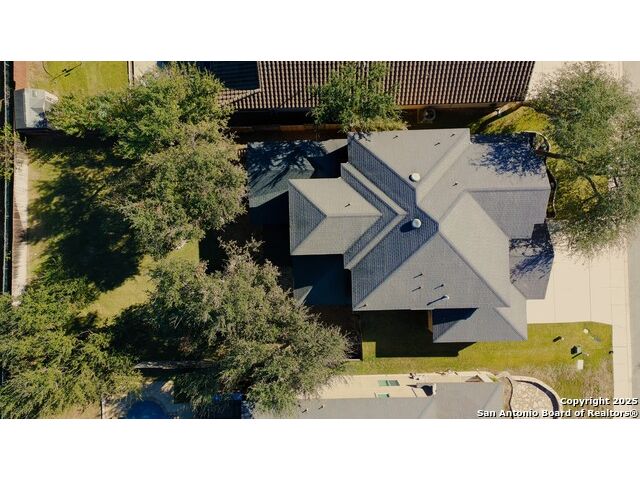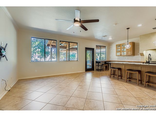 Nestled in the desirable Cliffs at Cibolo subdivision, this beautiful and luxurious home is truly move-in ready, offering an impressive blend of style, comfort, and space. Designed with high ceilings and an open floor plan, the layout creates an inviting atmosphere from the moment you walk in. Oversized tile flooring extends throughout the multiple living and dining areas on the main level, enhancing both durability and visual appeal. The custom island kitchen serves as the heart of the home, featuring stainless steel appliances, granite counters, and generous workspace that makes everyday cooking and entertaining effortless. An office on the main level provides the perfect setting for remote work or quiet reading, while the additional game room and media room give everyone the freedom to spread out and enjoy their own activities. The separate primary suite on the main level offers a peaceful retreat, complete with a spacious en-suite bathroom designed for comfort and relaxation. Upstairs, secondary bedrooms accompany full bathrooms, providing privacy and convenience for family or guests. Outdoor living is equally inviting with a patio and extended decking that overlook the large, lushly landscaped backyard, creating an ideal setting for gatherings or quiet evenings in a private, serene environment. This well-appointed home offers even more features throughout and is perfectly situated near local amenities, major highways, and schools, ensuring both convenience and a vibrant lifestyle. It stands as an exceptional opportunity to enjoy upscale living in a sought-after location.