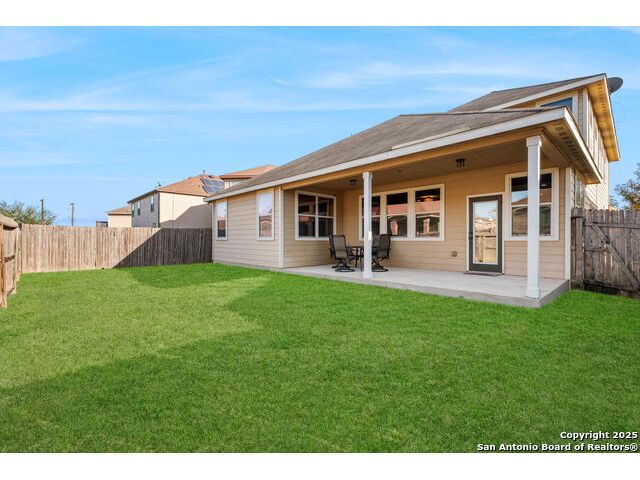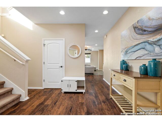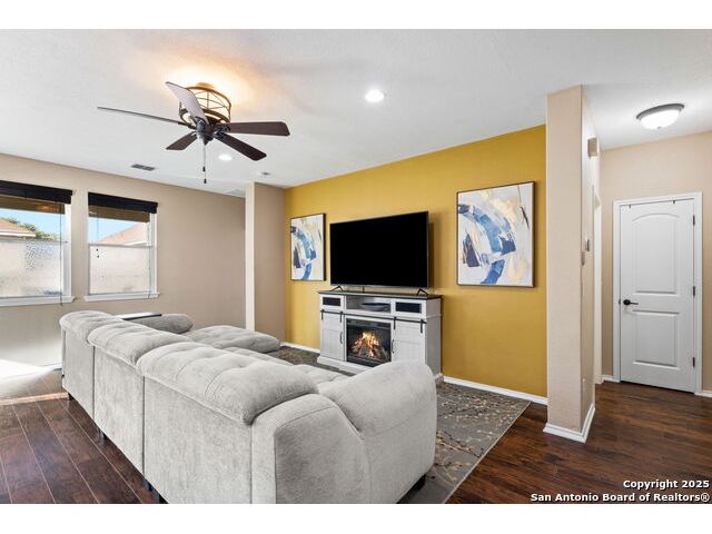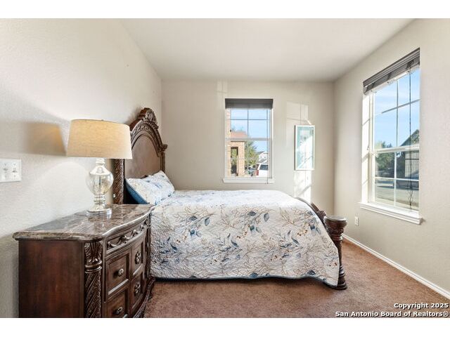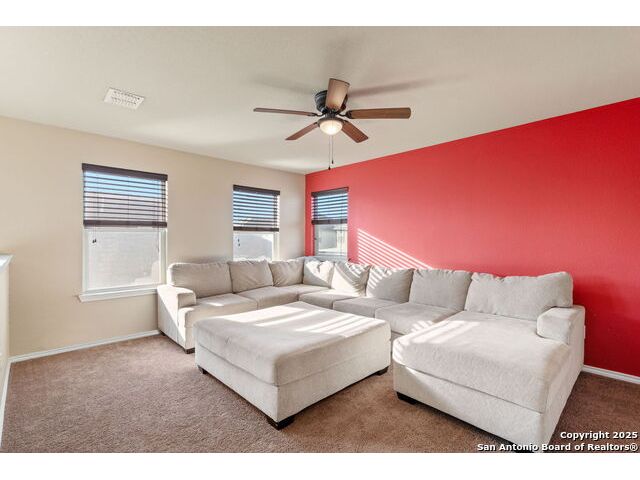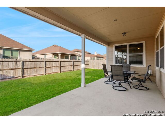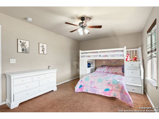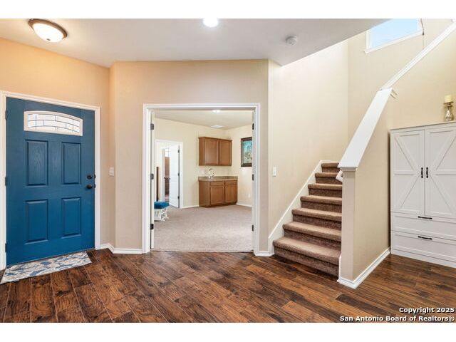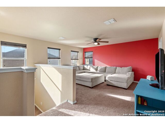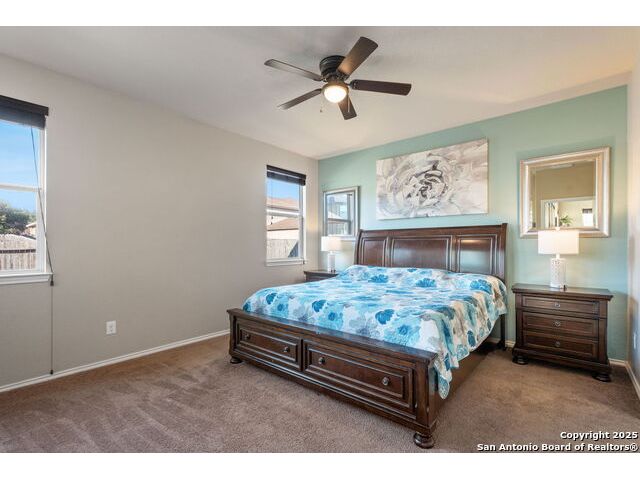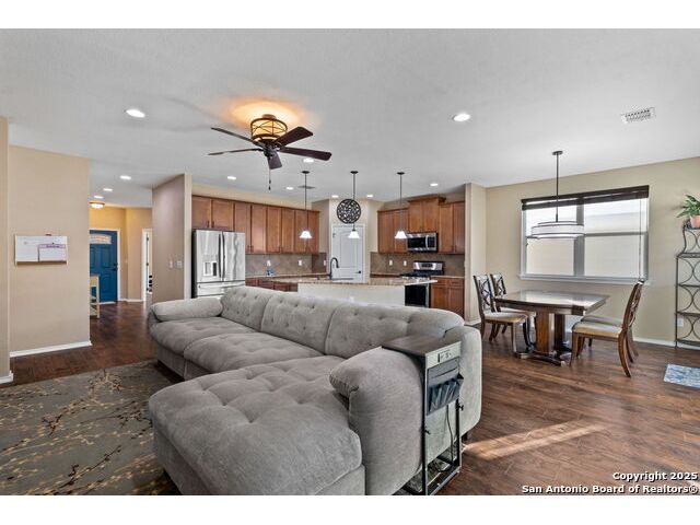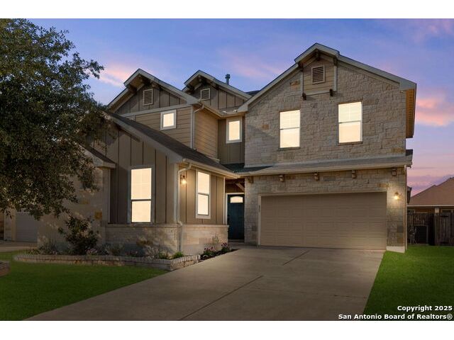 This spacious residence delivers a rare combination of versatility, comfort, and usable space in a quiet cul-de-sac setting. With high ceilings and recessed lighting this layout features a mother in law suite on the first floor complete with its own living area, providing exceptional flexibility for multi generational living. An additional guest suite upstairs as the property offers a total of five bedrooms along with generous closet space in each room. The primary room is located on the main level, while the upstairs game room adds the perfect spot for entertainment or relaxation. The kitchen offers stainless steel appliances, a large granite kitchen island, and a spacious breakfast bar ideal for casual dining. Outdoor living is well supported with a covered patio, a privacy fence, and the added convenience of a dog septic tank. Energy efficient features include a programmable thermostat and double pane windows, contributing to comfort and lower utility use. The location provides a short commute to Randolph Air Force Base and Fort Sam with easy access to Loop 1604.