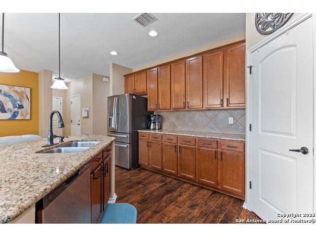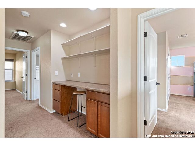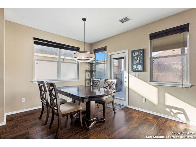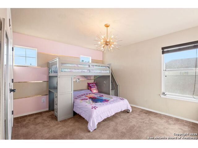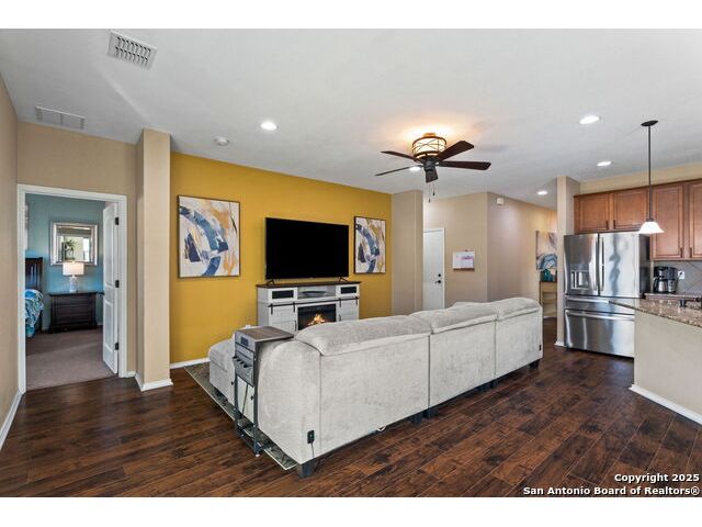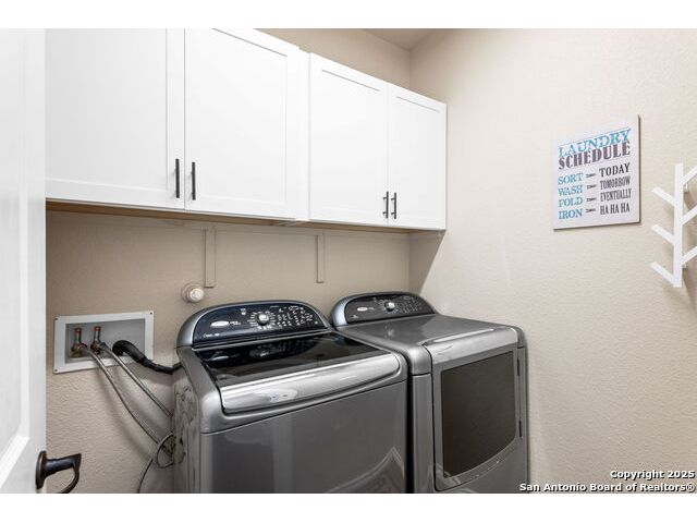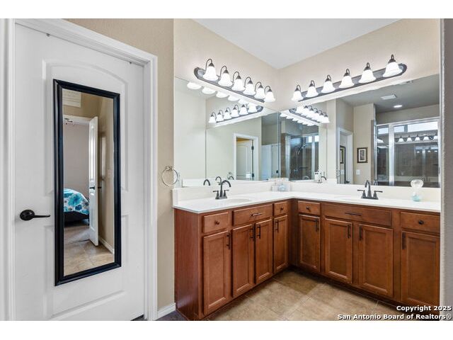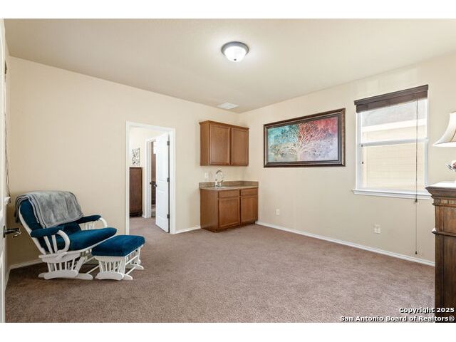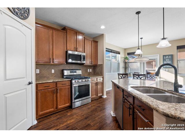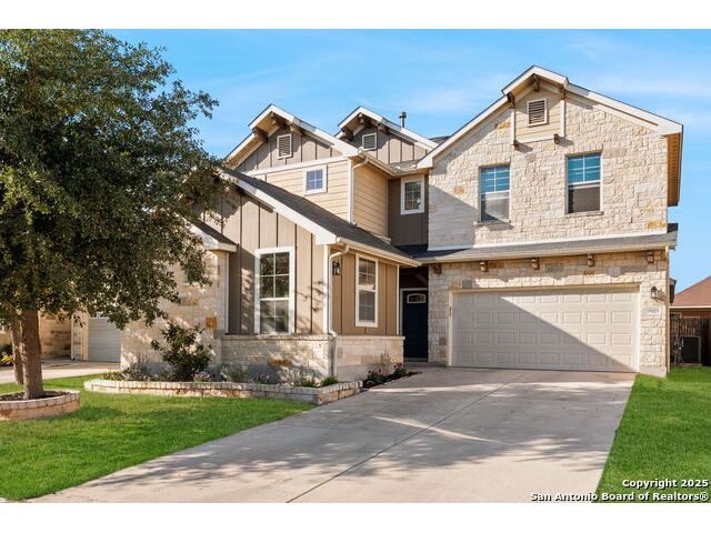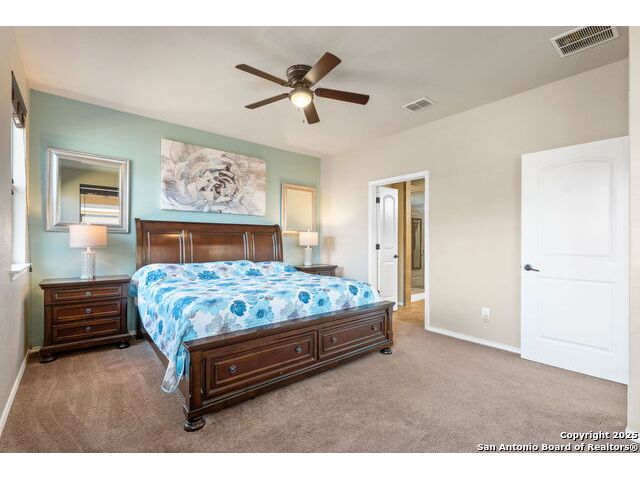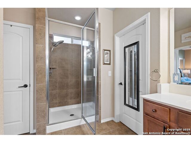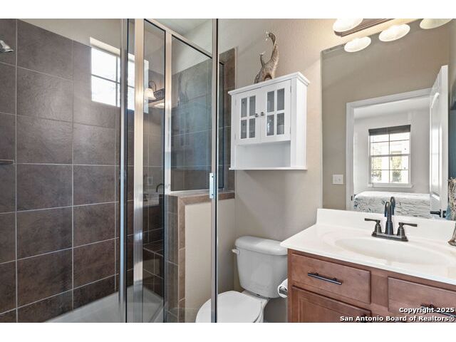 This spacious residence delivers a rare combination of versatility, comfort, and usable space in a quiet cul-de-sac setting. With high ceilings and recessed lighting this layout features a mother in law suite on the first floor complete with its own living area, providing exceptional flexibility for multi generational living. An additional guest suite upstairs as the property offers a total of five bedrooms along with generous closet space in each room. The primary room is located on the main level, while the upstairs game room adds the perfect spot for entertainment or relaxation. The kitchen offers stainless steel appliances, a large granite kitchen island, and a spacious breakfast bar ideal for casual dining. Outdoor living is well supported with a covered patio, a privacy fence, and the added convenience of a dog septic tank. Energy efficient features include a programmable thermostat and double pane windows, contributing to comfort and lower utility use. The location provides a short commute to Randolph Air Force Base and Fort Sam with easy access to Loop 1604.