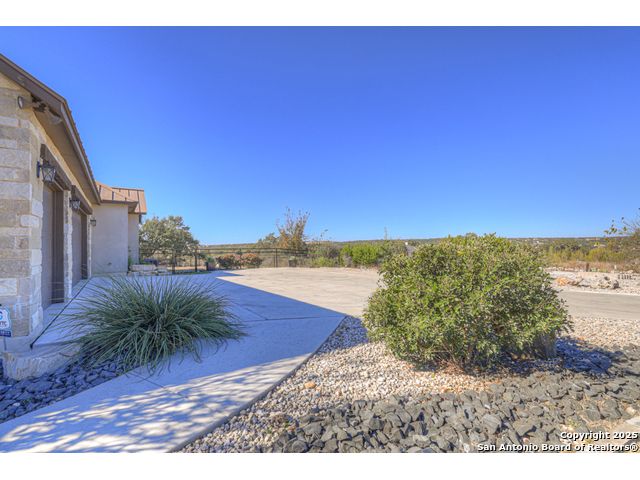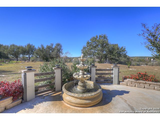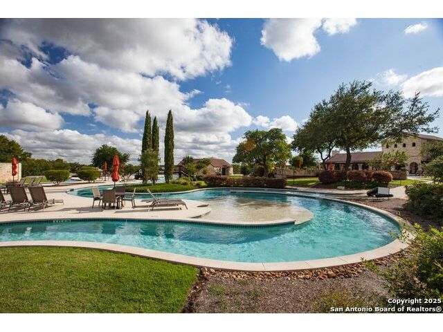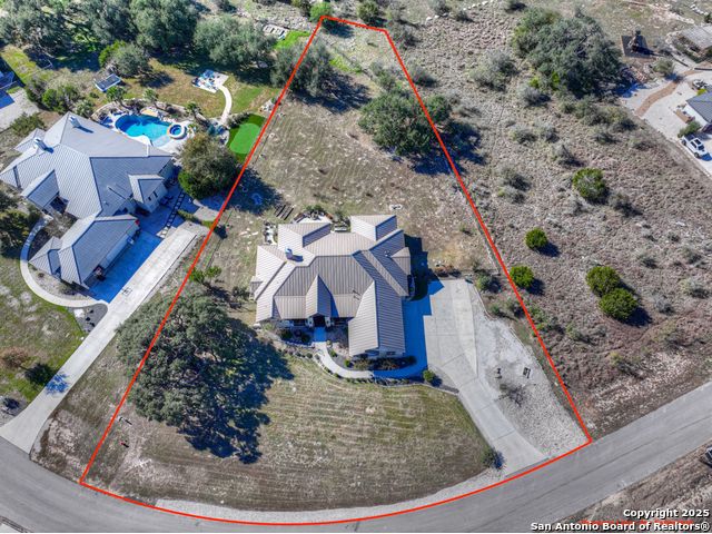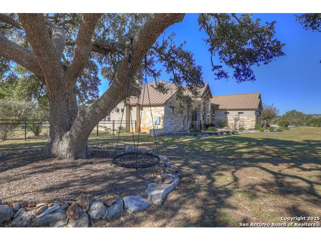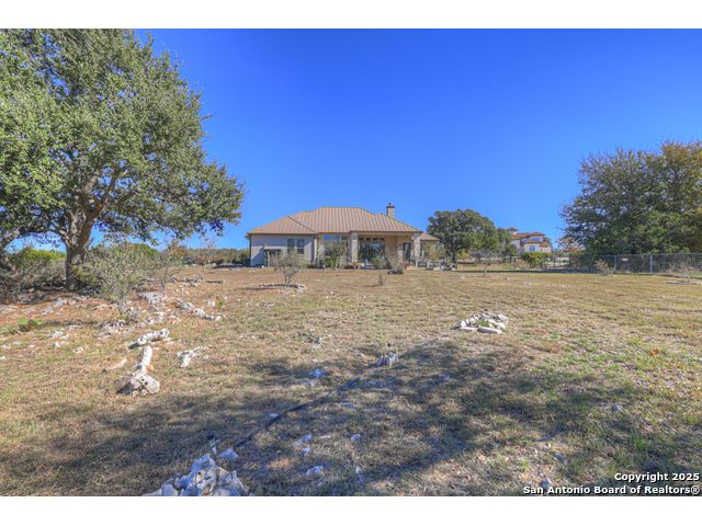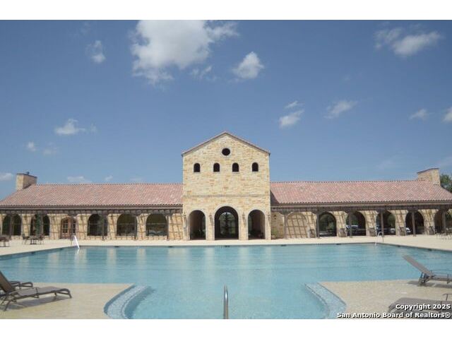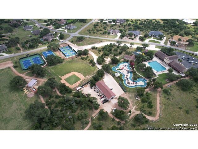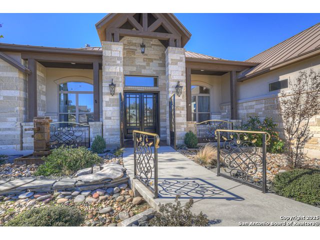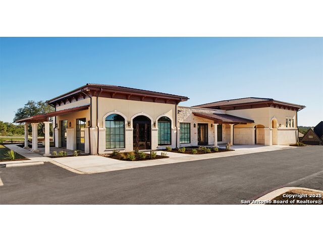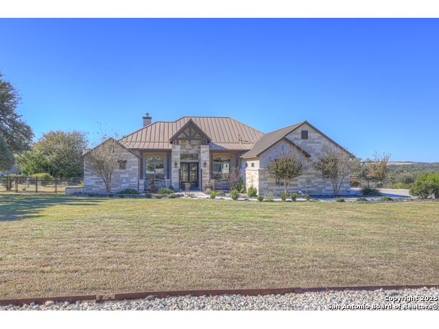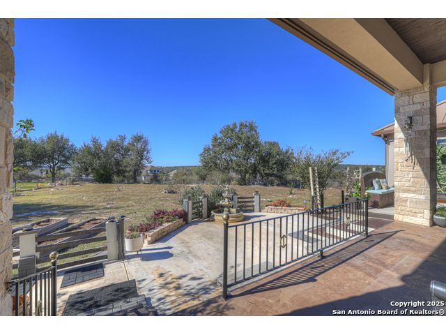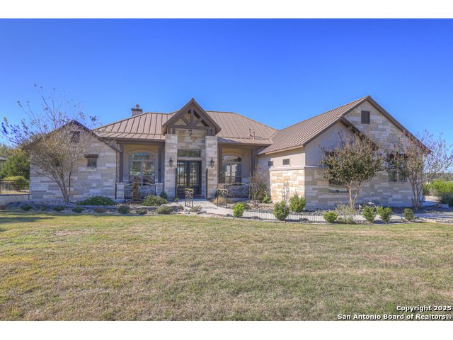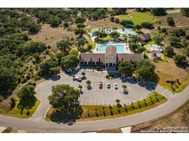 Fabulous 5 bedroom, 4.5 bath Custom Home Built by Vintage Estate Homes, perfectly located in the heart of the Texas Hill Country between Austin and San Antonio. Step through double doors from the inviting front patio leading into dramatic entry and striking study. Soaring ceilings and elegant recessed architectural details create a breathtaking first impression in this open concept living room. Cozy up to the wood burning fireplace or make your way to the chef inspired kitchen featuring stainless farmhouse sink, wrap around breakfast bar, additional prep and storage island, Italian stainless gas range with double ovens, large cooktop and cabinets that sprawl all the way to the ceiling. Large expansive windows flooding the space with natural light. Perfectly designed for both grand entertaining and comfortable daily living. Home offers split plan and privacy added for all parties. Flex space offered just tucked off kitchen area to use as a secondary living room, playroom, fitness studio or game room. Designed with universal accessibility in mind, this home offers seamless handicap-friendly features throughout-including doorways, halls, zero-threshold entries, and strategically placed grab bars and accessibility in the kitchen. The luxurious owner's retreat is a true sanctuary, complete with a spa-like ensuite bathroom featuring a zero-entry roll-in shower, dual vanities at comfortable heights, and additional safety and convenience enhancements - all while maintaining exceptional style and sophistication. Large, covered patio for your outdoor entertaining with elevated wide-range views off back. Fully fenced yard with mature trees scattered about the lot. Also situated on quiet cul-de-sac street. Live the resort lifestyle every day in this vibrant community offering an elegant clubhouse, 3 swimming pools, basketball courts, tennis courts, pickle ball courts, volleyball court, walking trails and a fitness center. Unparralled craftmanship, panoramic views and an endless flexibility make this one-of-a-kind residence a true Hill country Masterpiece!