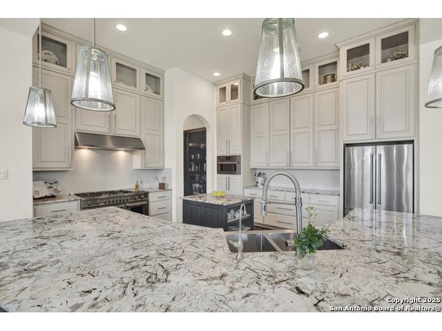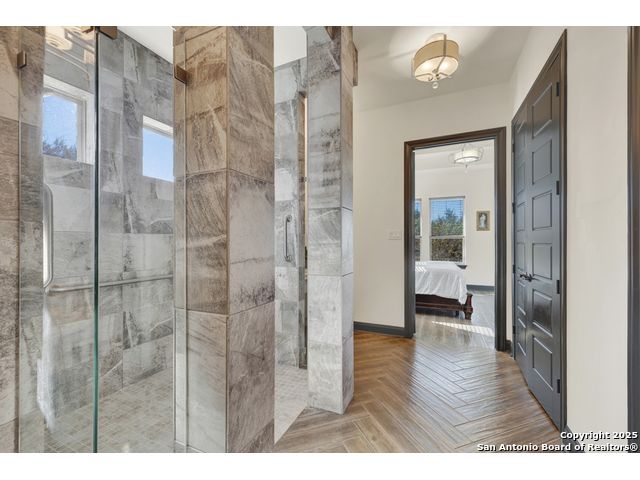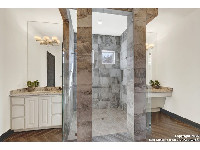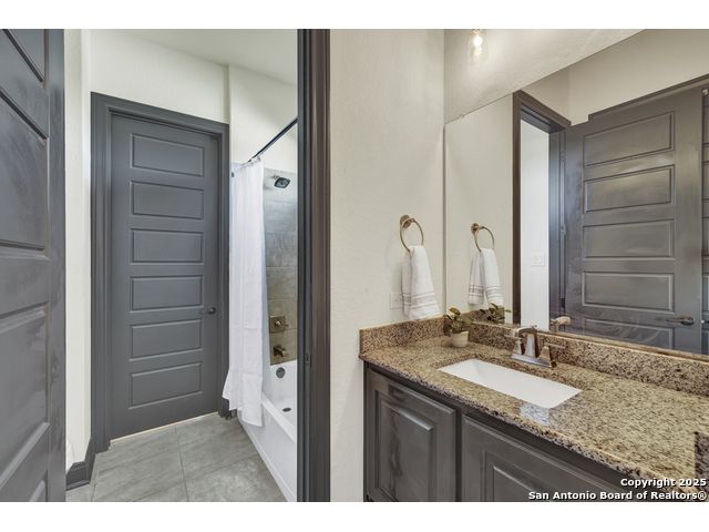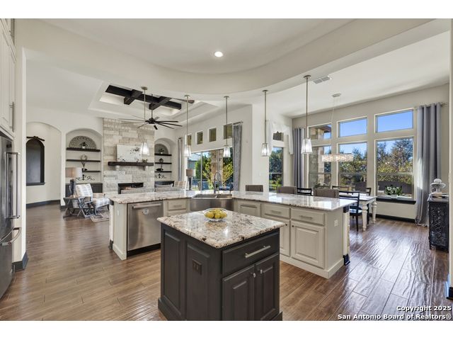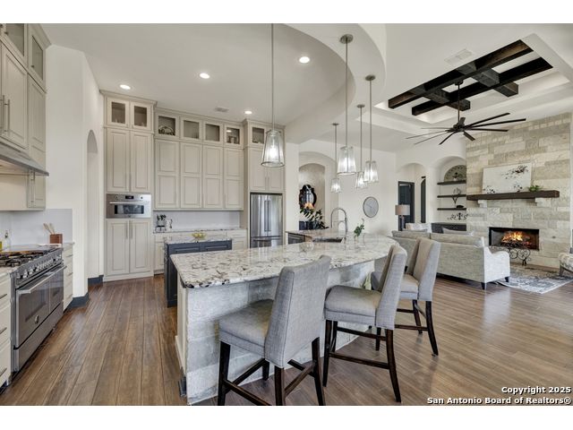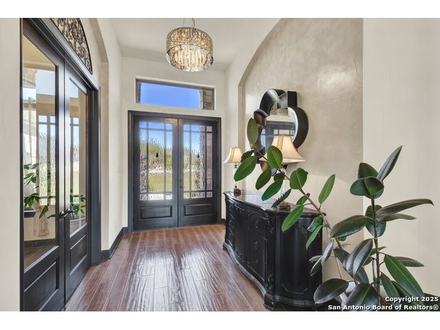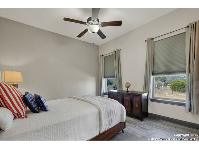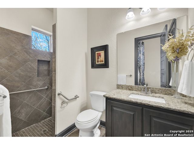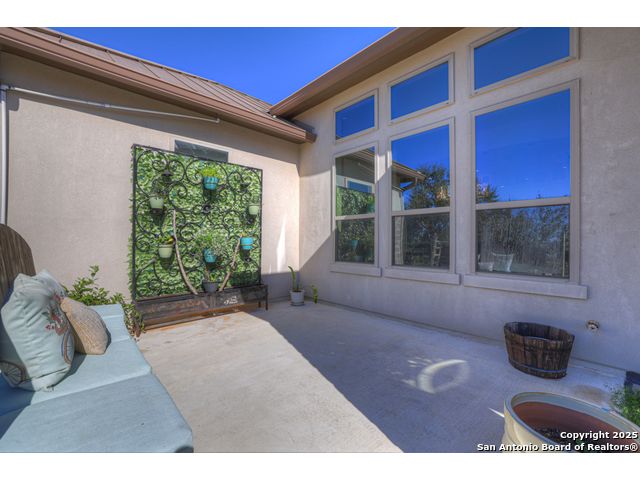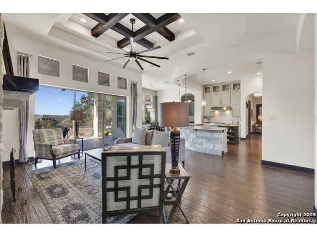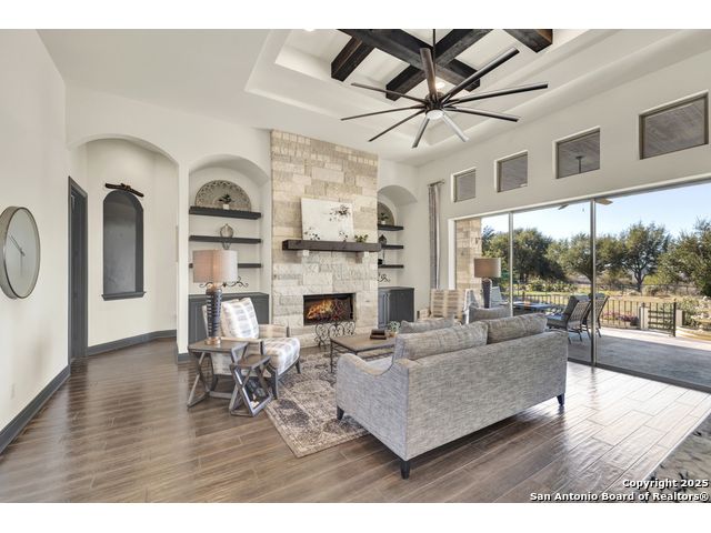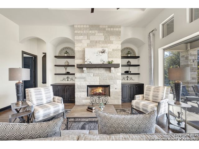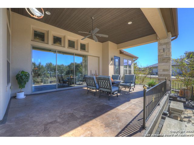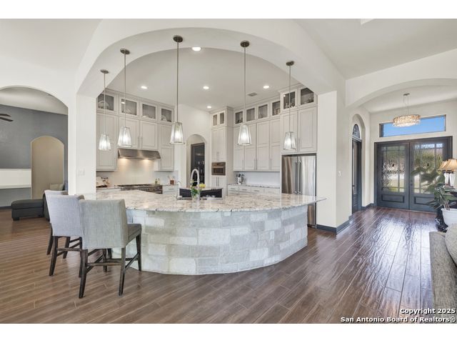 Fabulous 5 bedroom, 4.5 bath Custom Home Built by Vintage Estate Homes, perfectly located in the heart of the Texas Hill Country between Austin and San Antonio. Step through double doors from the inviting front patio leading into dramatic entry and striking study. Soaring ceilings and elegant recessed architectural details create a breathtaking first impression in this open concept living room. Cozy up to the wood burning fireplace or make your way to the chef inspired kitchen featuring stainless farmhouse sink, wrap around breakfast bar, additional prep and storage island, Italian stainless gas range with double ovens, large cooktop and cabinets that sprawl all the way to the ceiling. Large expansive windows flooding the space with natural light. Perfectly designed for both grand entertaining and comfortable daily living. Home offers split plan and privacy added for all parties. Flex space offered just tucked off kitchen area to use as a secondary living room, playroom, fitness studio or game room. Designed with universal accessibility in mind, this home offers seamless handicap-friendly features throughout-including doorways, halls, zero-threshold entries, and strategically placed grab bars and accessibility in the kitchen. The luxurious owner's retreat is a true sanctuary, complete with a spa-like ensuite bathroom featuring a zero-entry roll-in shower, dual vanities at comfortable heights, and additional safety and convenience enhancements - all while maintaining exceptional style and sophistication. Large, covered patio for your outdoor entertaining with elevated wide-range views off back. Fully fenced yard with mature trees scattered about the lot. Also situated on quiet cul-de-sac street. Live the resort lifestyle every day in this vibrant community offering an elegant clubhouse, 3 swimming pools, basketball courts, tennis courts, pickle ball courts, volleyball court, walking trails and a fitness center. Unparralled craftmanship, panoramic views and an endless flexibility make this one-of-a-kind residence a true Hill country Masterpiece!
