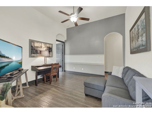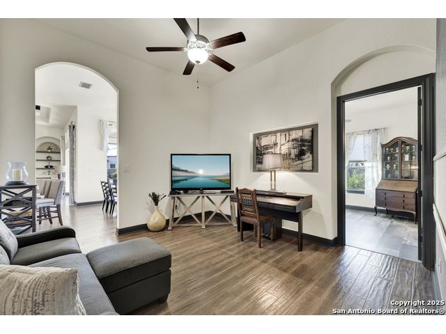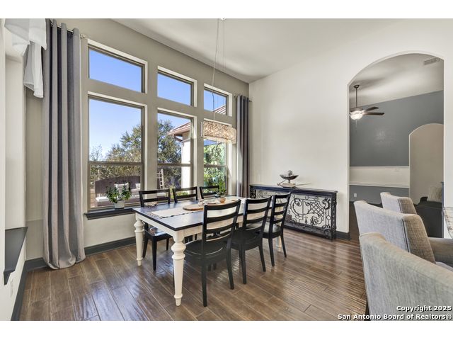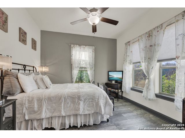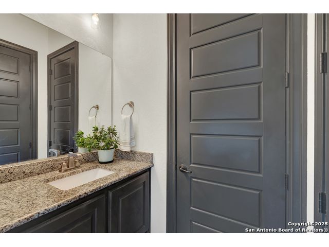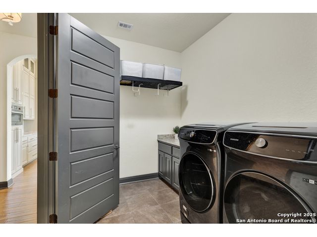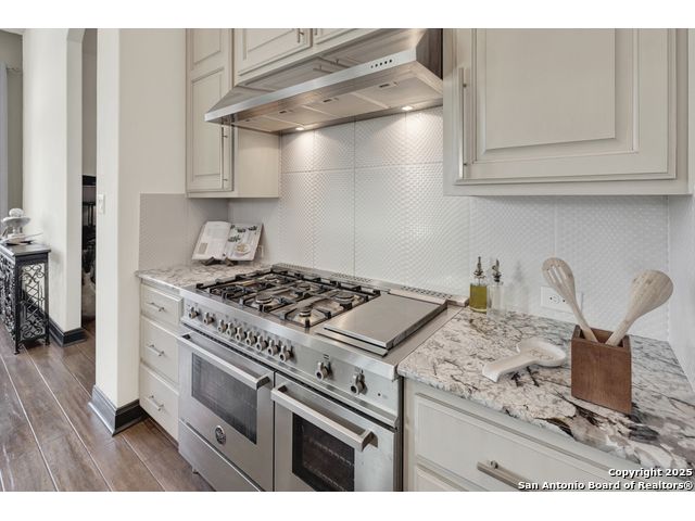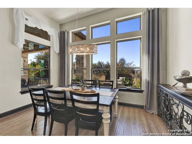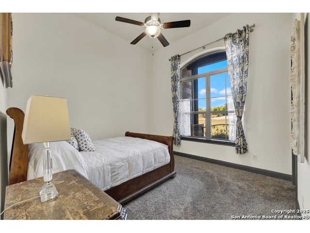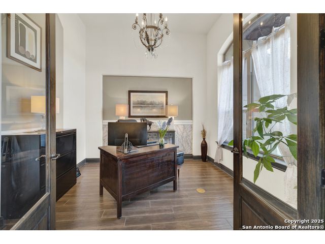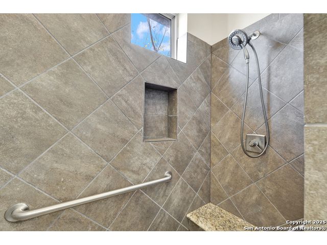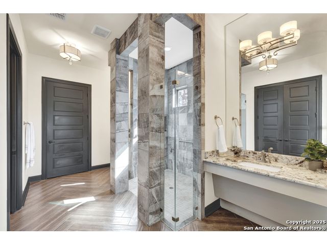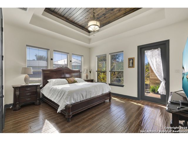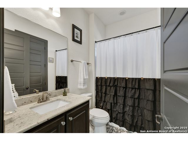 Fabulous 5 bedroom, 4.5 bath Custom Home Built by Vintage Estate Homes, perfectly located in the heart of the Texas Hill Country between Austin and San Antonio. Step through double doors from the inviting front patio leading into dramatic entry and striking study. Soaring ceilings and elegant recessed architectural details create a breathtaking first impression in this open concept living room. Cozy up to the wood burning fireplace or make your way to the chef inspired kitchen featuring stainless farmhouse sink, wrap around breakfast bar, additional prep and storage island, Italian stainless gas range with double ovens, large cooktop and cabinets that sprawl all the way to the ceiling. Large expansive windows flooding the space with natural light. Perfectly designed for both grand entertaining and comfortable daily living. Home offers split plan and privacy added for all parties. Flex space offered just tucked off kitchen area to use as a secondary living room, playroom, fitness studio or game room. Designed with universal accessibility in mind, this home offers seamless handicap-friendly features throughout-including doorways, halls, zero-threshold entries, and strategically placed grab bars and accessibility in the kitchen. The luxurious owner's retreat is a true sanctuary, complete with a spa-like ensuite bathroom featuring a zero-entry roll-in shower, dual vanities at comfortable heights, and additional safety and convenience enhancements - all while maintaining exceptional style and sophistication. Large, covered patio for your outdoor entertaining with elevated wide-range views off back. Fully fenced yard with mature trees scattered about the lot. Also situated on quiet cul-de-sac street. Live the resort lifestyle every day in this vibrant community offering an elegant clubhouse, 3 swimming pools, basketball courts, tennis courts, pickle ball courts, volleyball court, walking trails and a fitness center. Unparralled craftmanship, panoramic views and an endless flexibility make this one-of-a-kind residence a true Hill country Masterpiece!