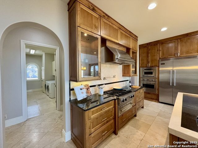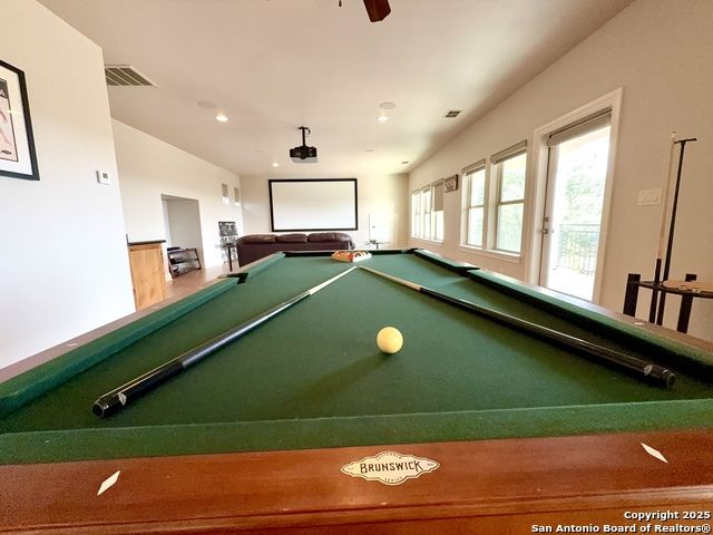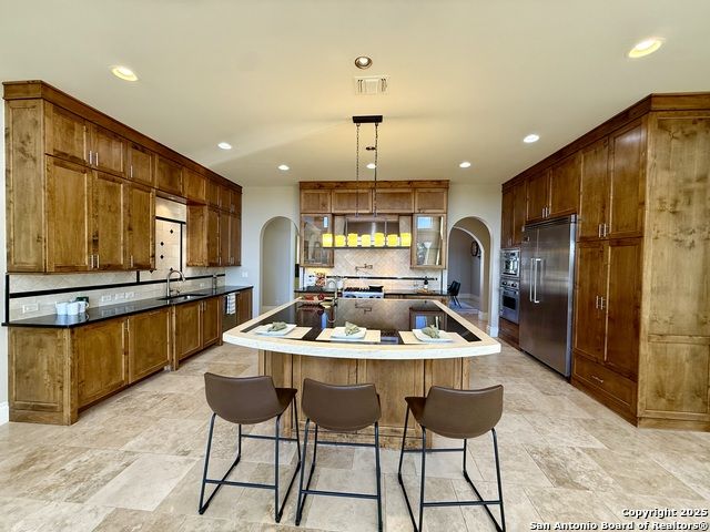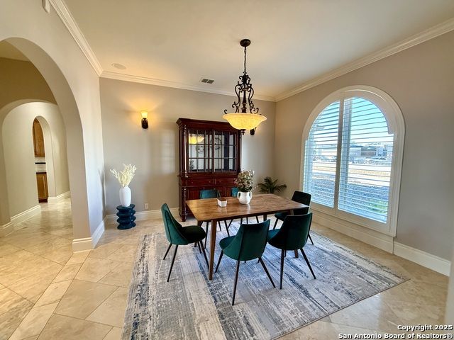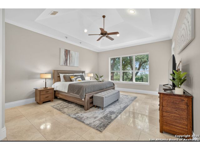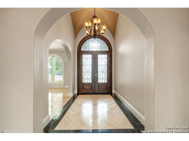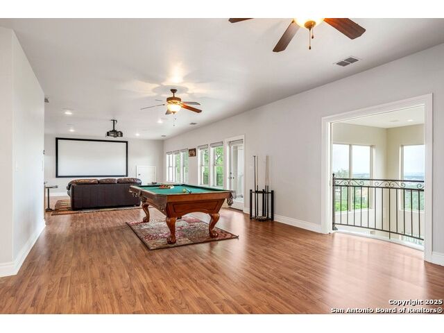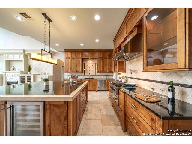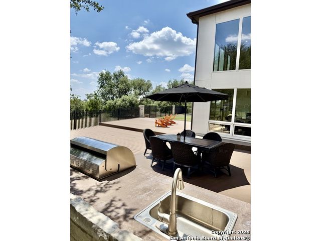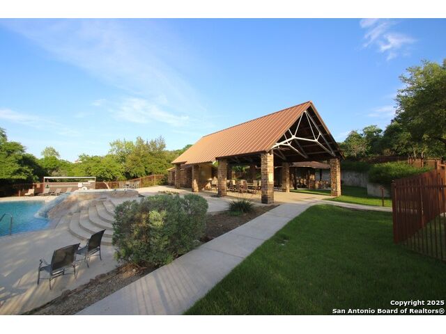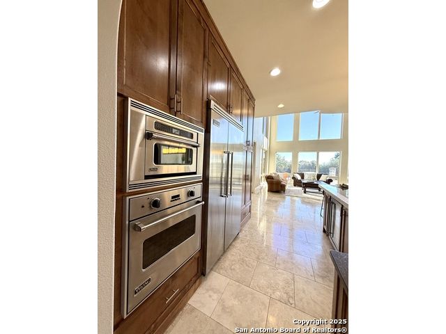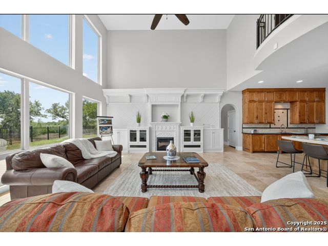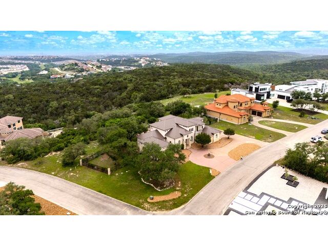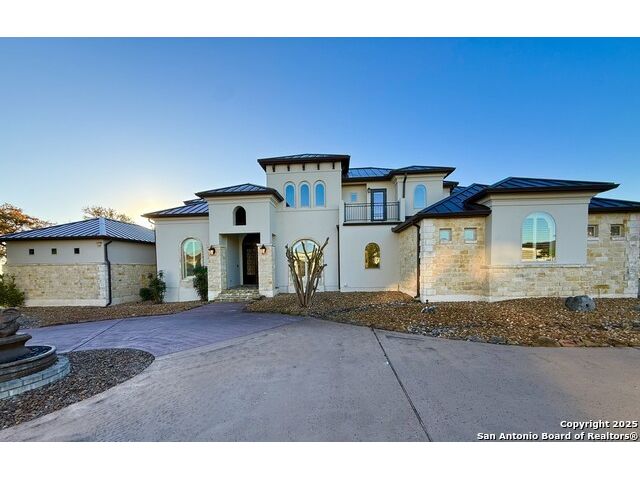 This distinctive estate is located in the scenic Texas Hill Country, where comfort and sophistication are seamlessly integrated. The property sits on a spacious 0.691-acre lot, providing elevated views of San Antonio and the beautiful surrounding landscape. The architectural design features an open floor plan, with ceiling heights ranging from ten to twenty feet, as well as large windows that allow for an abundance of natural light, travertine flooring, and elegantly arched doorways. At the core of the residence is a gourmet kitchen, which boasts a generous granite island and is equipped with high-end "Viking" appliances, custom wood cabinetry, a six-burner gas cooktop, a dedicated vegetable sink, dual-element induction cooking, and an integrated refrigerator, making it an ideal space for those who enjoy cooking. The home also includes two welcoming living areas and three dining areas, along with a study, a substantial exercise room, a media room, and a game room, providing plenty of options for relaxation and entertainment. The primary suite is thoughtfully designed for comfort, featuring a spacious bedroom complete with a walk-in closet and a luxurious bathroom that offers a Jacuzzi tub and a multi-head shower. In addition, there are two secondary bedrooms located on the first floor and two more on the upper level. The property further enhances outdoor living with a rear deck that includes an outdoor kitchen, creating an excellent setting for al fresco dining while enjoying the tranquil environment. The surrounding neighborhood is well-equipped with amenities, such as walking trails, a pavilion, sports courts, a swimming pool, and a basketball court. This home is move-in ready and presents a harmonious blend of convenience, breathtaking views, and luxurious living.