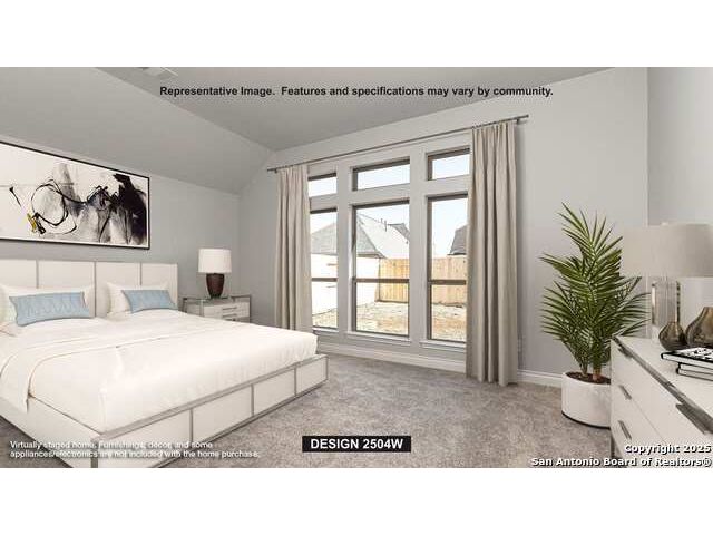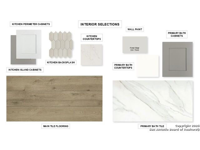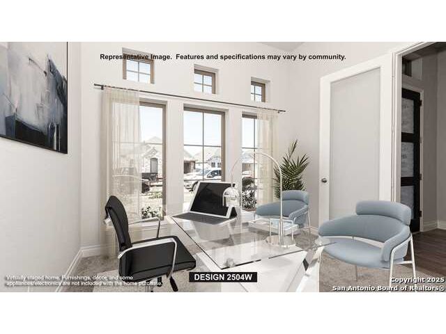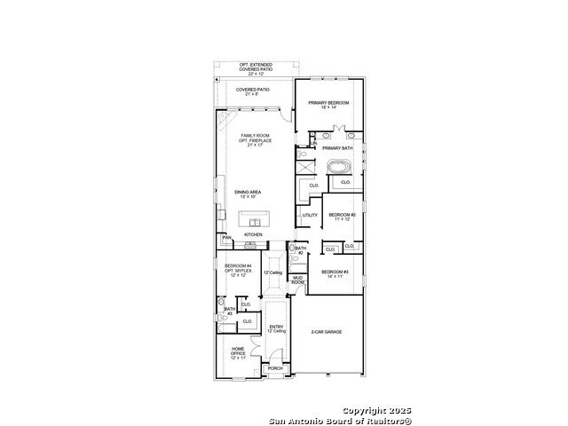 Home office with French doors set at entry with 12-foot ceiling. Extended entry leads to open kitchen, dining area and family room. Kitchen features corner walk-in pantry, a 5-burner gas cooktop, generous counter space and island with built-in seating space. Dining area flows into family room with wall of windows. Primary suite includes double-door entry to primary bath with dual vanities, garden tub, separate glass-enclosed shower and two large walk-in closets. A guest suite with private bath adds to this spacious one-story home. Extended covered backyard patio and a 5-zone sprinkler system. Mud room off two-car garage.