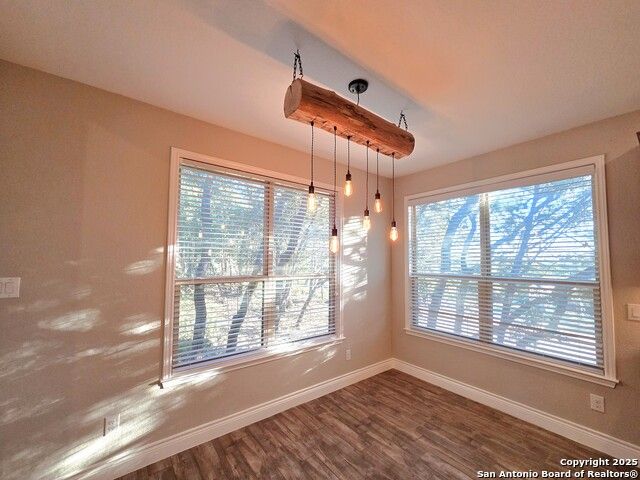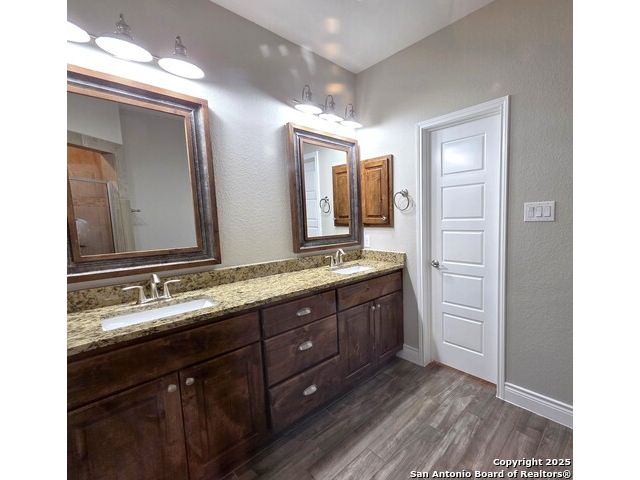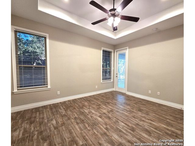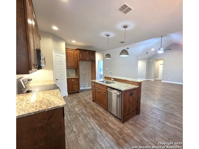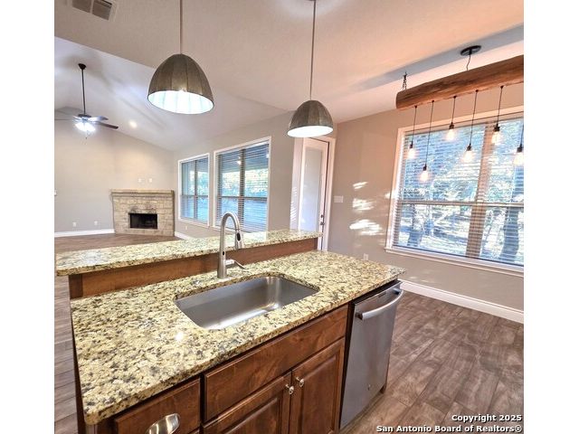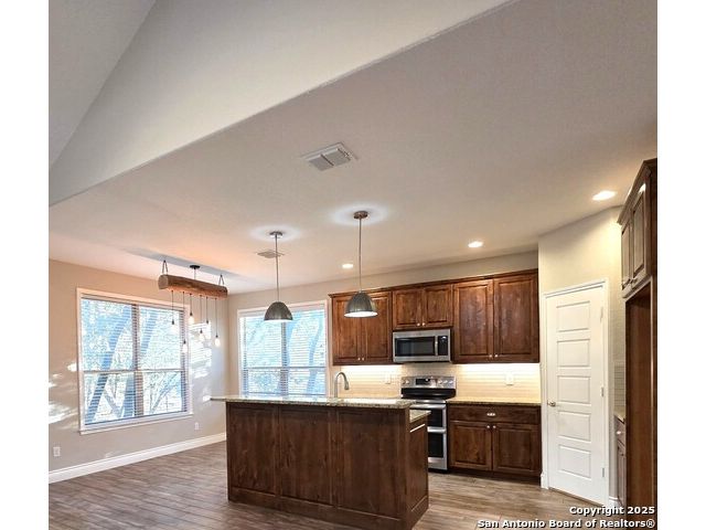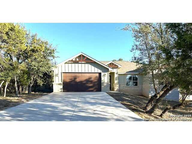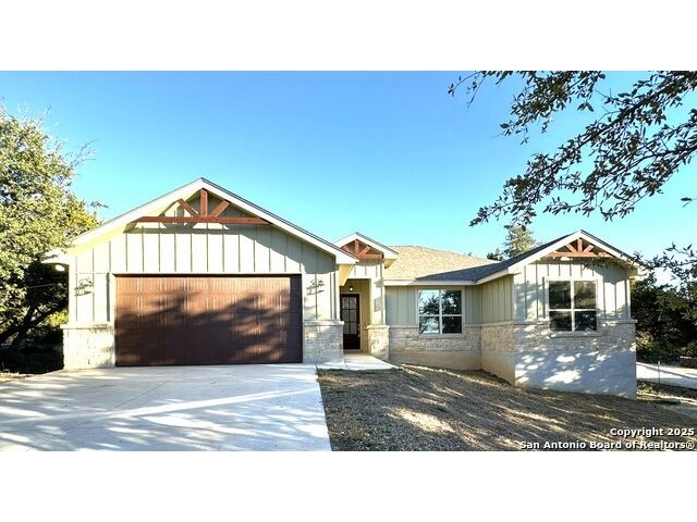 Gorgeous hill country home built in 2019 on nearly 3/4 acre. Island kitchen features stainless appliances, tile backsplash and a breakfast bar. Granite counters throughout home. High ceilings. Inviting wood-burning fireplace. Faux wood tile floors throughout home. 2 inch blinds are included. Open floor plan. Concrete driveway to the oversized garage. Architectural shingle roof. Mature trees. Covered patio. Neighborhood offers a pool, clubhouse, park, and pavilion.