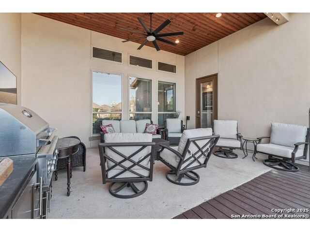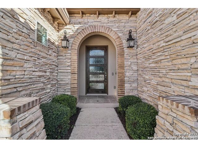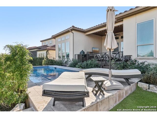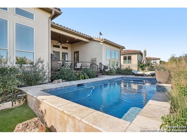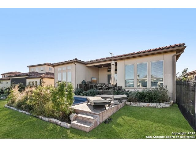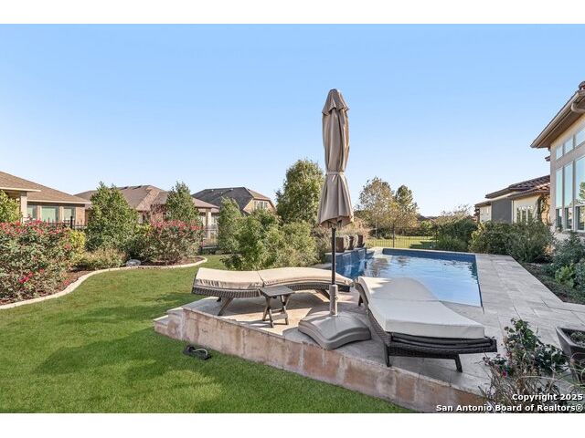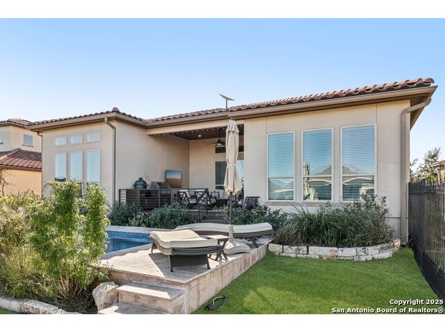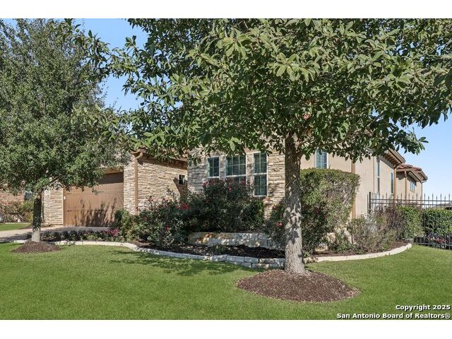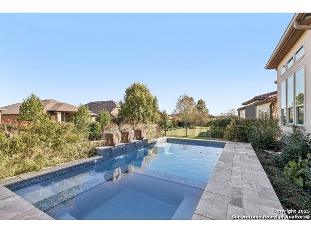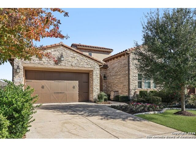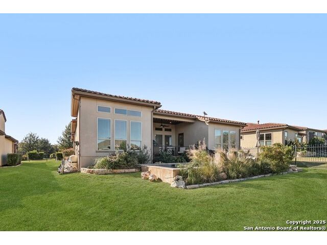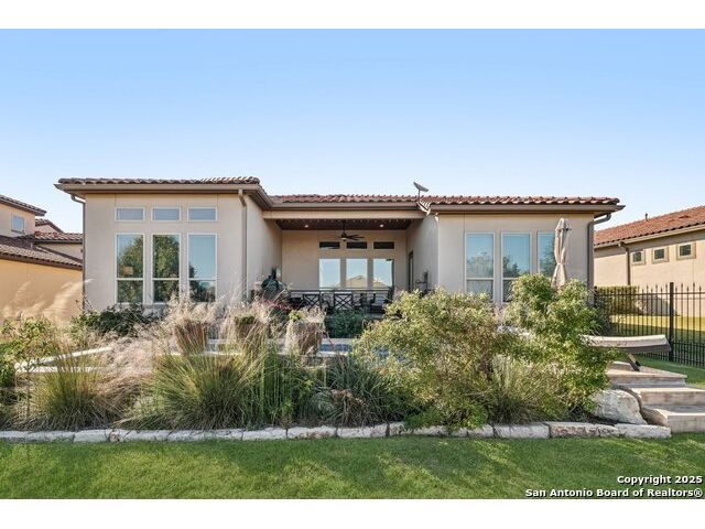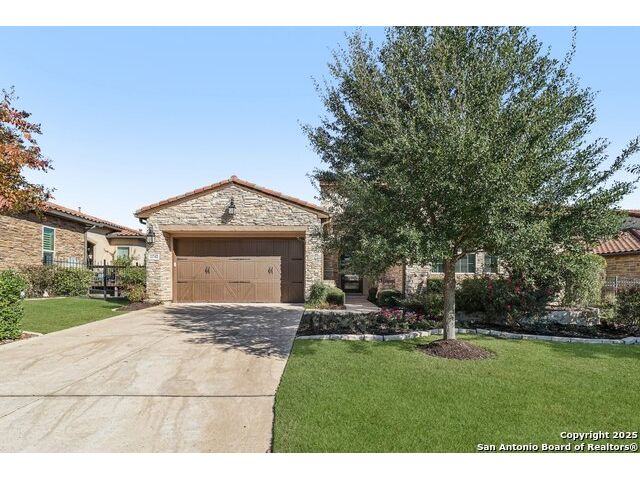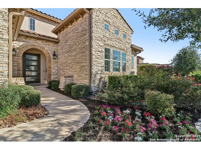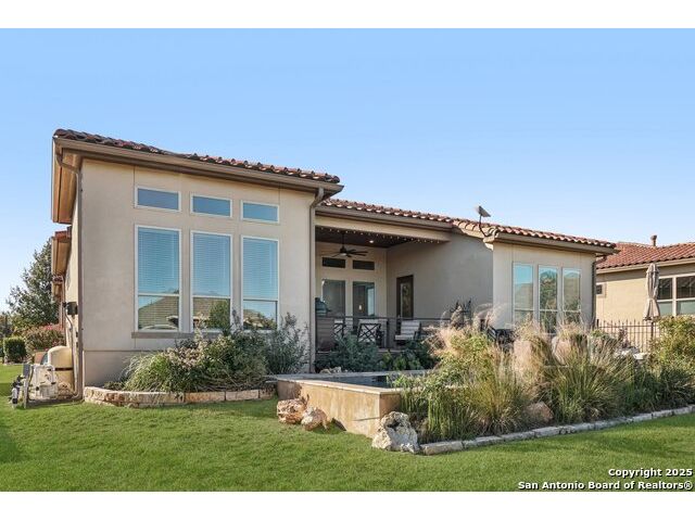 Single-story Sitterle garden home located in the gated Campanas at Cibolo Canyons community. This open-concept residence includes 3 bedrooms, 3.5 bathrooms, and a private study, designed for efficient single-level living. The kitchen features granite countertops, gas cooking, double ovens, and ample cabinet storage. The primary suite offers a spa-style bathroom with a separate shower, a garden tub, and dual vanities. Living areas include abundant windows for natural light and a gas fireplace. Outdoor living spaces include a patio, courtyard, and a covered patio overlooking an in-ground heated pool and spa. Community amenities include a clubhouse, fitness center, and three community pools, with convenient proximity to shopping, dining, and golf.
