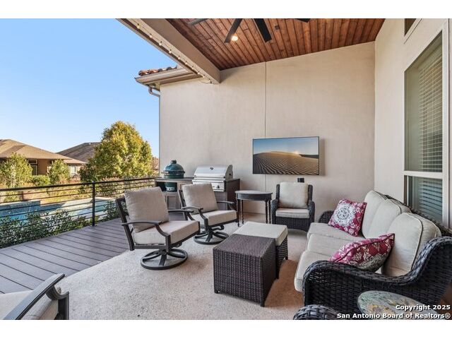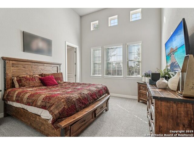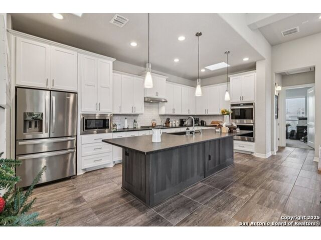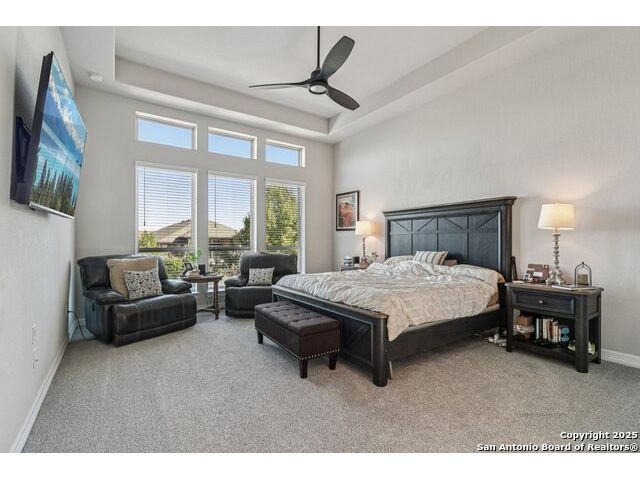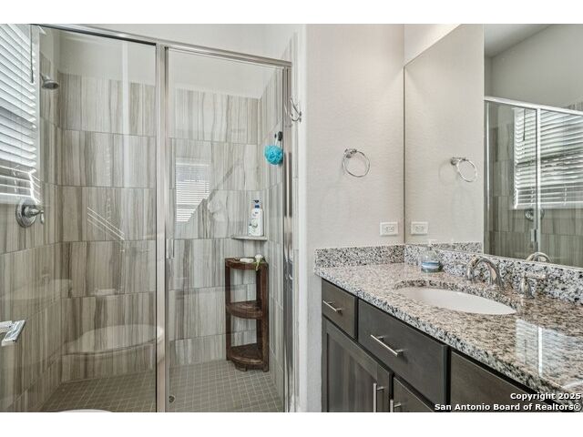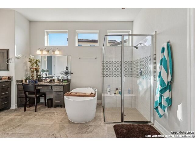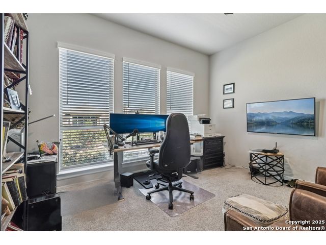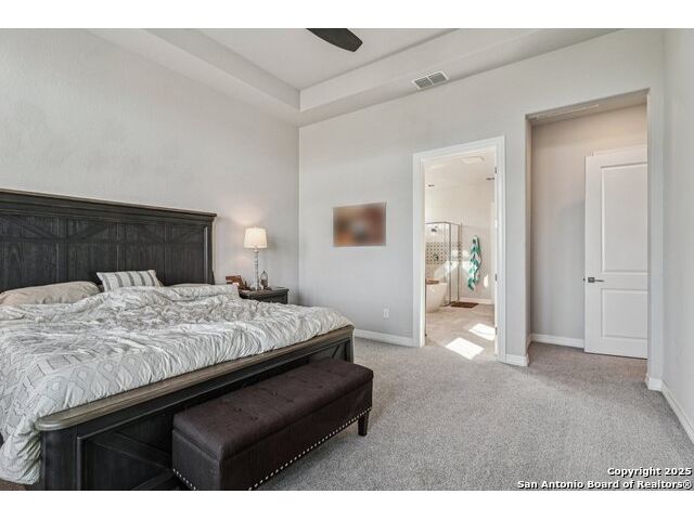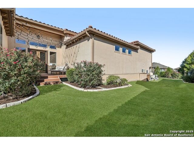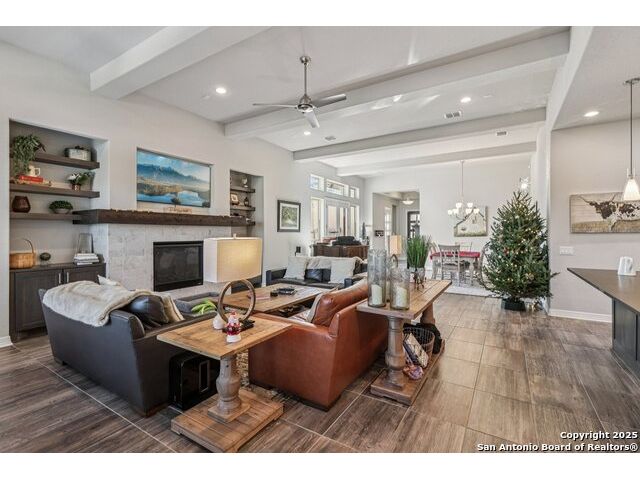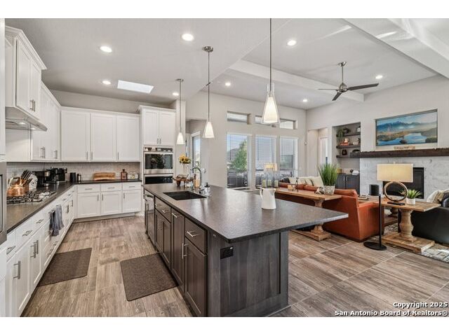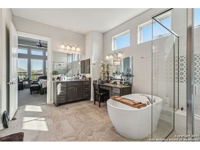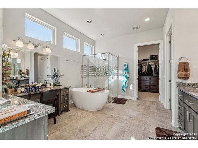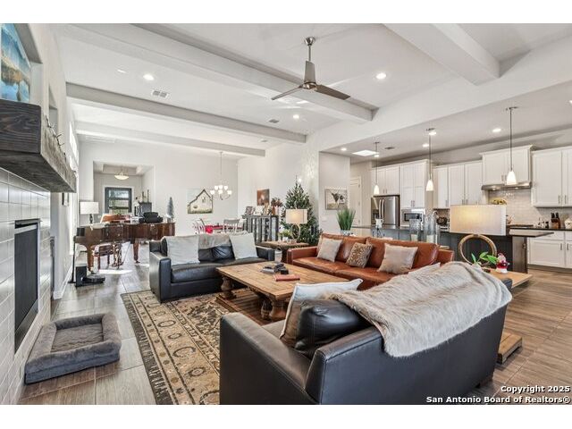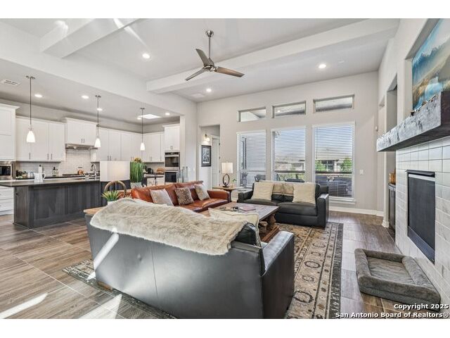 Single-story Sitterle garden home located in the gated Campanas at Cibolo Canyons community. This open-concept residence includes 3 bedrooms, 3.5 bathrooms, and a private study, designed for efficient single-level living. The kitchen features granite countertops, gas cooking, double ovens, and ample cabinet storage. The primary suite offers a spa-style bathroom with a separate shower, a garden tub, and dual vanities. Living areas include abundant windows for natural light and a gas fireplace. Outdoor living spaces include a patio, courtyard, and a covered patio overlooking an in-ground heated pool and spa. Community amenities include a clubhouse, fitness center, and three community pools, with convenient proximity to shopping, dining, and golf.