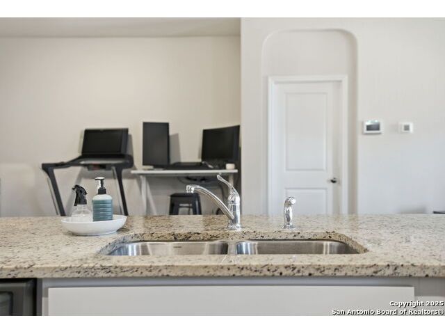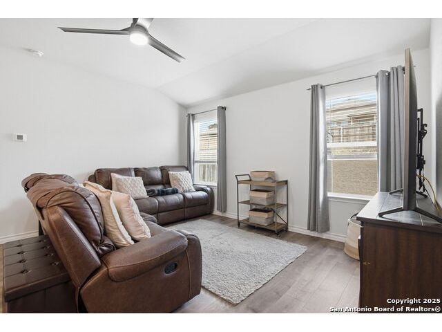 Welcome to this beautifully maintained, single-story home offering 3 bedrooms, 2 bathrooms, and a two-car garage. The welcoming entry opens into a spacious dining area that flows seamlessly into the open-concept kitchen and living room-perfect for everyday living and entertaining. The kitchen features granite countertops, stainless steel appliances, a gas range, subway tile backsplash, and generous cabinet storage, all overlooking a bright living area filled with natural light. The private primary suite is tucked away for added comfort and includes a double vanity, separate soaking tub and walk-in shower, private water closet, and a large walk-in closet. Secondary bedrooms, a full guest bath, and a utility room are conveniently located near the front of the home. Additional highlights include 9-foot ceilings, luxury vinyl plank flooring in the main living areas, ceramic tile in bathrooms and utility room, 2-inch faux wood blinds throughout, and a pre-plumbed water softener loop. Step outside to a covered patio, full yard landscaping, and full irrigation, creating an ideal space to relax or entertain outdoors. Short drive to Lackland AFB, Minutes from the Dove Creek shopping center. Currently Zoned for Medina Valley Schools. Schedule your tour today.