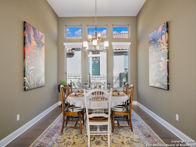 Beautifully appointed stacked stone and stucco home ideally positioned with green space directly in front offering privacy. A striking double-door entry with privacy glass welcomes you inside to soaring 10-12 foot ceilings and warm wood flooring throughout the main living areas, kitchen, and study. Bedrooms offer plush carpet, while baths and the laundry room feature durable tile. Secondary bedrooms include generously sized closets, and a thoughtfully designed split guest suite enjoys privacy with an adjacent full bath. The open-concept living and kitchen area is perfect for both everyday living and entertaining. The chef's kitchen showcases upgraded KitchenAid appliances, including double ovens, microwave, and a 6-burner gas cooktop, complemented by elegant quartz countertops and a spacious center island with breakfast bar. The living room fireplace frames tranquil backyard views, creating a cozy yet refined gathering space. The primary suite is a true retreat, complete with a sitting area, dual closets, separate vanities, a soaking tub, and a walk-in shower. Storage abounds throughout the home, enhanced by custom shelving and smart design. Modern conveniences include Google Nest, Google doorbell, keyless WiFi-enabled back door entry, automatic lighting in the primary walk-in closets, and smart functionality in the laundry room and walk-in pantry. Step outside to a covered patio overlooking a thoughtfully designed backyard sanctuary that backs to a peaceful green space. A winding crushed-granite pathway meanders through mature plantings and a flourishing garden featuring peach, persimmon, plum, apricot, lemon, avocado, and banana trees. A back gate provides direct access to the community jogging and walking path, seamlessly blending indoor and outdoor living. Energy-efficient features include front and backyard drip irrigation, dedicated single-line drip systems for backyard plants, and an on-demand hot water heater-offering both sustainability and comfort. Residents enjoy exceptional neighborhood amenities, with the HOA providing both front and back lawn maintenance for effortless living. A private clubhouse features a resort-style pool, fitness center, tennis courts, and pickleball courts, along with access to two additional amenity centers within Cibolo Canyons. Several miles of walking paths and nature trails complete the lifestyle, offering endless opportunities for recreation and relaxation.