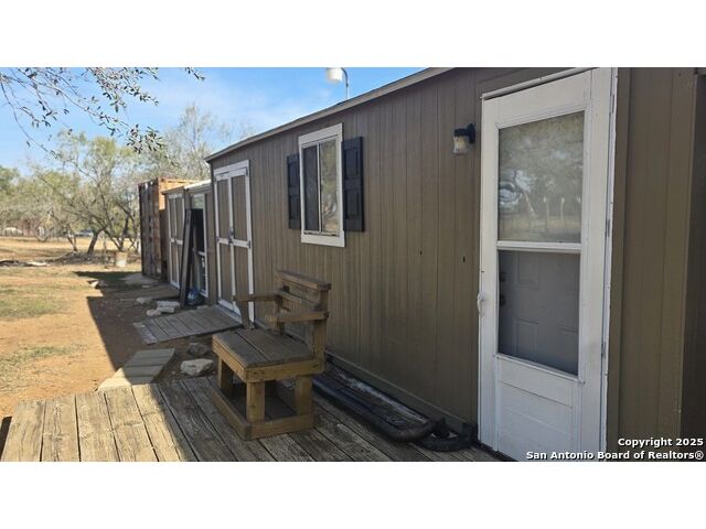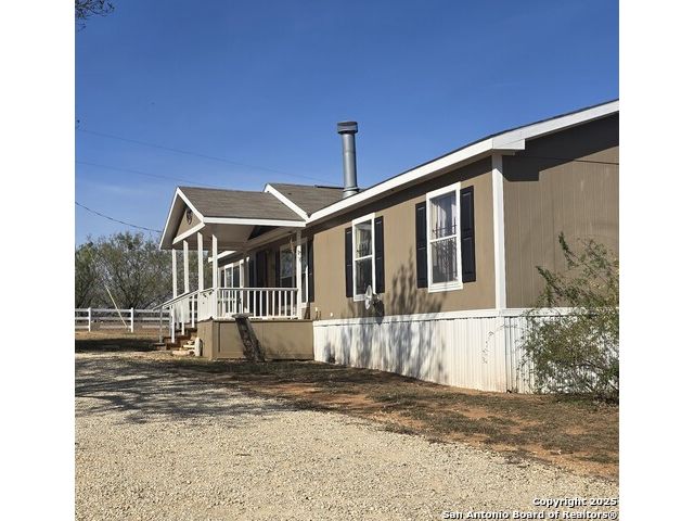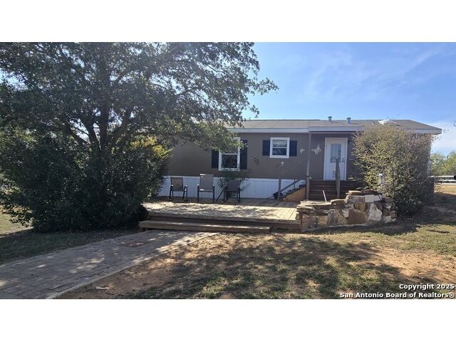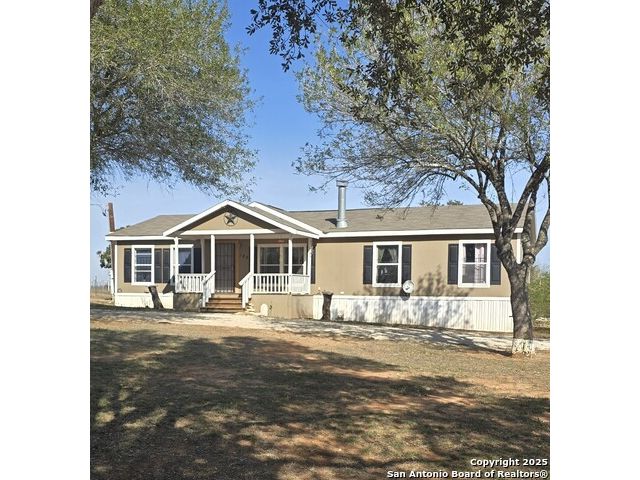 COUNTRY HOME SEEKERS-This immaculate 2006 Clayton manufactured home is situated on 2.075 acres in the fast growing Floresville, TX. Nestled at the end of a culde-de-sac, this property offers a spacious 1474 sq ft layout featuring 4 bedrooms and 2 bathrooms. The inviting living room includes a cozy electric fireplace, and the kitchen boasts an island with ample cabinet space for storage. Step outside to discover country living at its finest. There is a singled carport that leads to a office/study/workshop equipped with water and electricity. The property also includes to additional storage sheds measuring 6'x14 and 8'x11, plus and another open air structure.