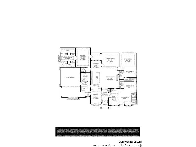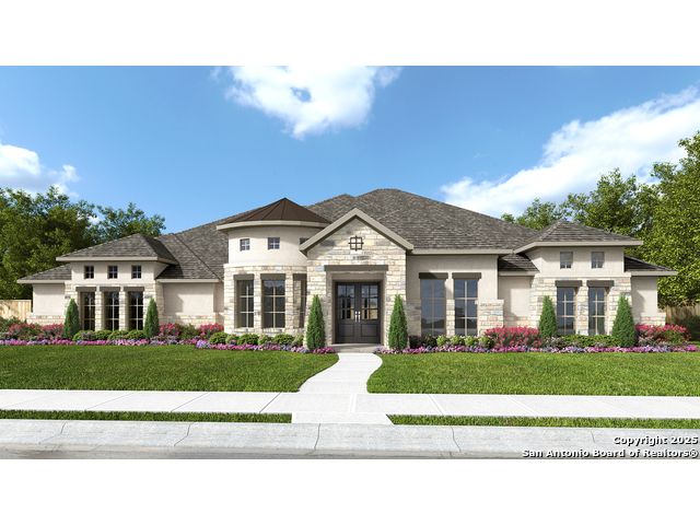 Double front doors open into a grand entryway that is embraced by a formal dining room which boasts a curved wall of windows and a private home office with French doors. The large family room boasts a warming wood mantel fireplace and a sliding glass door. The connecting kitchen features an island with built-in seating, large walk-in pantry, a double wall oven, and a butler's pantry leading to the dining room. The morning area provides ample natural light and offers access to the backyard covered patio. The primary bedroom boasts an extended tray ceiling and wall of windows. Double doors lead into the bathroom which highlights a garden tub, dual vanities, a glass enclosed shower, and two walk-in closets. The three secondary bedrooms each feature a walk-in closet and private bathroom. The game room offers an additional space for entertainment. The mud room is off the three-car garage.